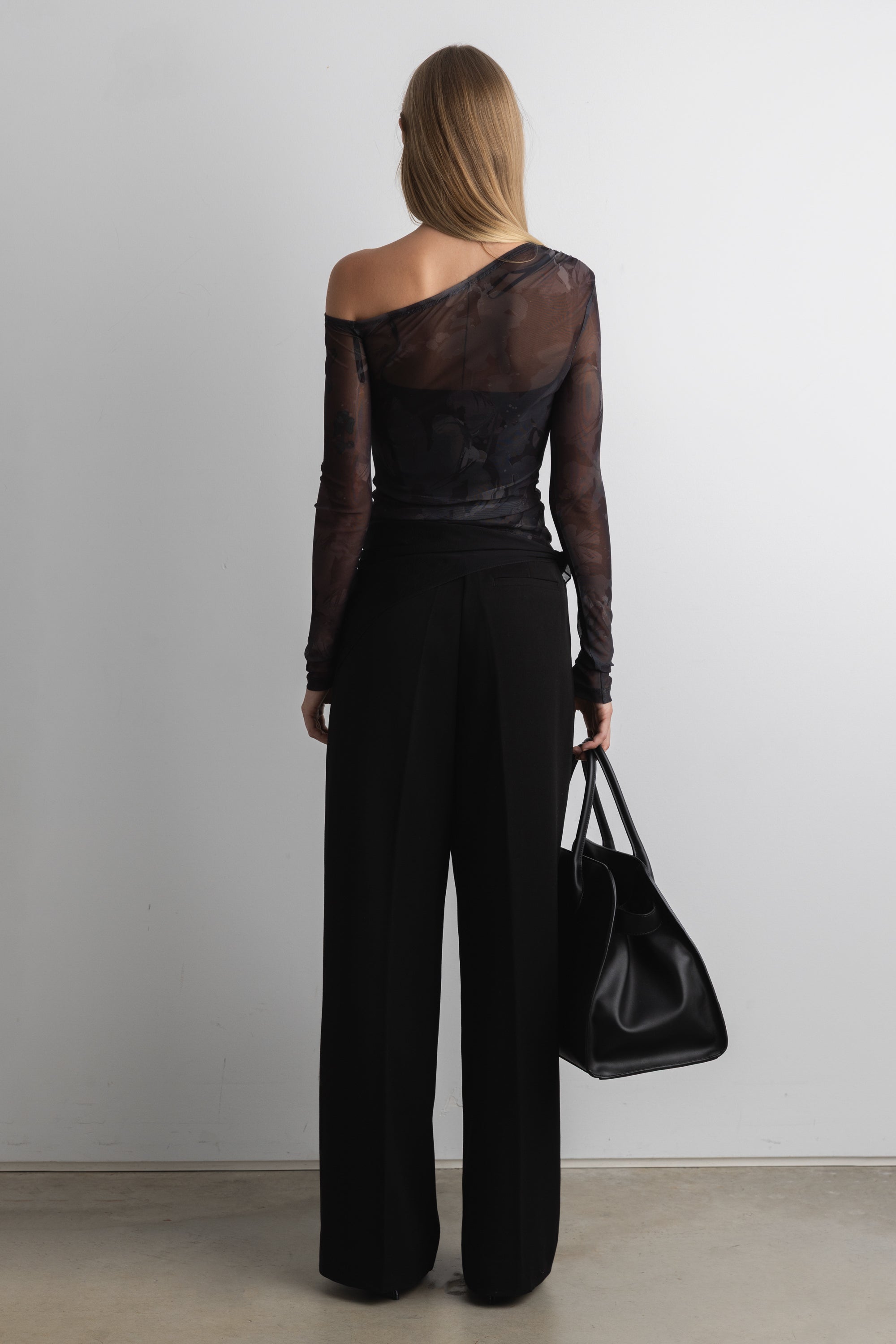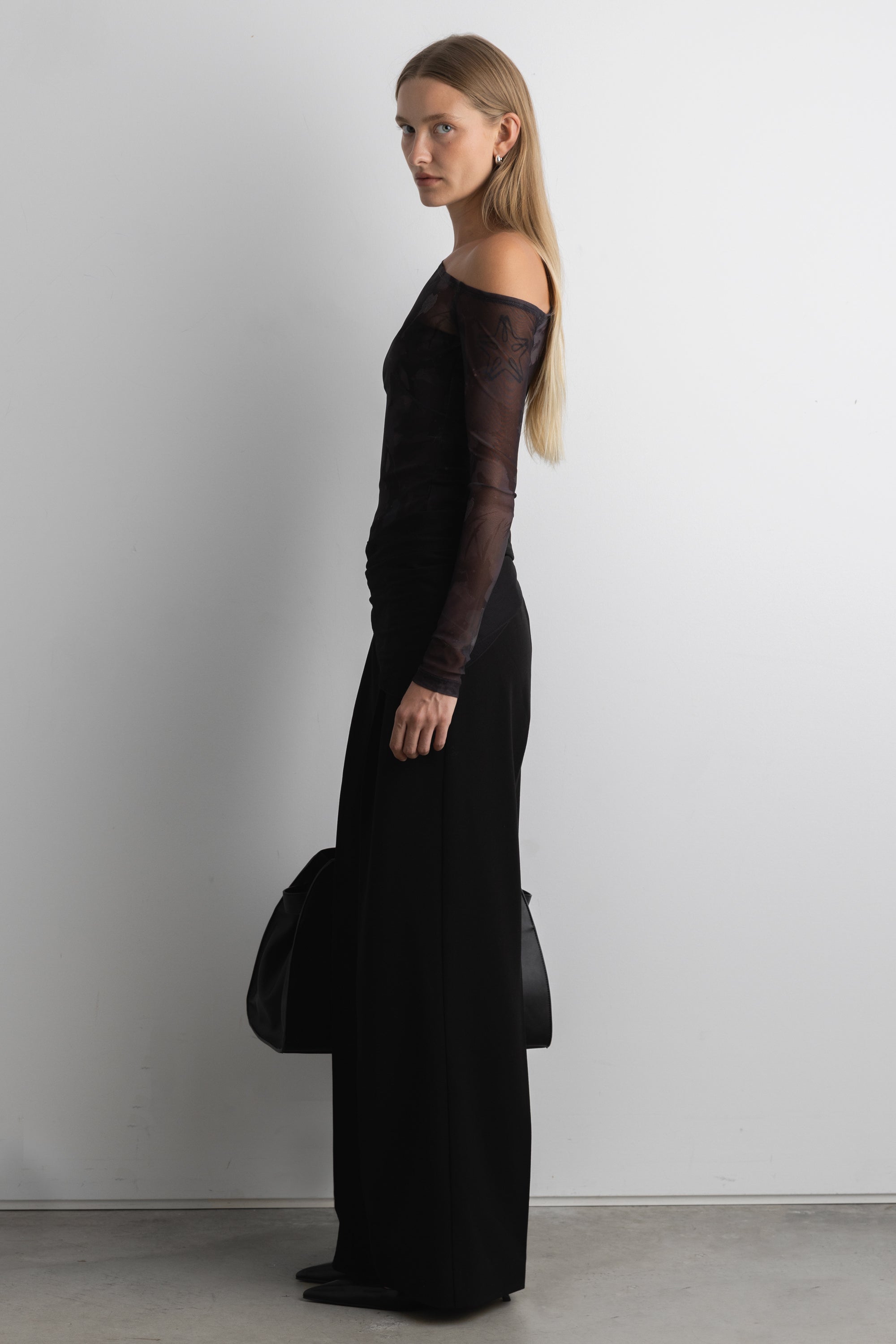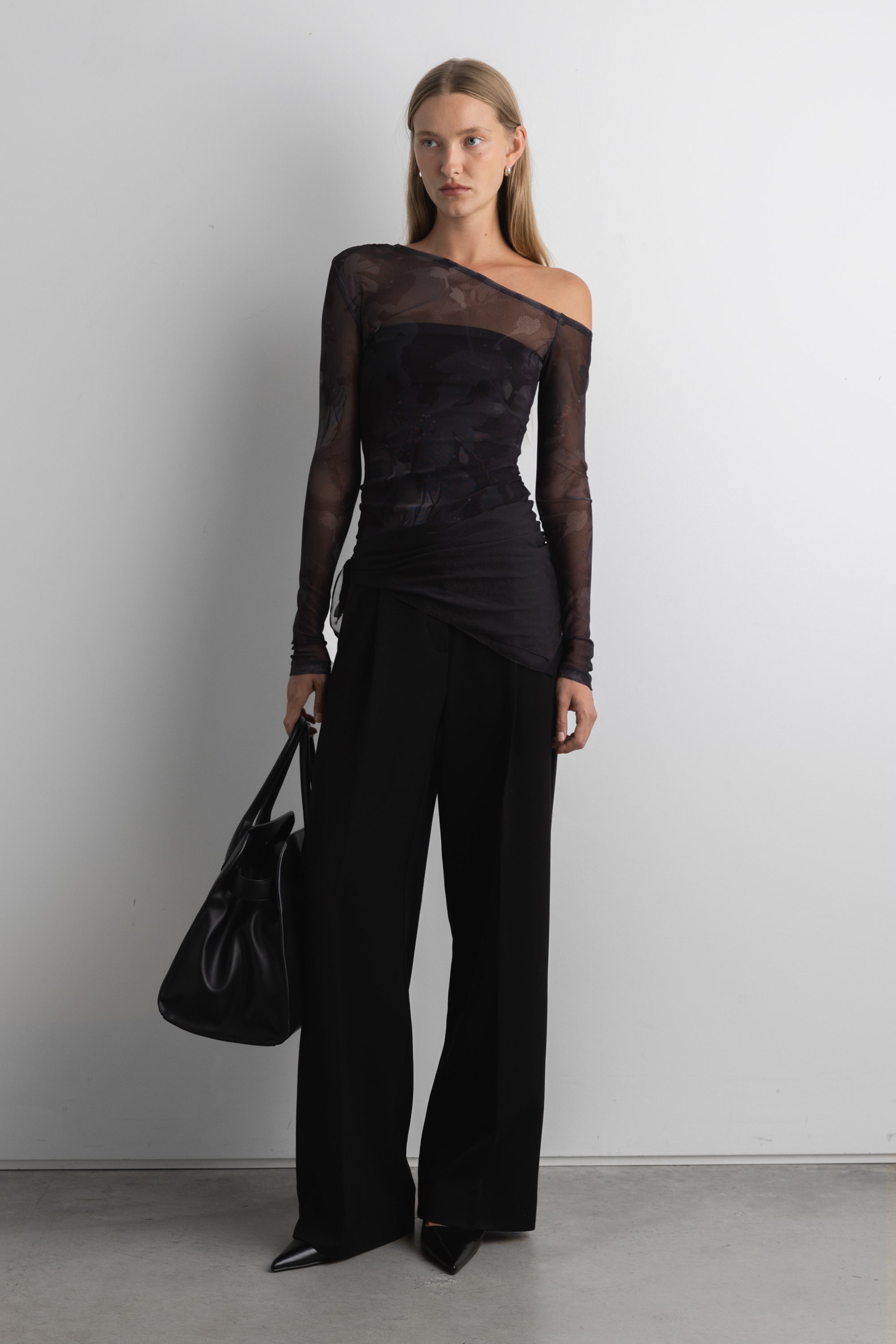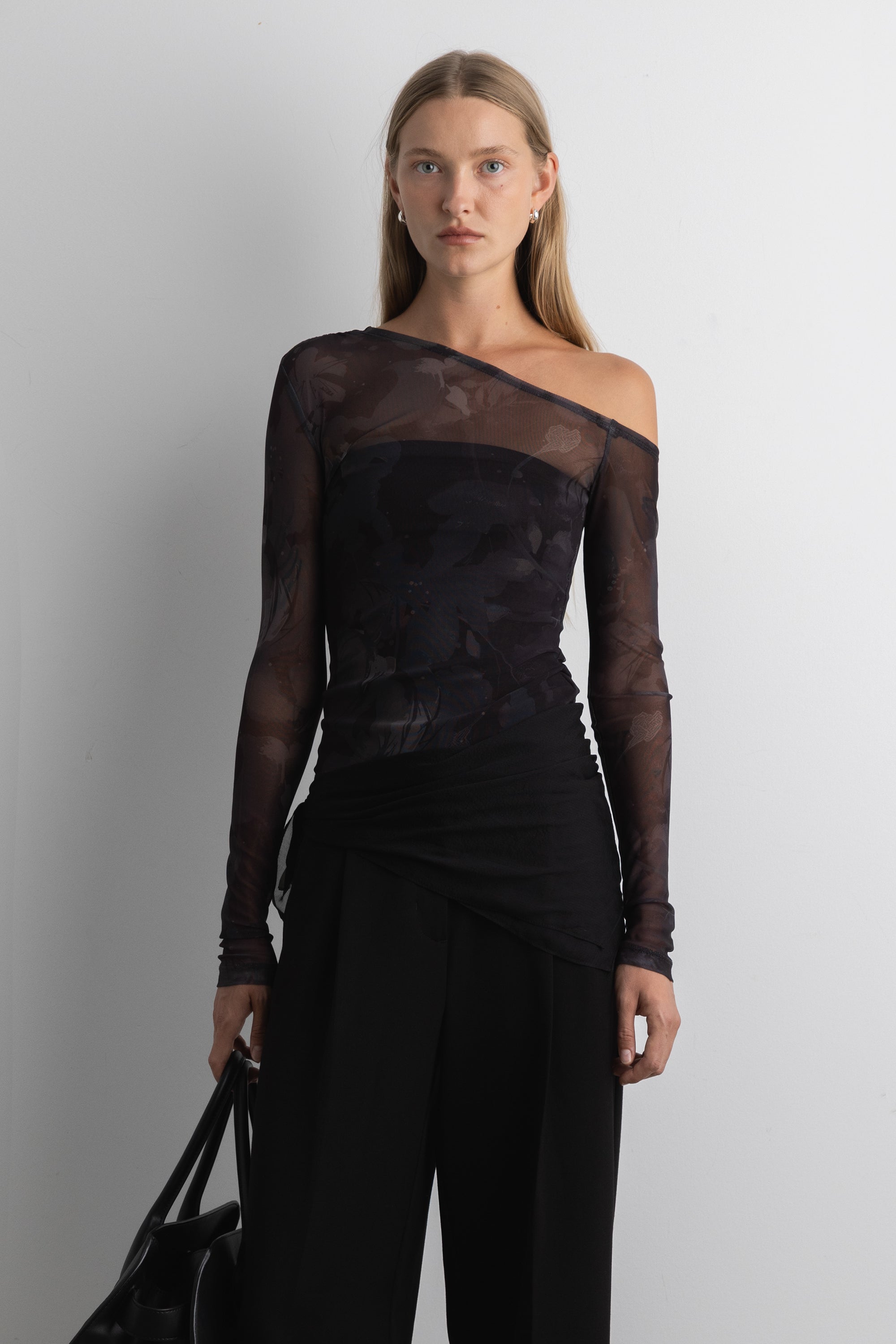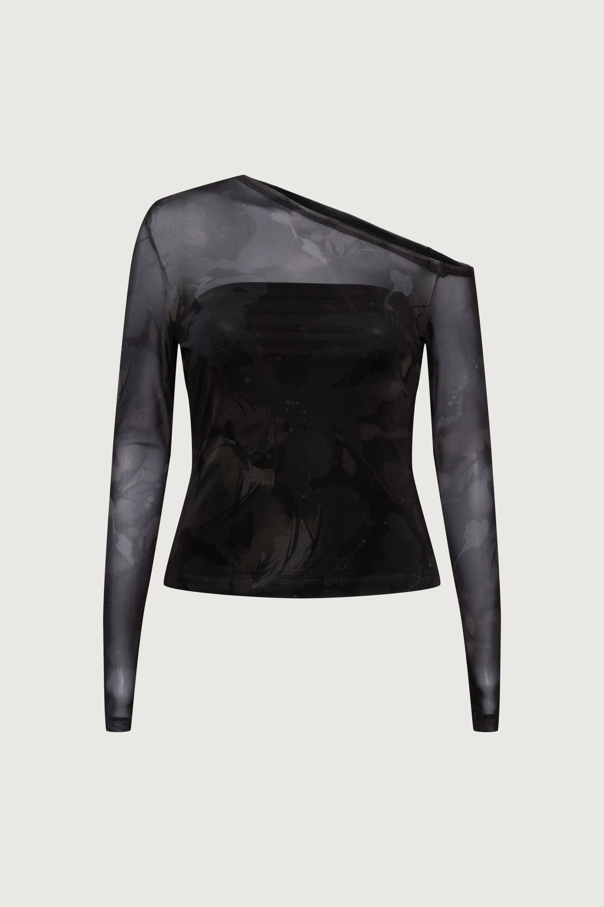 Floral print mesh. Asymmetric off shoulder design. Tube top layer.