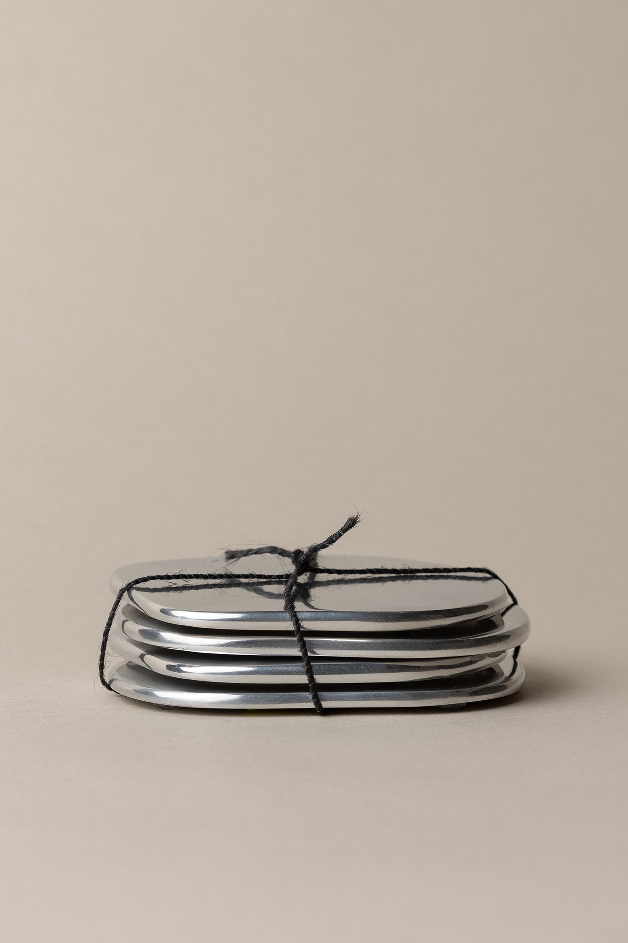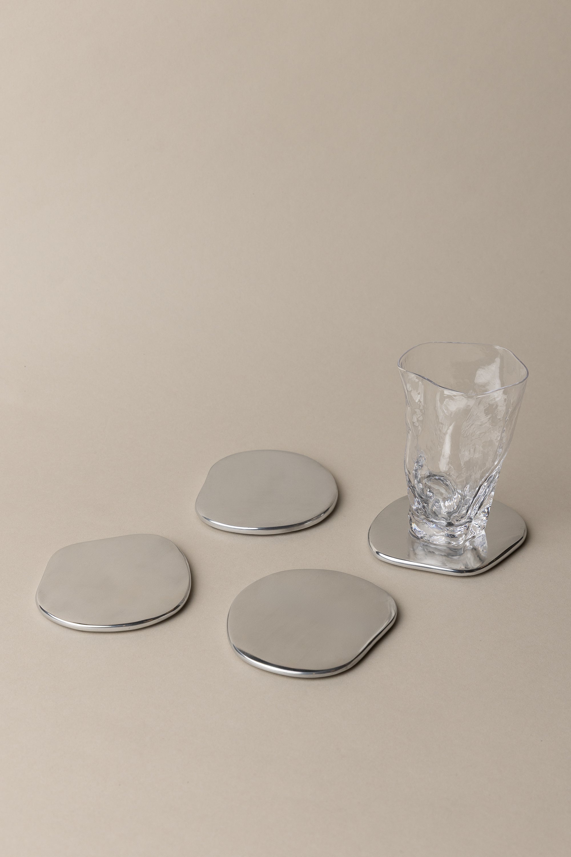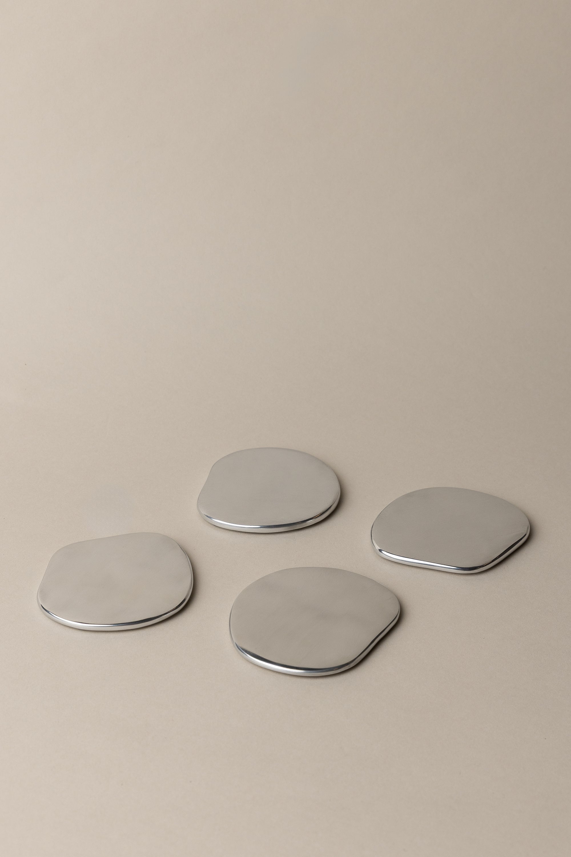 A sculptural set of coasters in fluid, organic forms. Cast in sleek aluminum and polished to a smooth, reflective finish, each piece captures a balance of modern refinement and artisanal touch. The irregular silhouettes evoke a sense of movement and individuality, transforming a functional tabletop accent into a subtle design statement. Sold as a set of four.