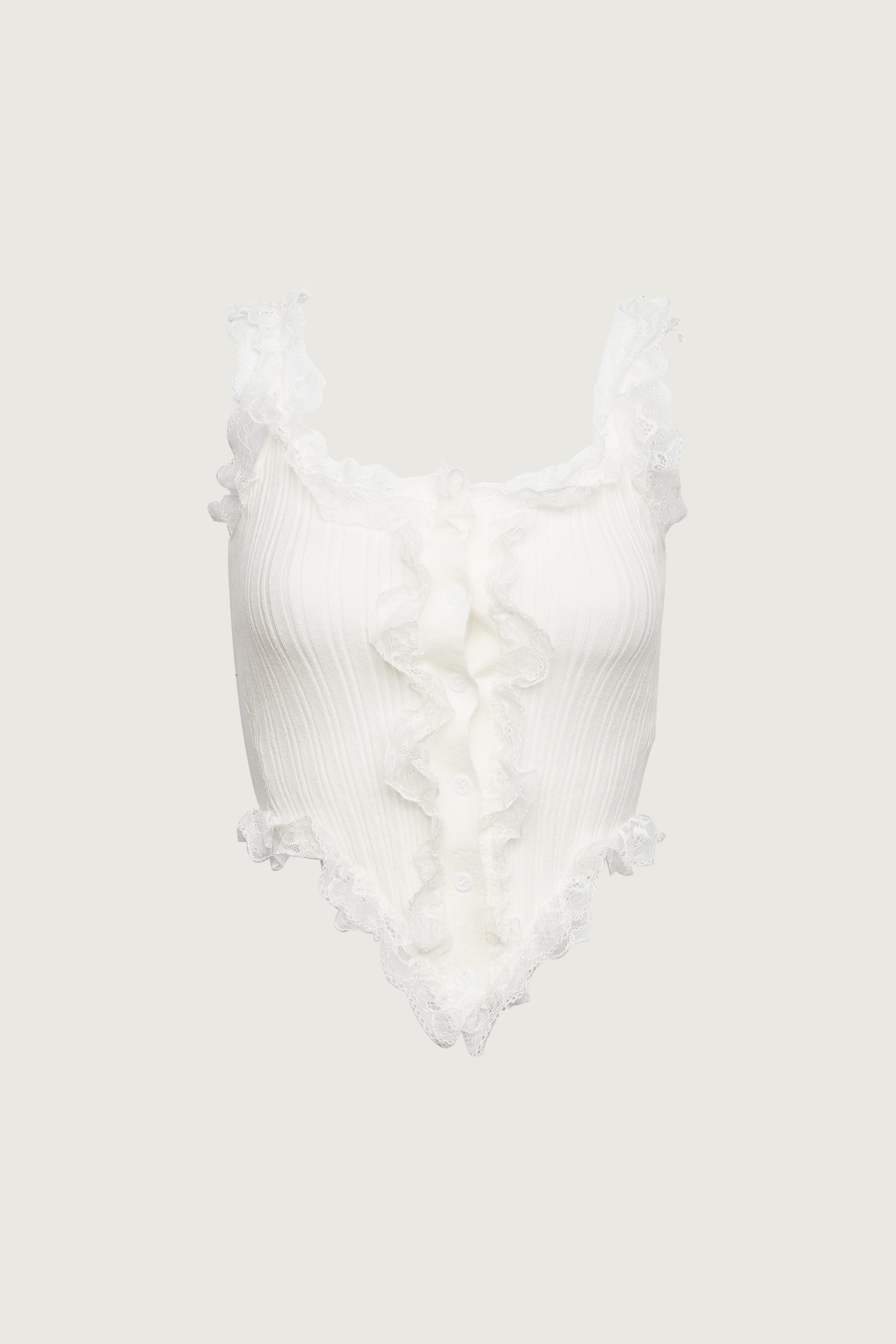 This rib-knit tank top is made in a comfortable, body-hugging fit and features a button front design and is finished with lace trims along the front, neckline and hem to highlight the corset inspired silhouette.