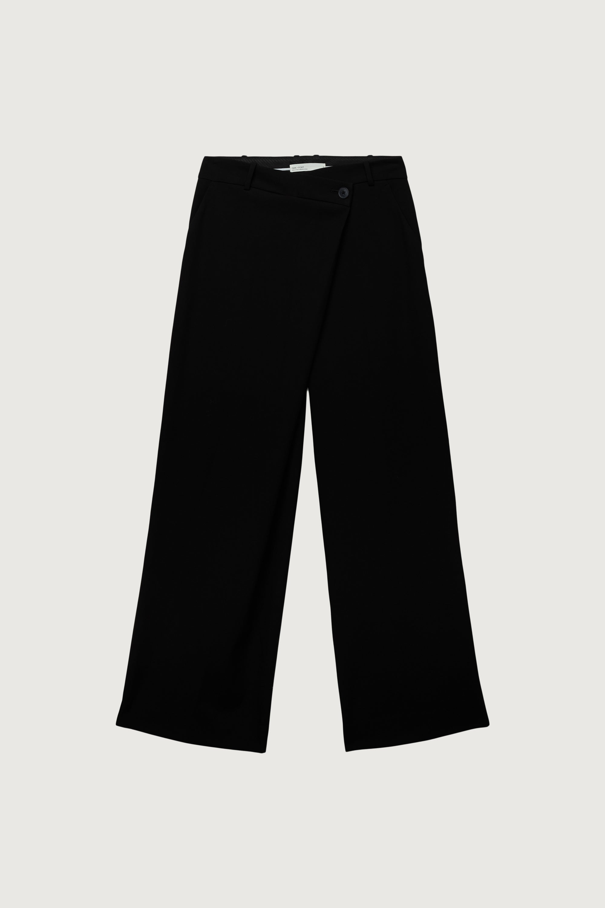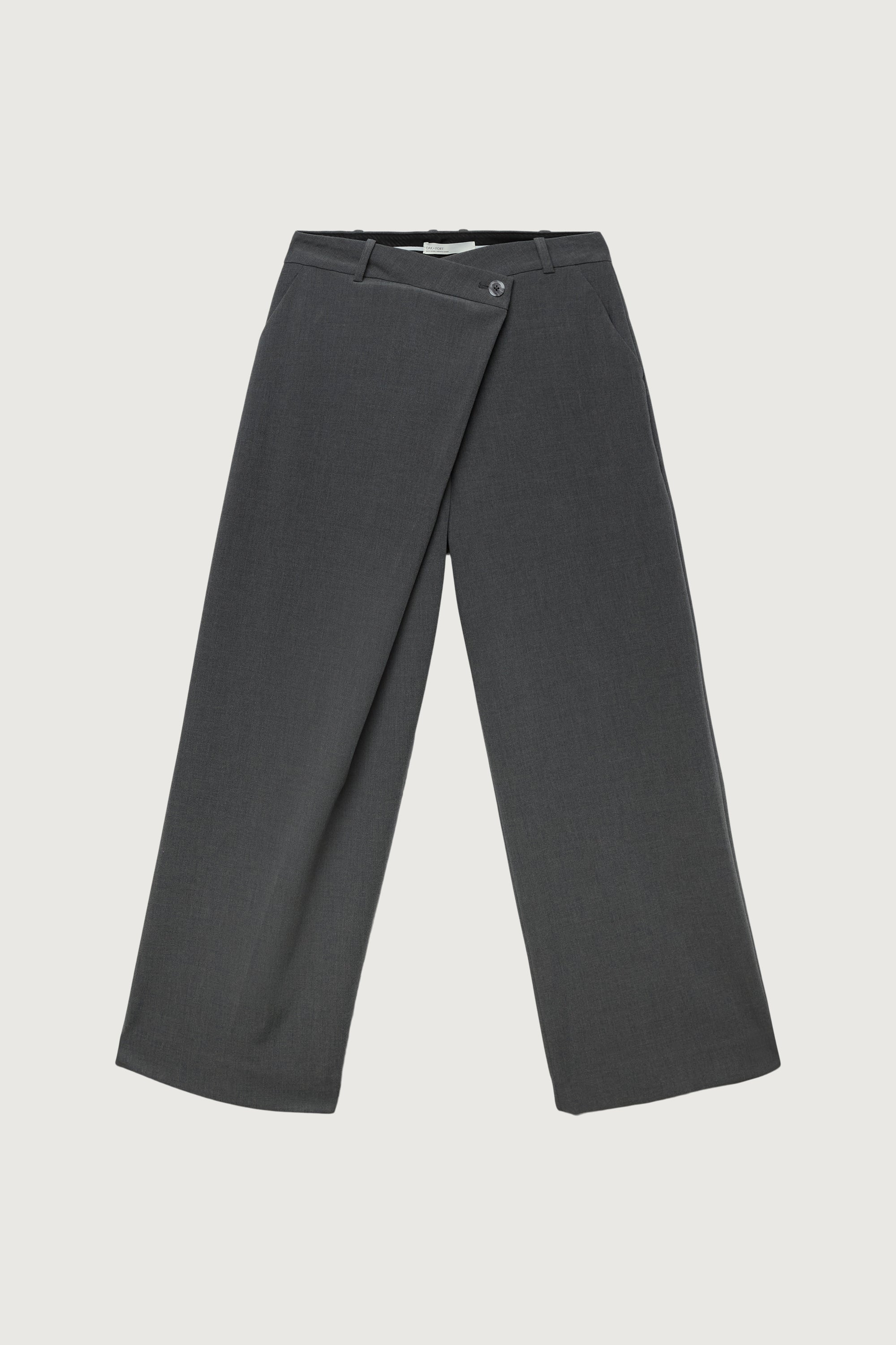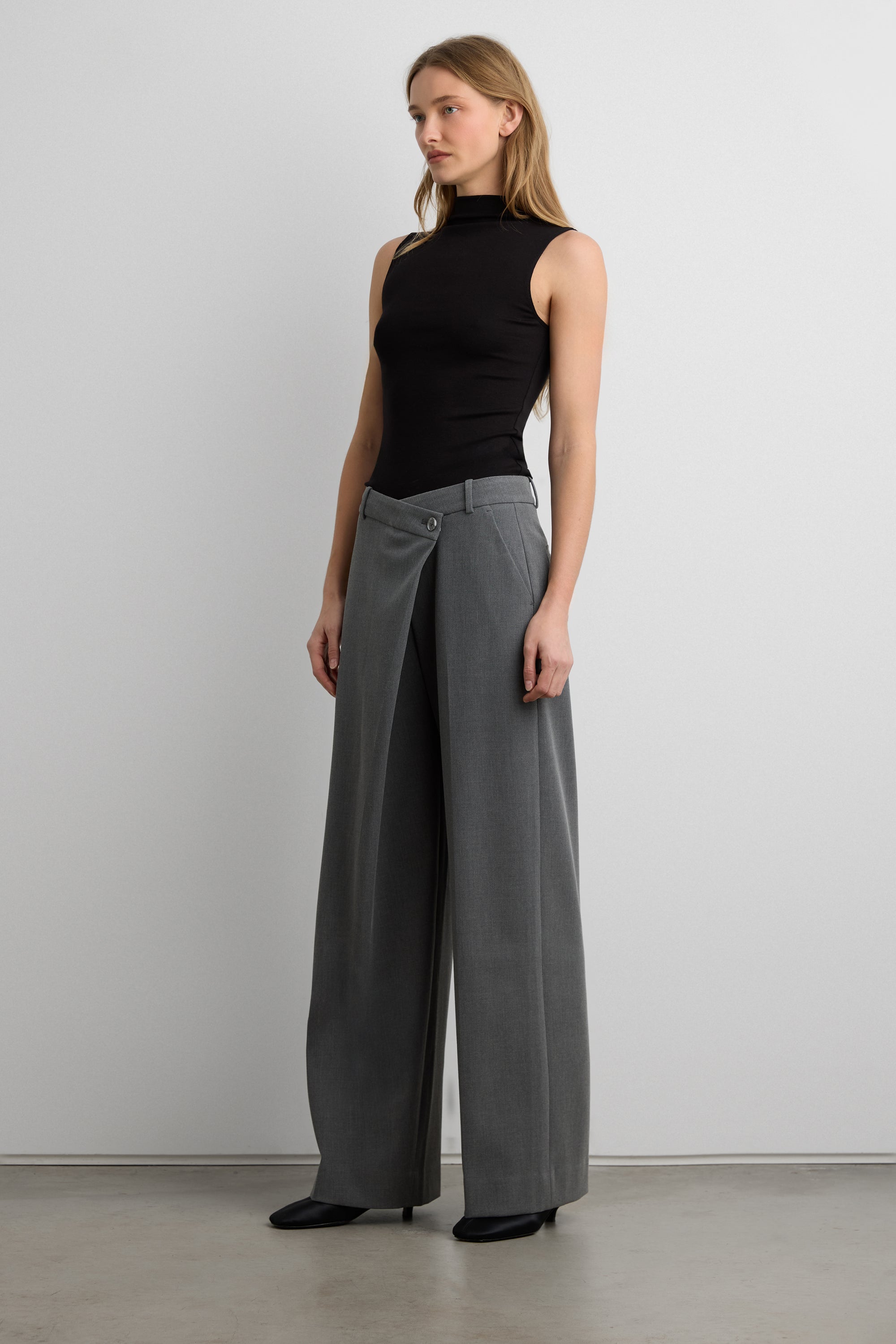 Mid-weight suiting fabric. High-rise waist. Front wrap design. Side pockets. Welt pockets. Belt loop.