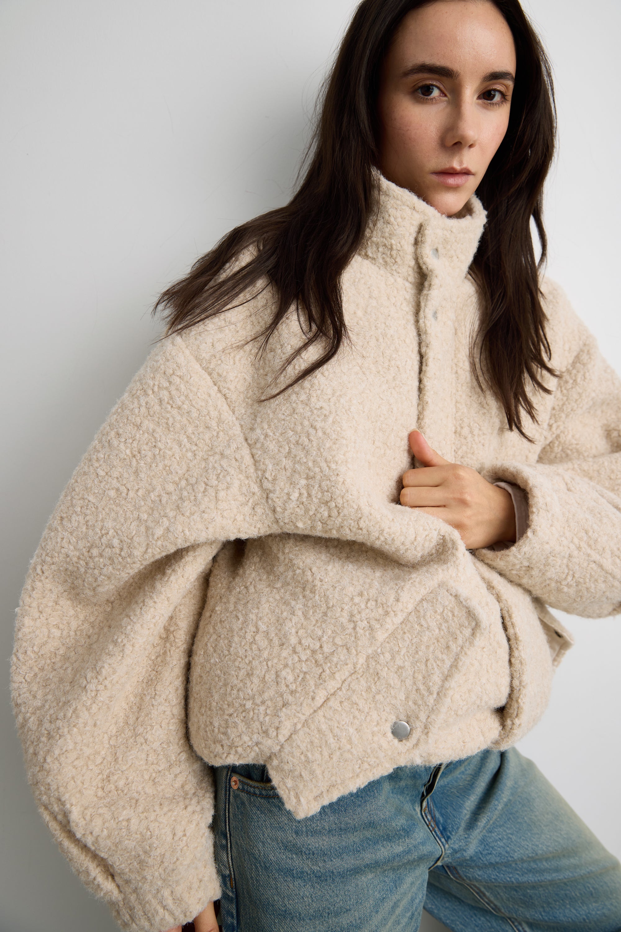 This oversized sherpa jacket is crafted from a soft, textured wool blend boucle fabric designed for warmth and ease. Finished with snap-button closures and roomy front pockets, it offers a relaxed silhouette perfect for layering through colder months. Style it over knits or denim for an effortlessly cozy look.
