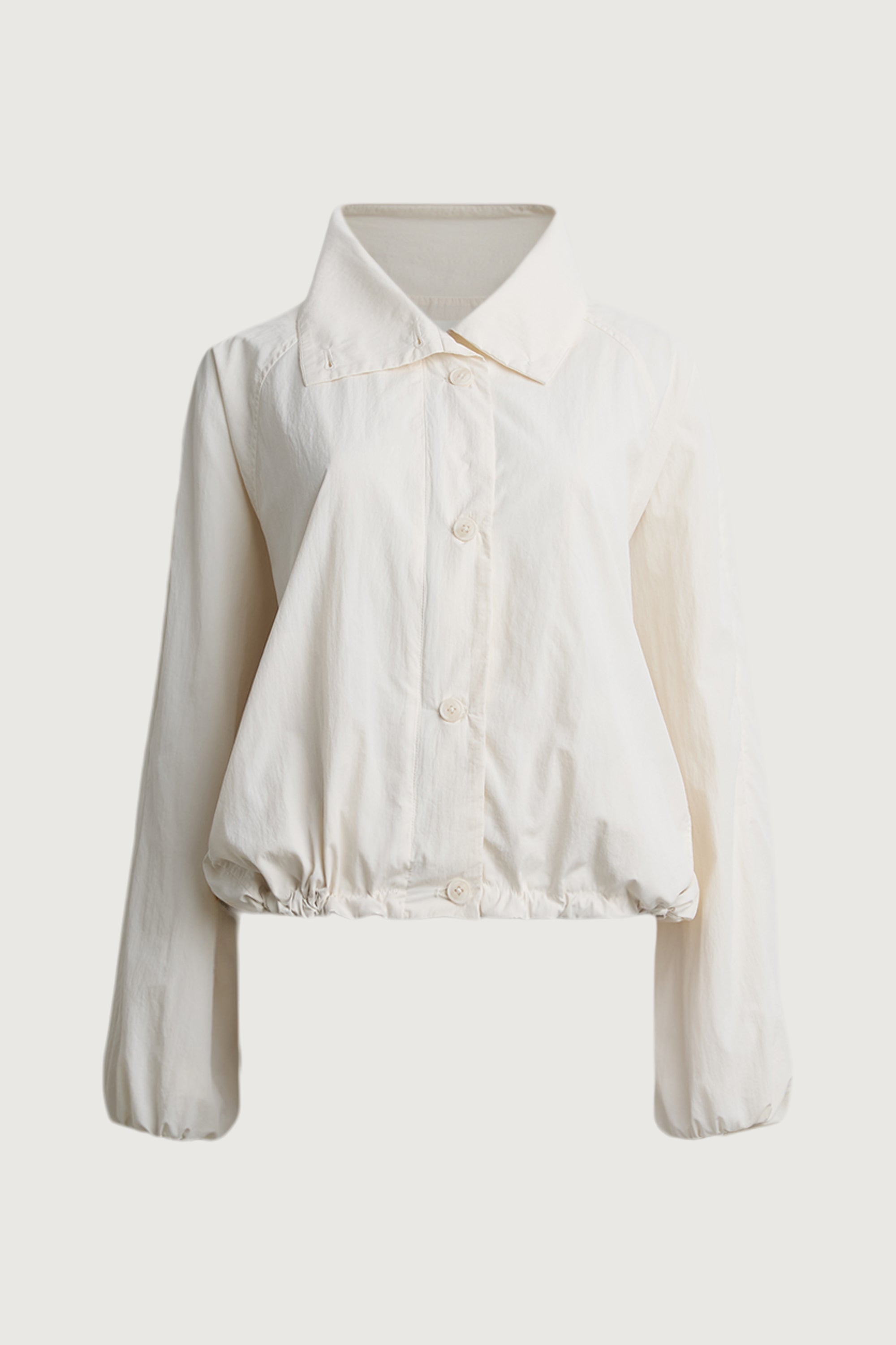 Lightweight nylon. Funnel neck design. Zipper guard with pockets. Elasticated hem and cuffs.