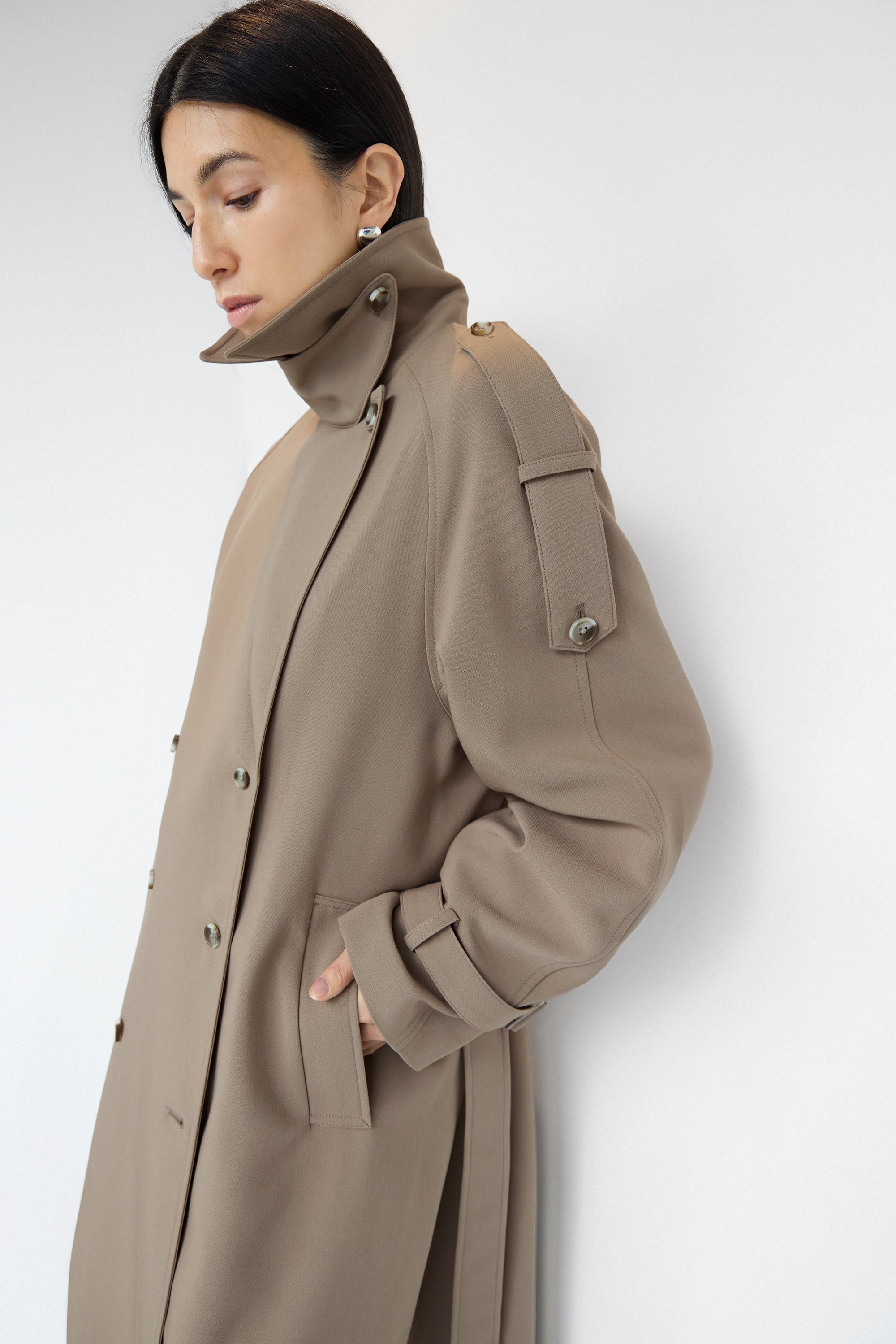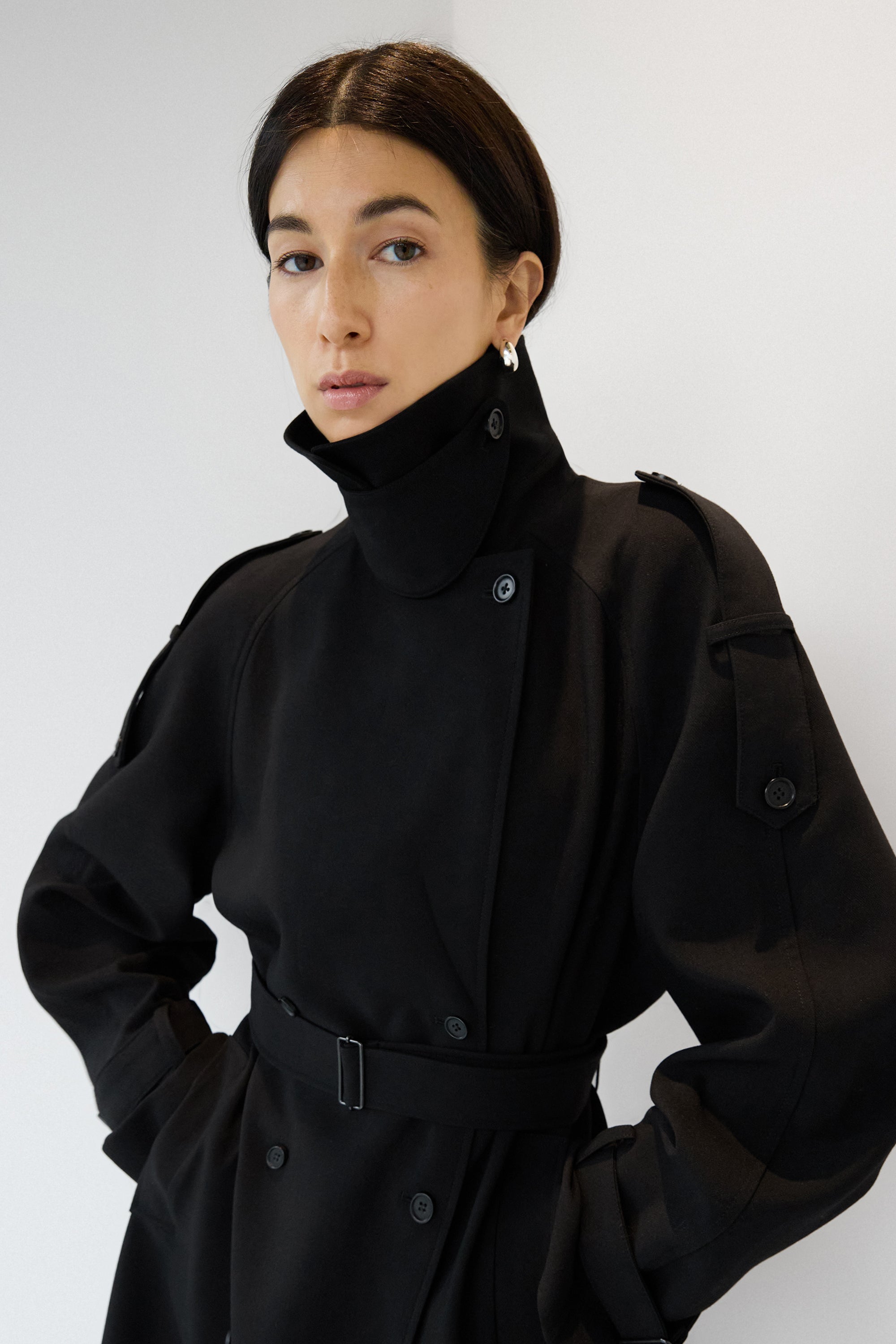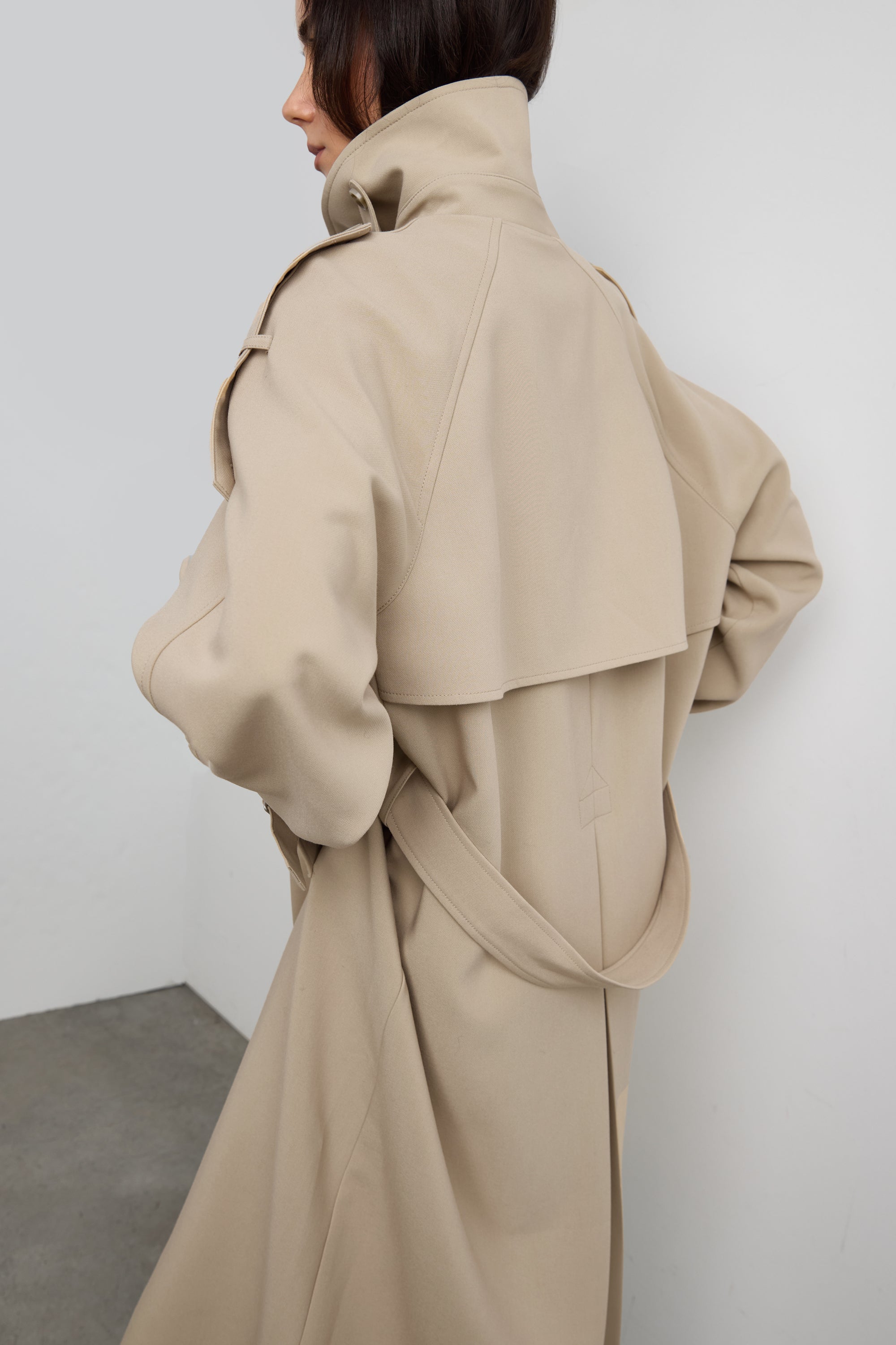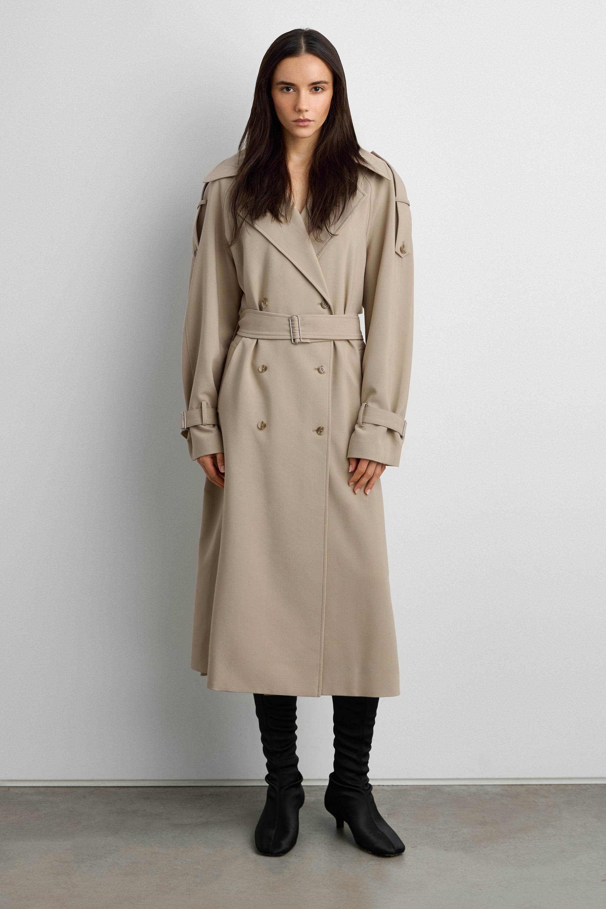 An updated take on our best selling trench coat, this version is an essential in every season and will be a versatile enough to day from day to night. The oversized fit is balanced with a double-breasted front and has a beautiful fluid drape with a subtle stretch. It has structured lapels, dropped shoulders, adjustable cuffs, a back vent and a belt detail at the neckline to create a funnel neck design. An effortless silhouette that you can wear for both for casual and chic outfits.