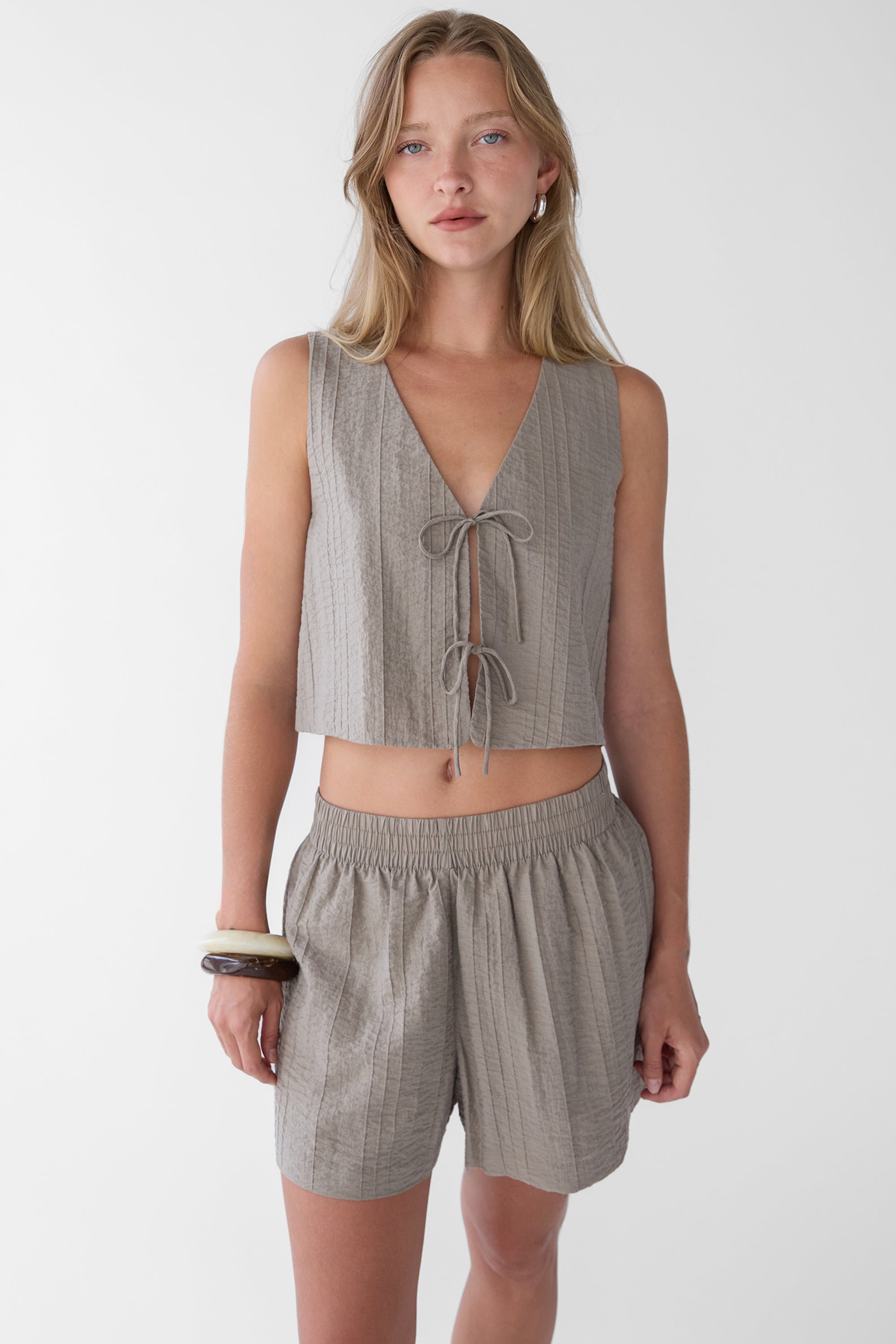 This cropped tie front tank is cut from a gauzey textured fabric in a classic fit. It's detailed with two front self ties. Perfect for warm summer days, wear yours as a set with the matching shorts.