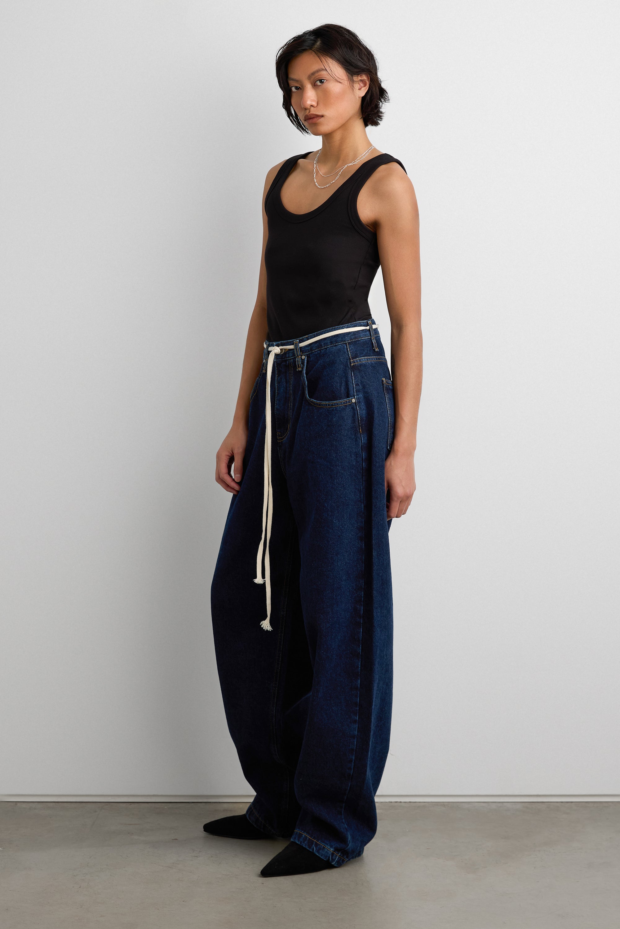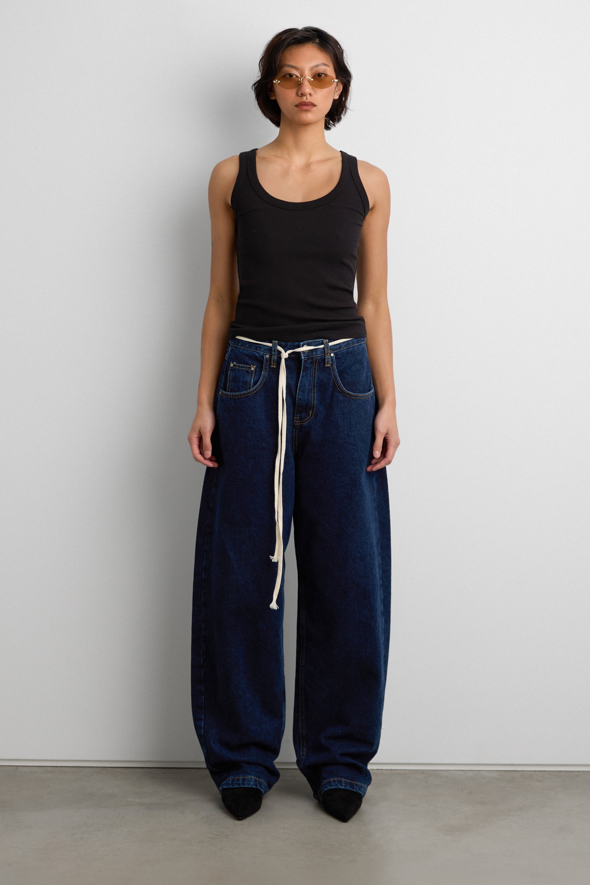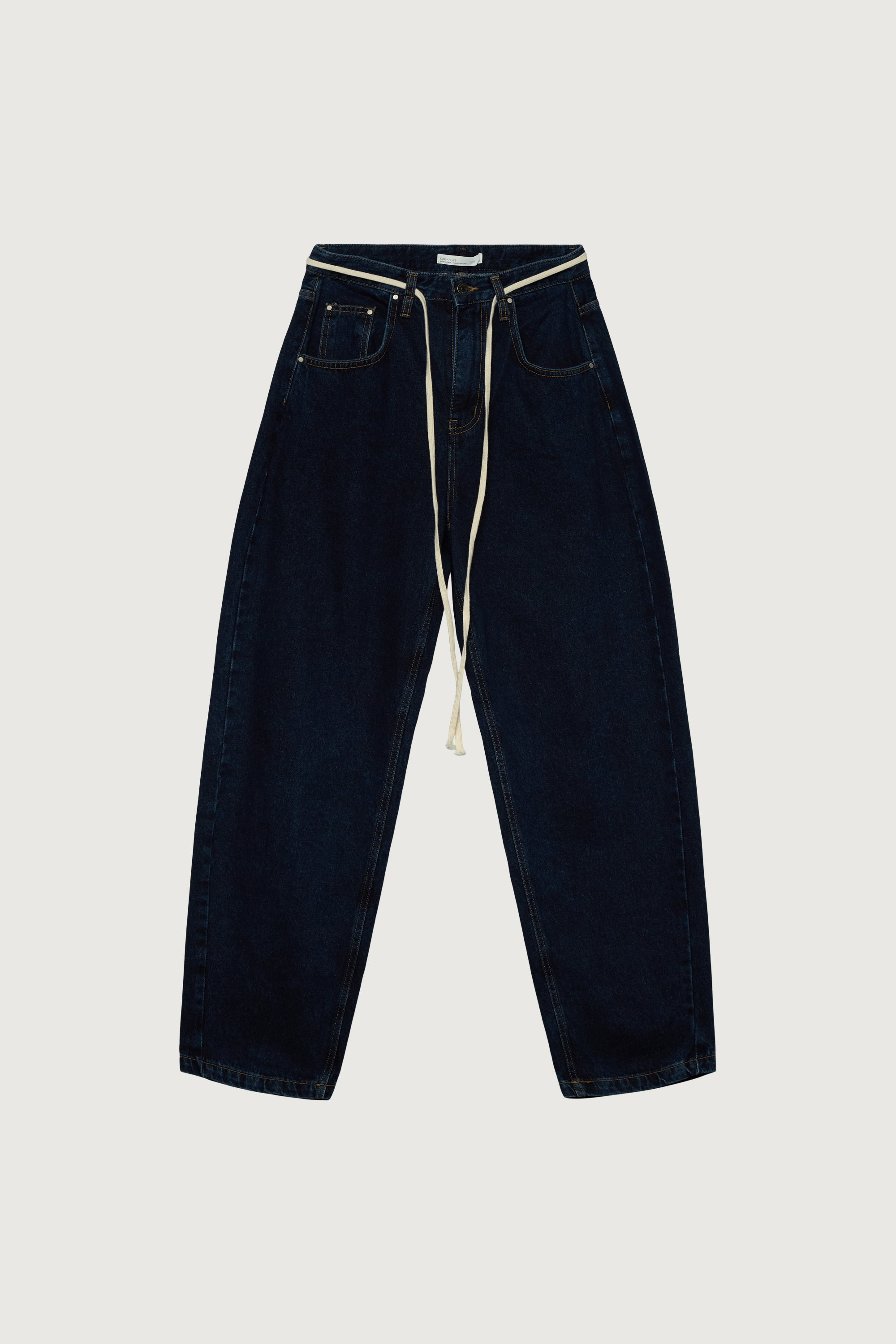 HIGH RISE BARREL LEG JEAN WITH SHOELACE BELT