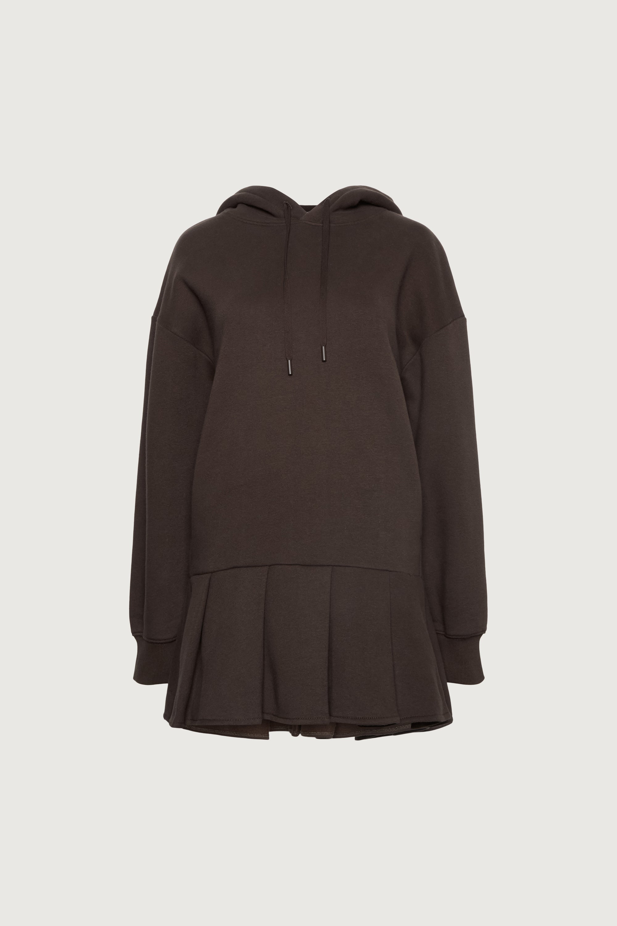 330 GSM. Drawstring hood. Rubbed cuffs. Dropped shoulders. Side pockets. Structured pleated skirt.