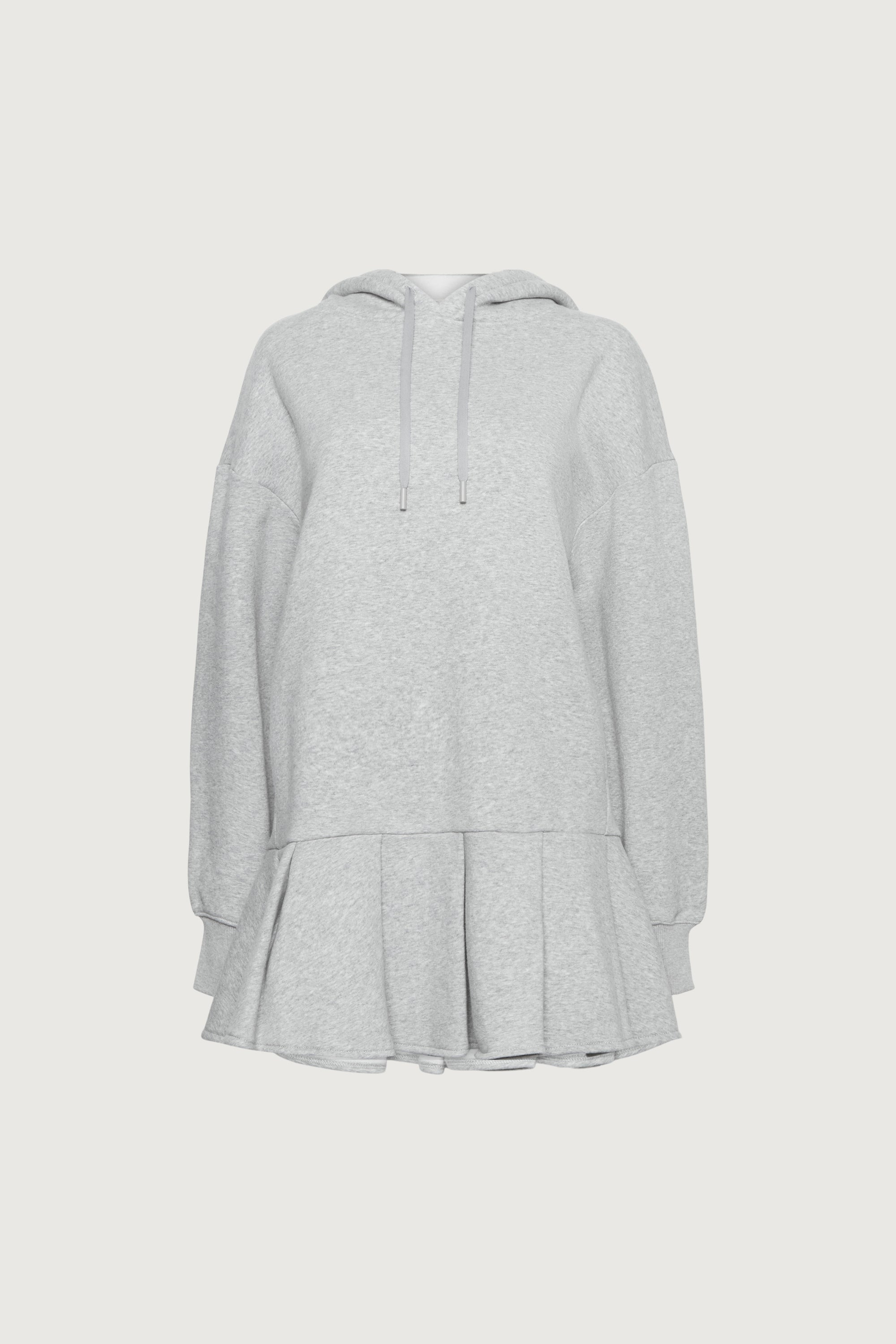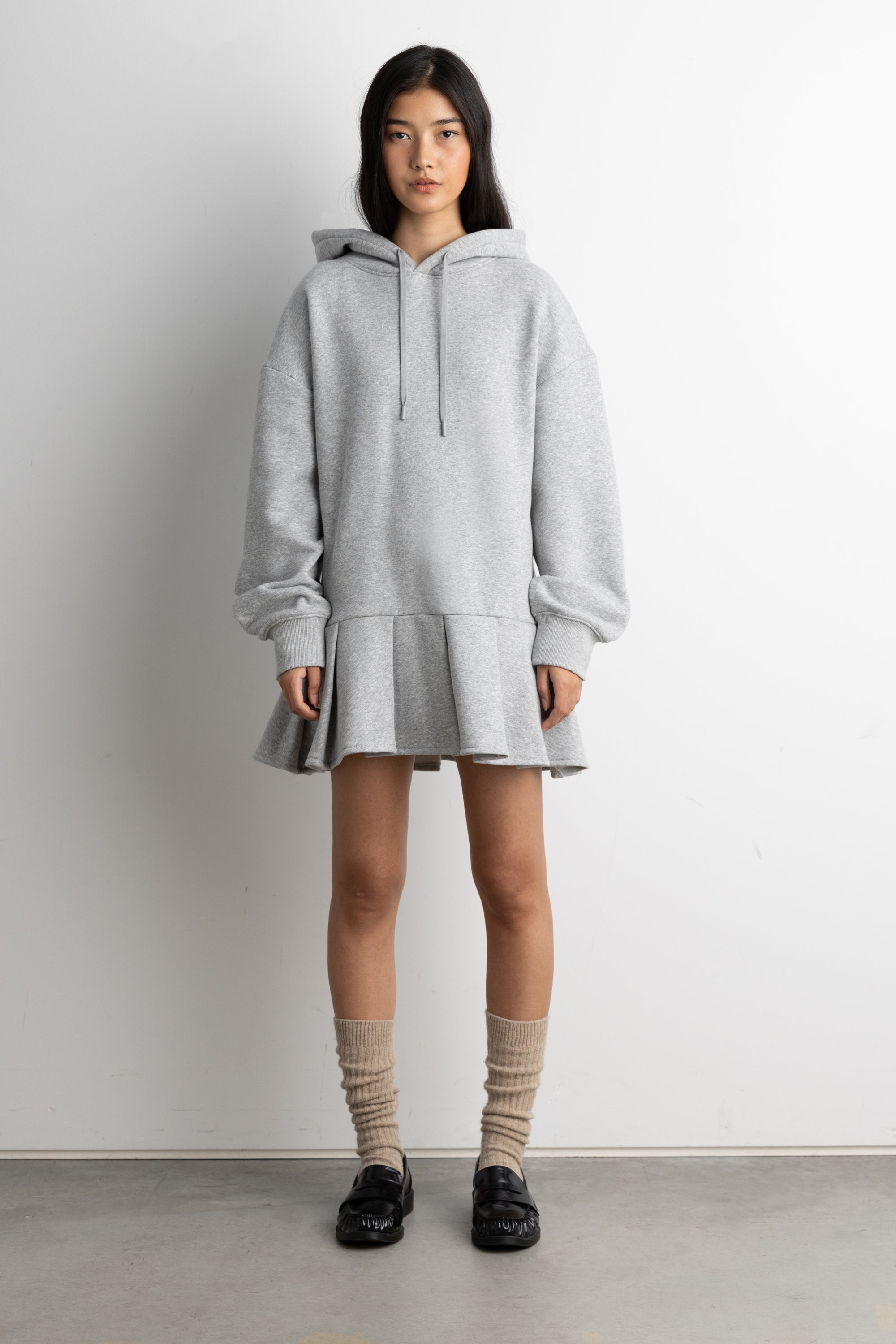 This cotton blend fleece hoodie mini dress features a drawstring hood, functional pockets and a structured pleated skirt hem. An easy choice to wear this season with sneakers or boots.