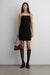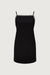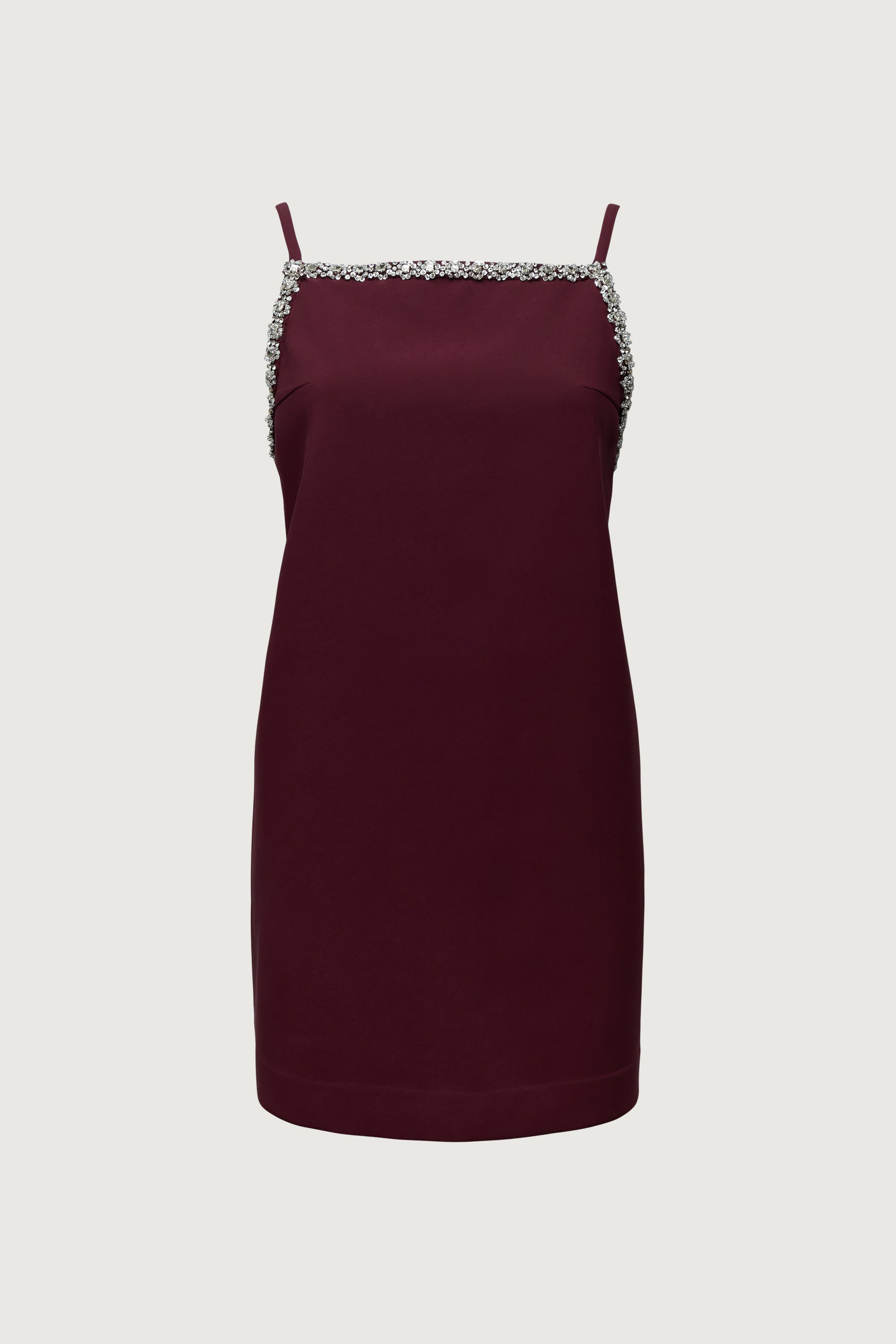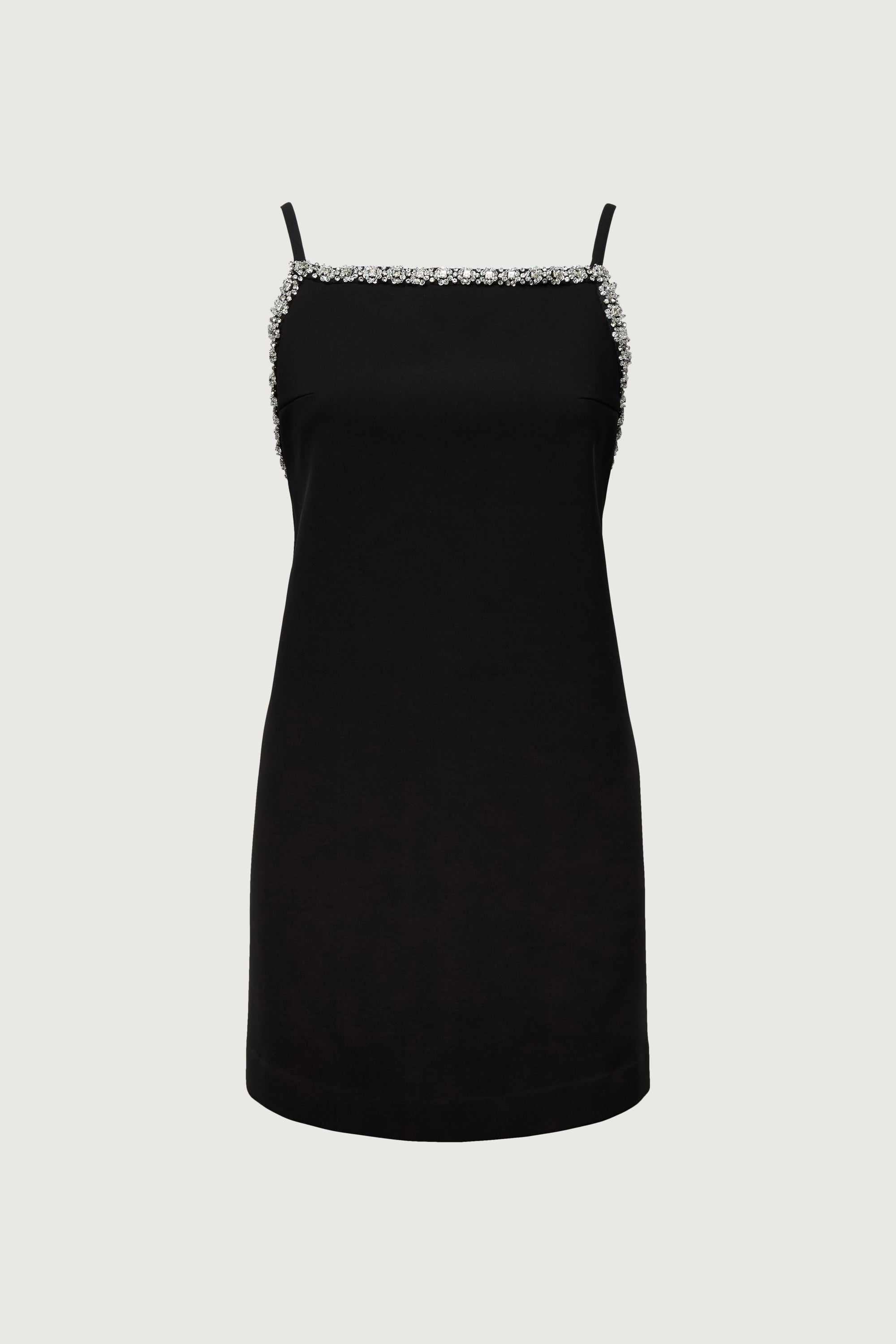 This mini dress is made from a 4-way stretch suiting fabric in a slim fit. It has a subtle A-line silhouette with an open-back and jeweled details along the neckline.