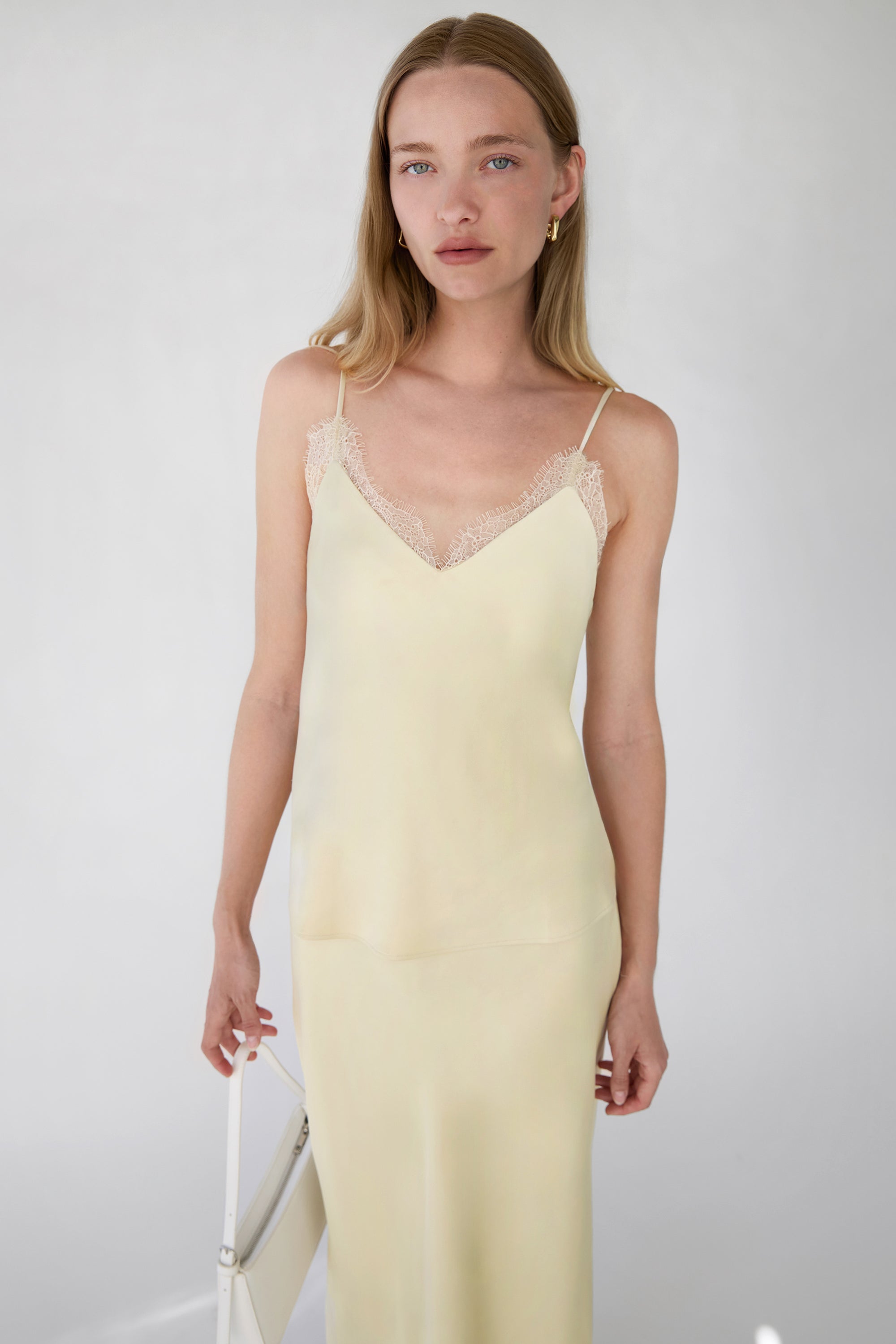 Satin fabric. Lace trim V-neckline. Adjustable shoulder straps.