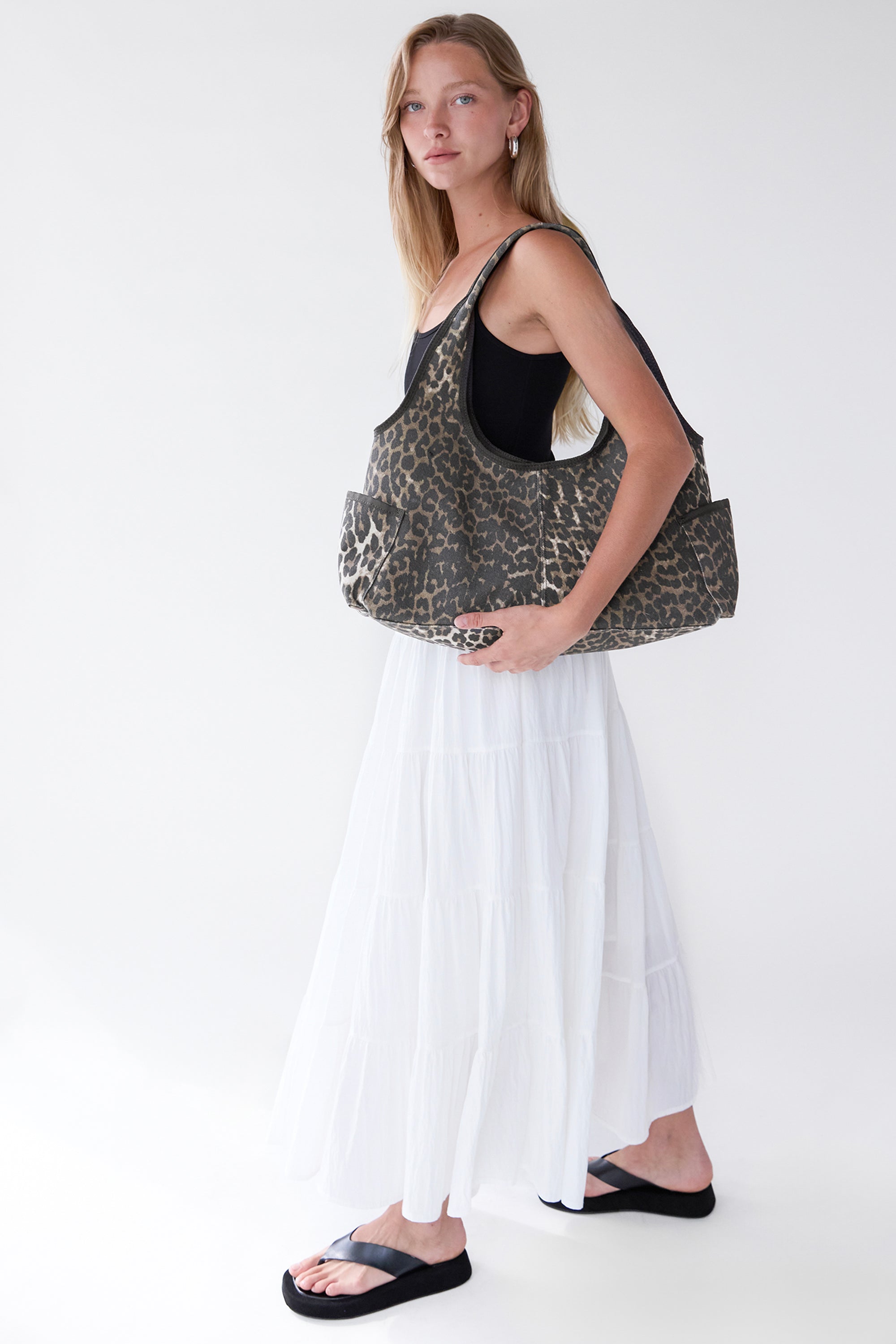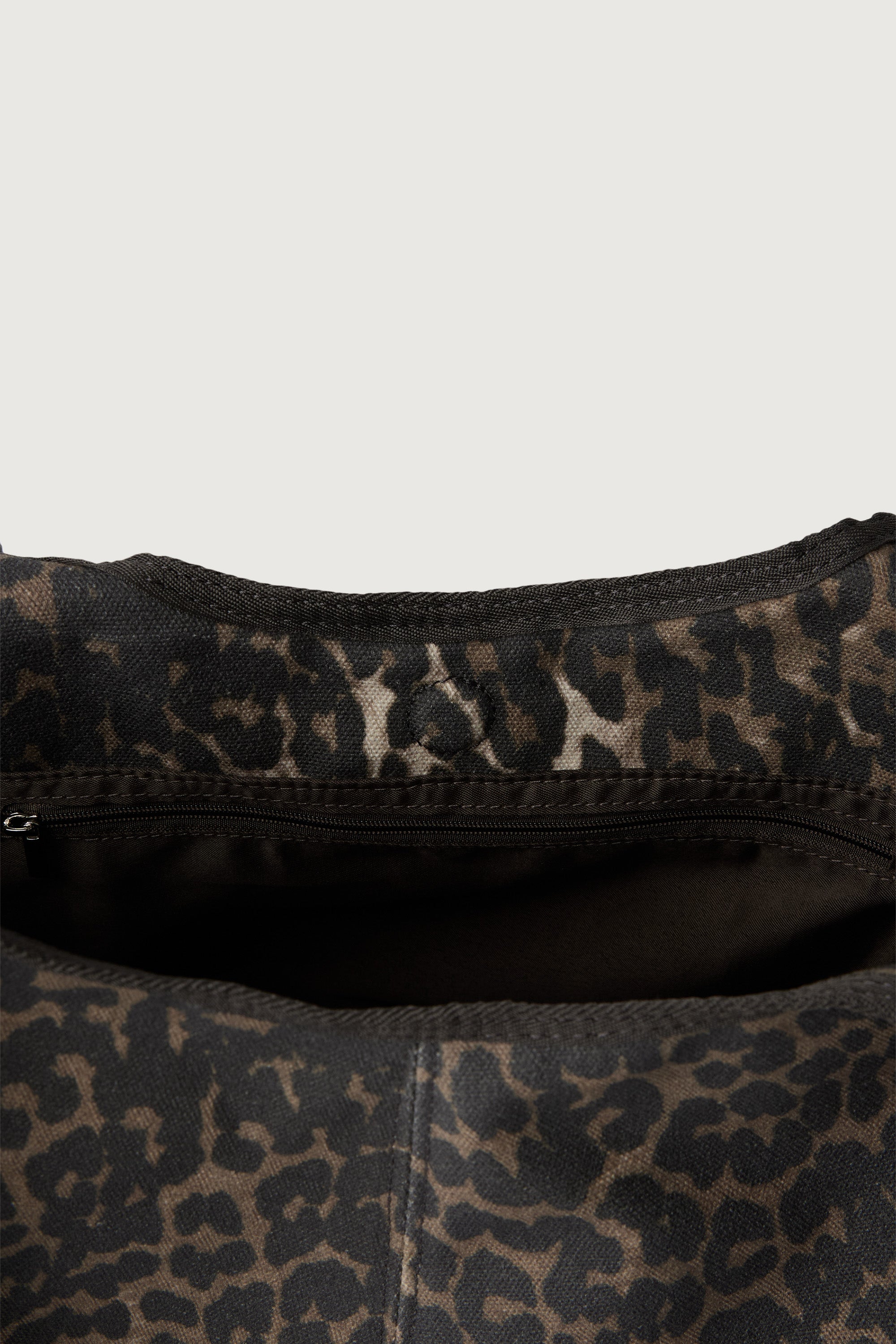 This canvas tote bag features a bold leopard print, and includes multiple exterior pockets for convenient storage and easy access to essentials. The double drop shoulder straps provide comfortable carrying, and a snap tab closure keeps the contents secure. Perfect for an everyday casual look, this tote combines functionality and style.