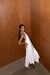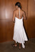 Lightweight linen rayon. Halter neckline. Bias cut panel. Handkerchief hemline.