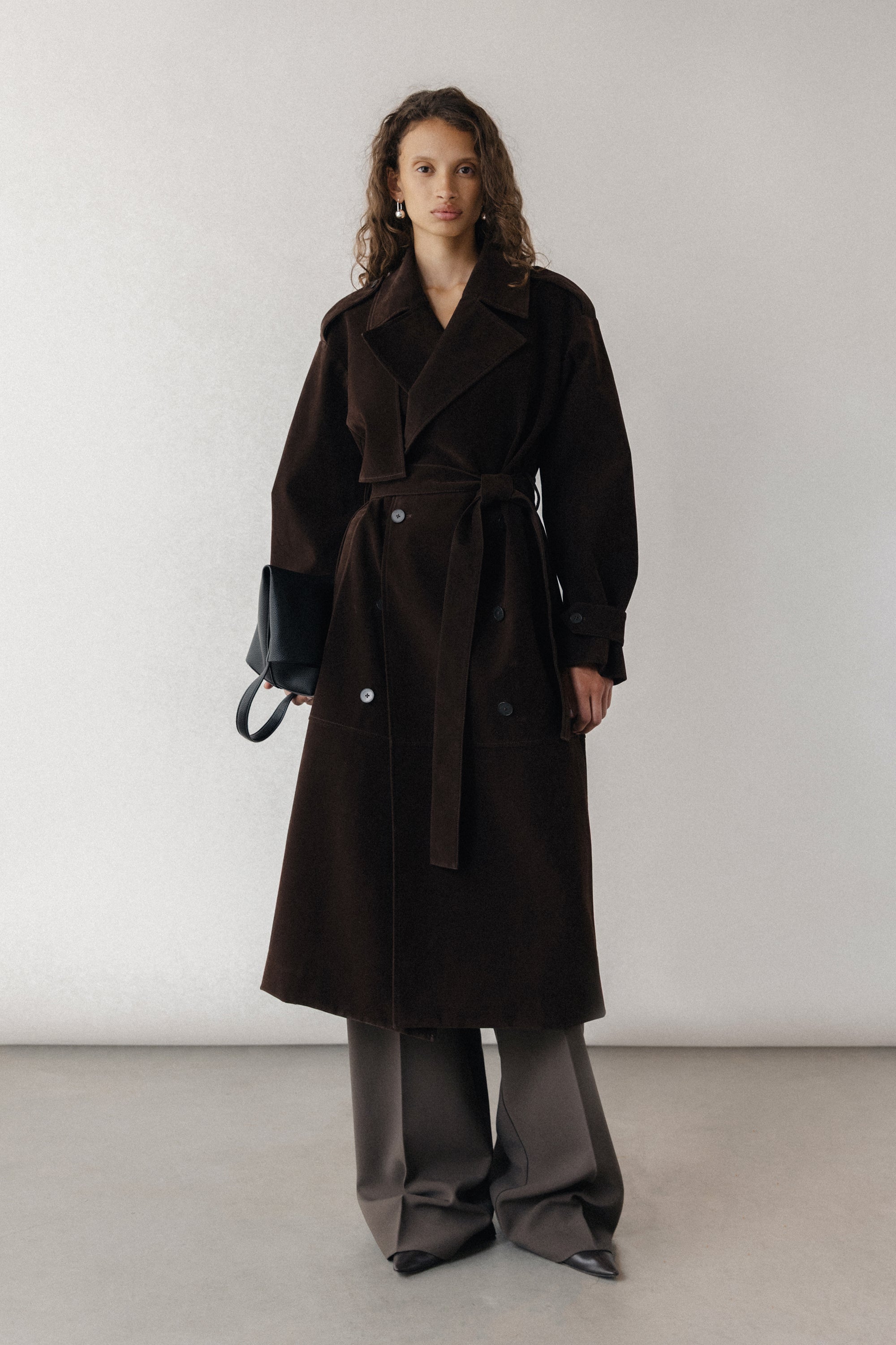 This vegan suede double-breasted trench coat is the essential outerwear piece for your fall wardrobe. It has a long paneled design in a coffee brown colour that pairs well with any look. It features notched lapels, slash pockets, button details at the sleeves and a waist belt.