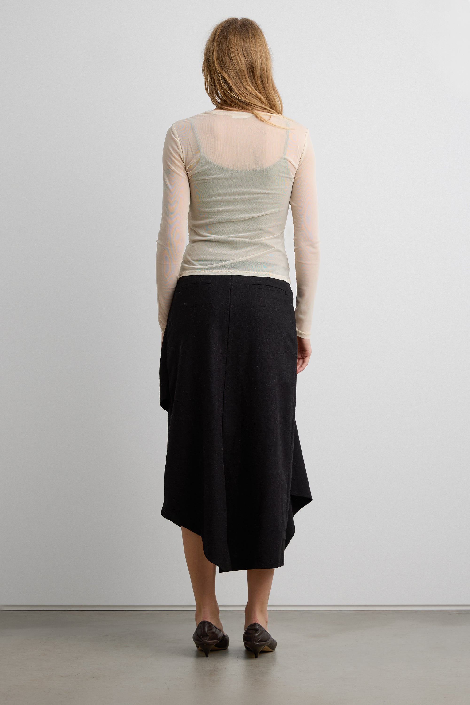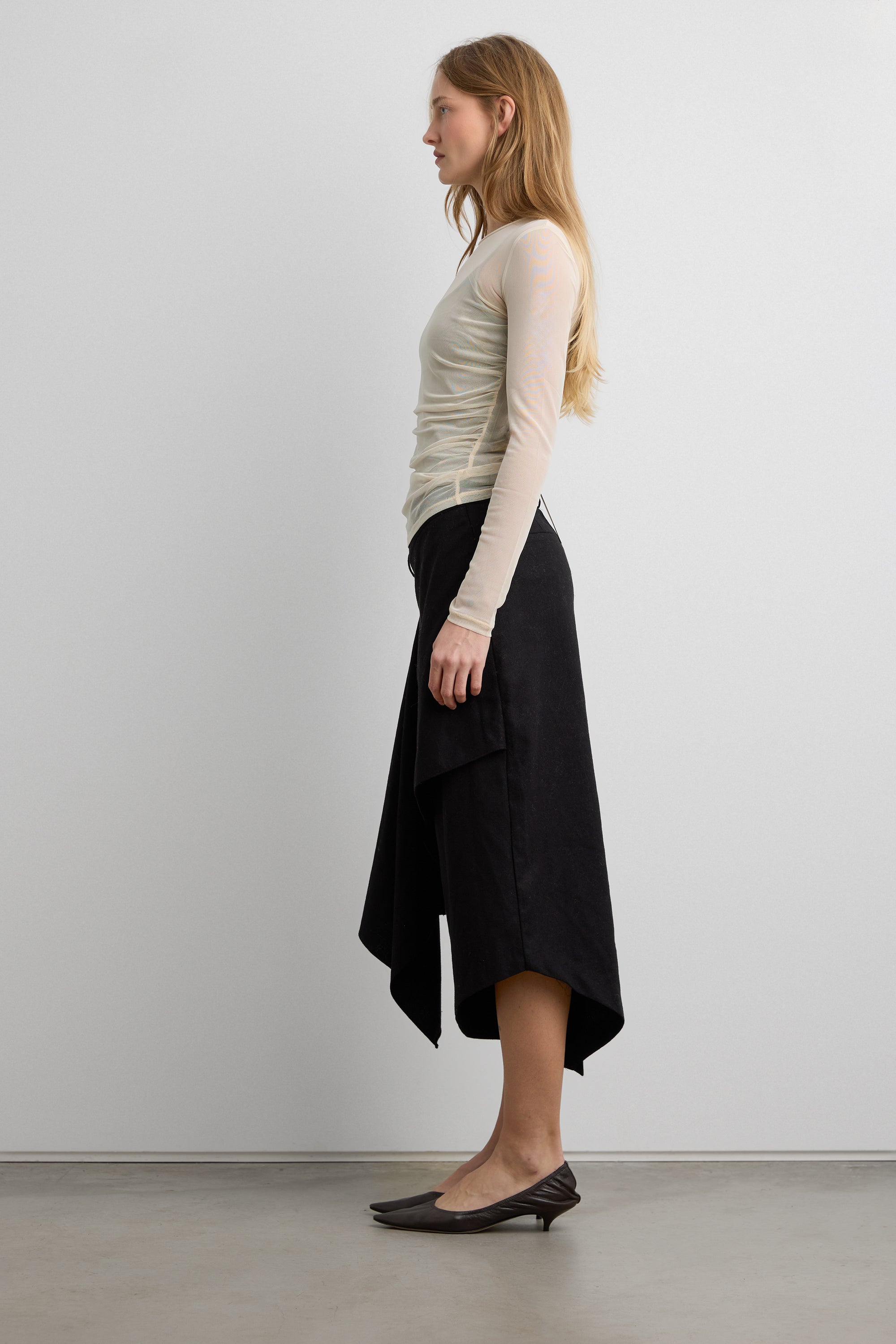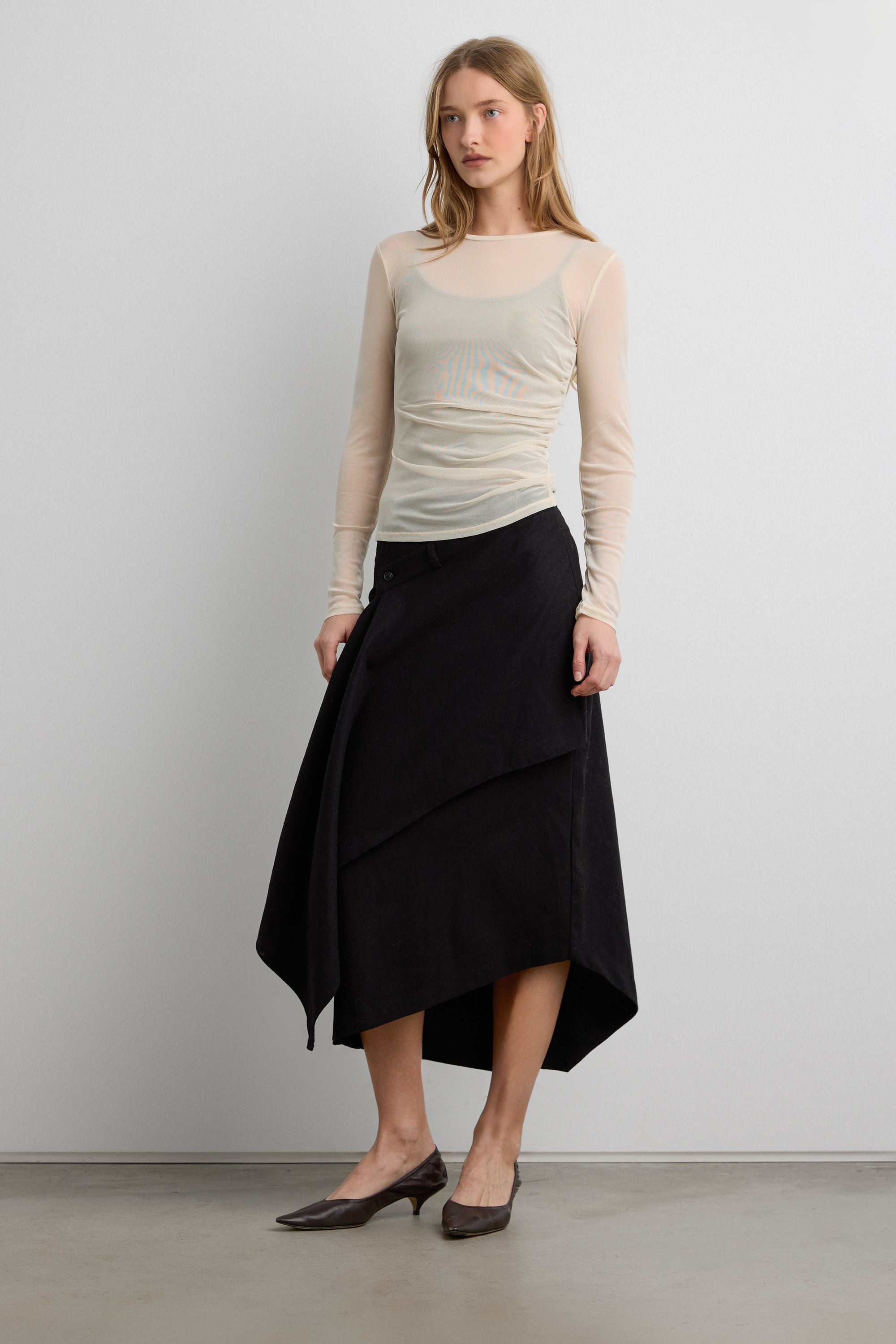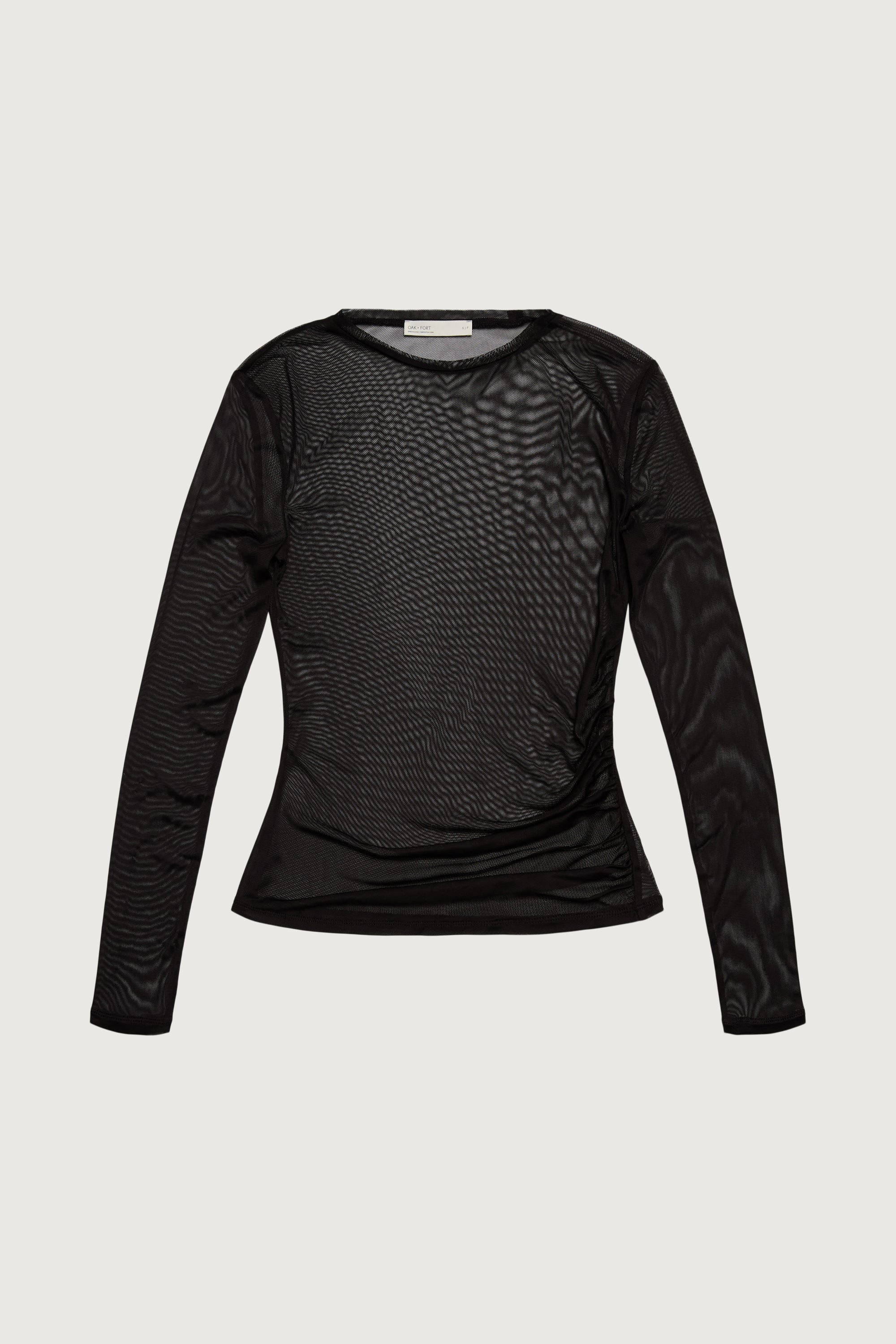 This sheer mesh patterned long sleeve top is made in a body-hugging silhouette to easily layer over a fitted tank or just a lace bralette. Style yours with a bralette and high-rise trousers under a vegan leather bomber.