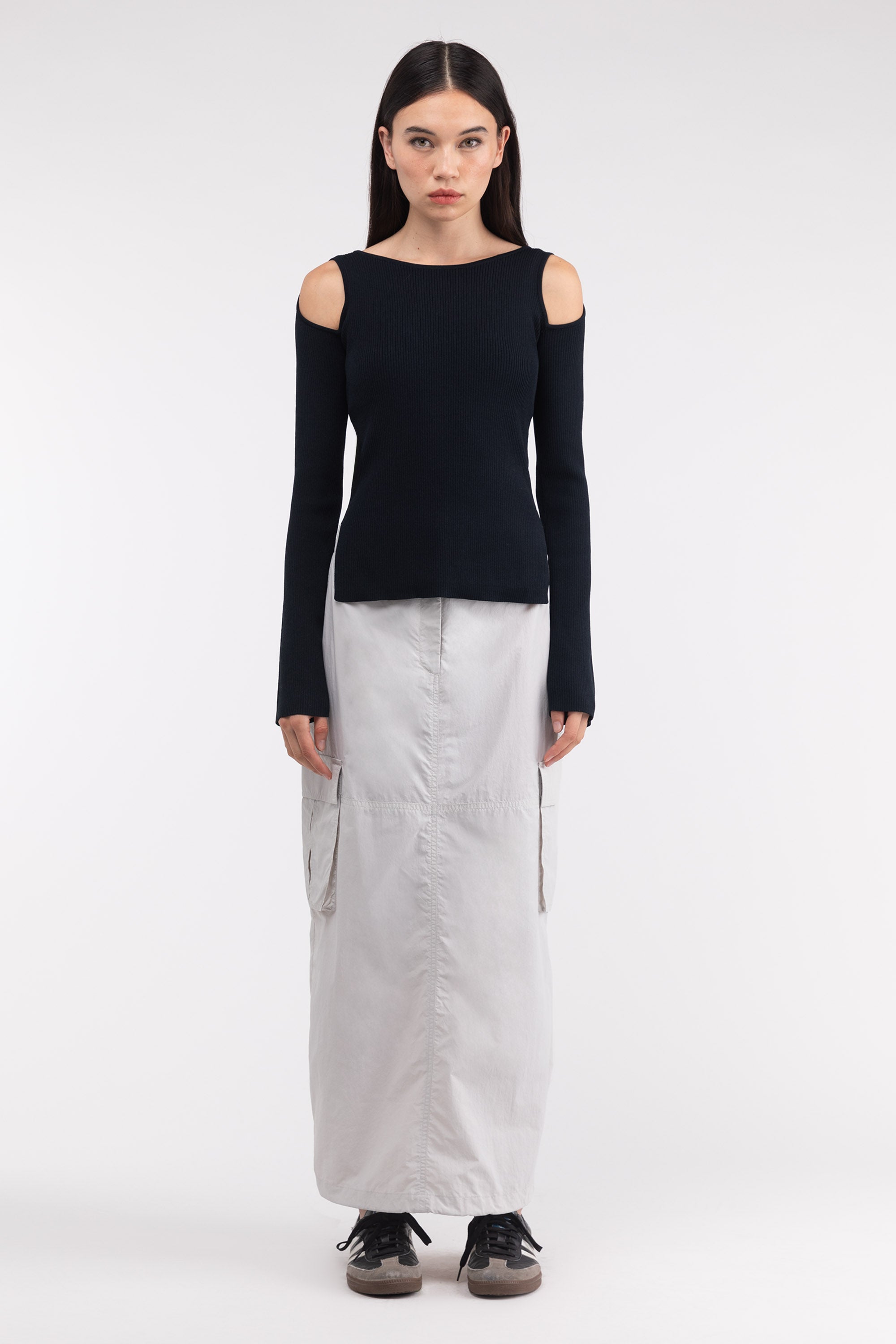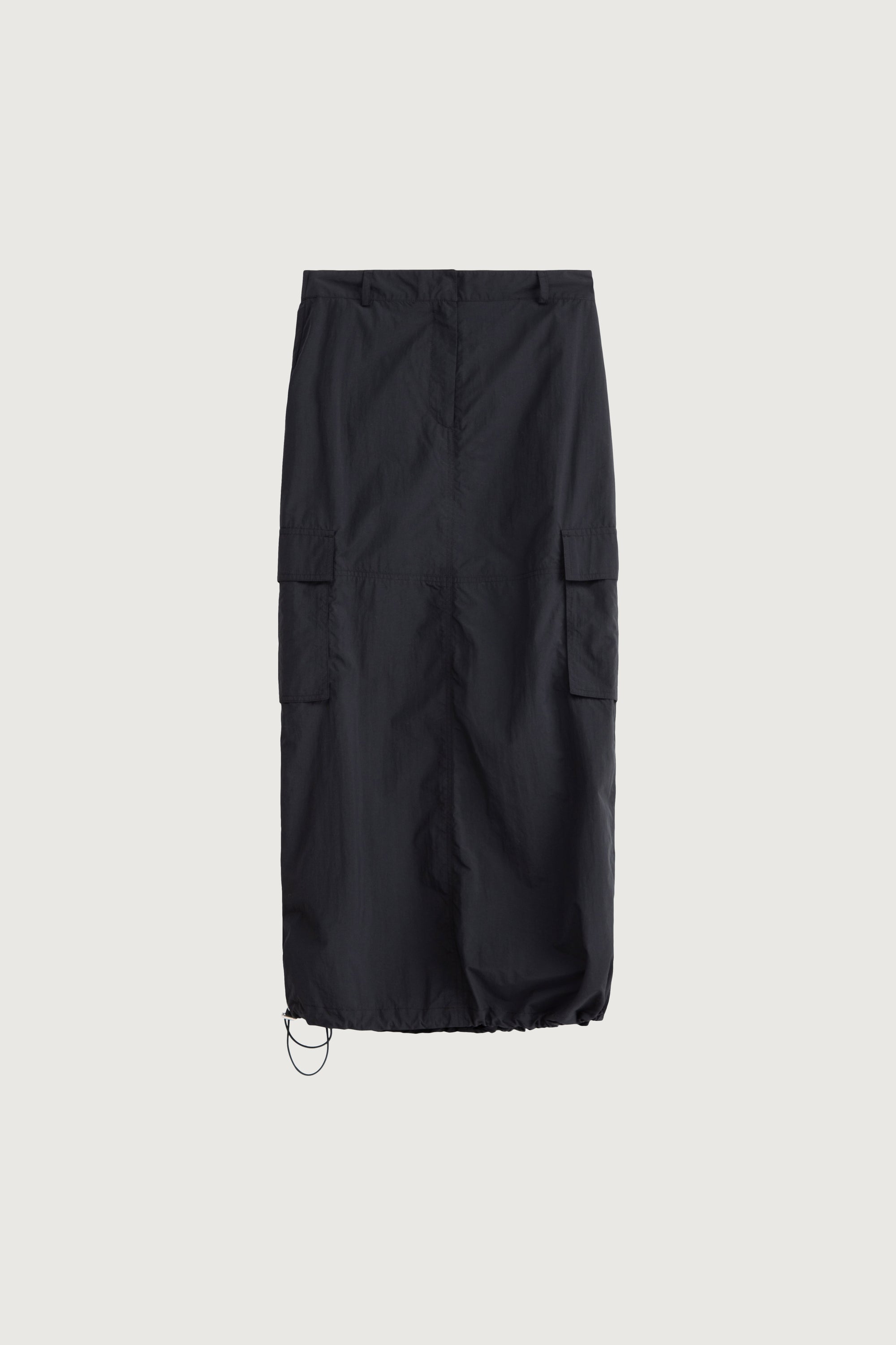 This nylon maxi cargo skirt is lightweight and made in a relaxed fit. It has an elasticated waist at the back, cargo pockets, side slits and shockcord and toggle hem.