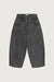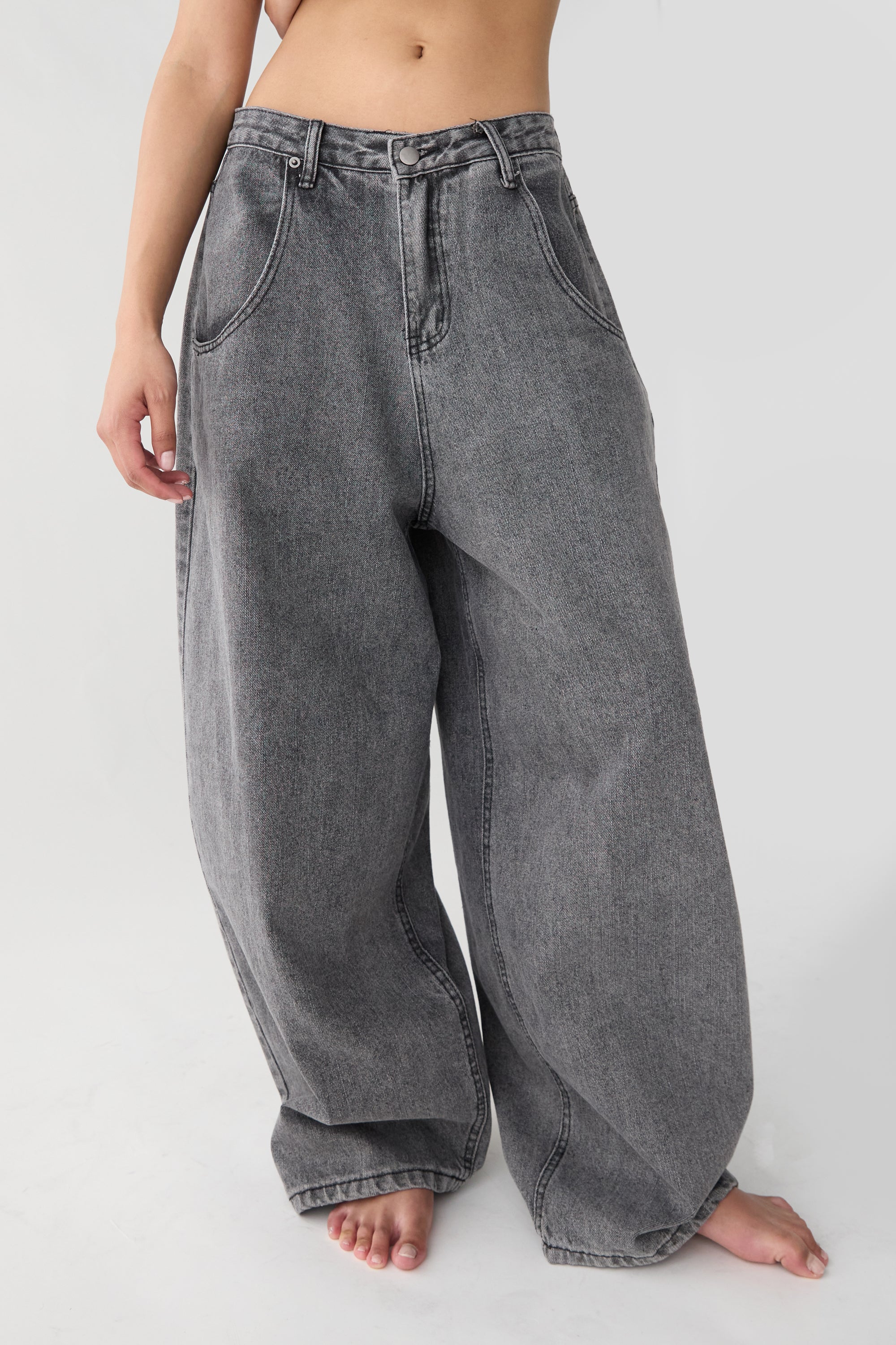 Low-rise waist. Mid-weight. Non-stretch denim. Barrel leg shape. Low positioned front pockets. Belt loops. Zipper and button fly closure.