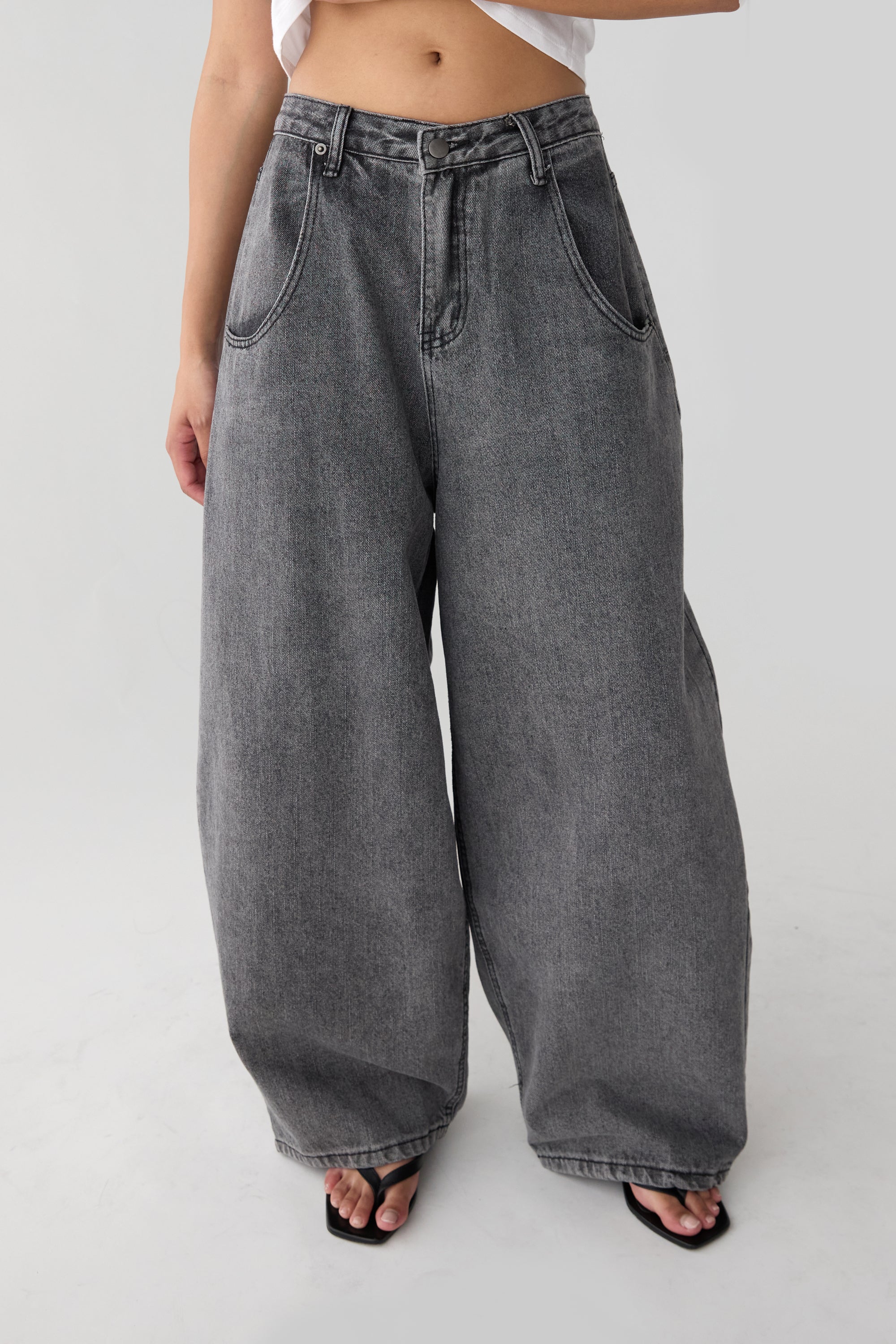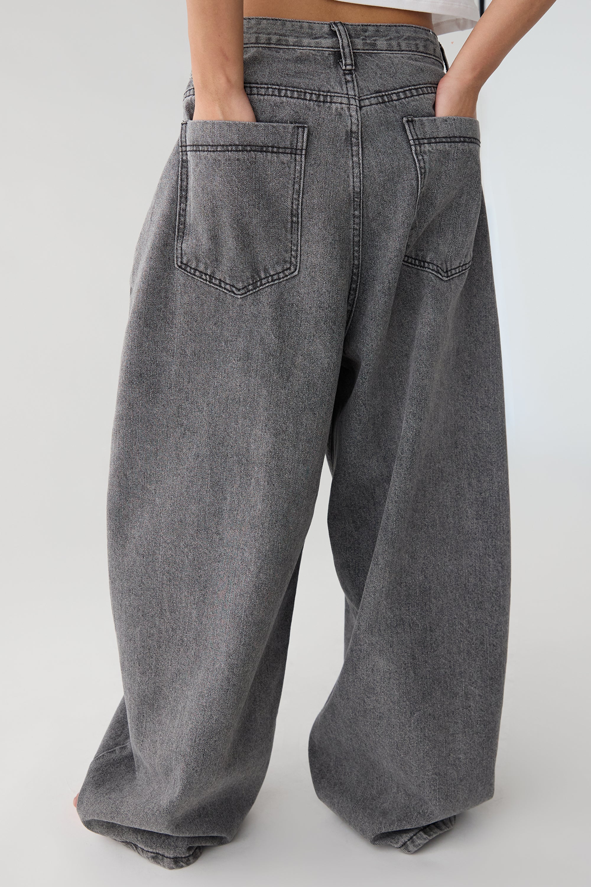 These ultra baggy dark wash jeans have a mega wide leg cut with a subtle curve. It sits low on the waist for a laid-back look. It has two uniquely positioned low front pockets, these jeans combine function with fashion. Made from mid-weight, non-stretch denim, these jeans are ideal for casual wear and versatile enough for various occasions.