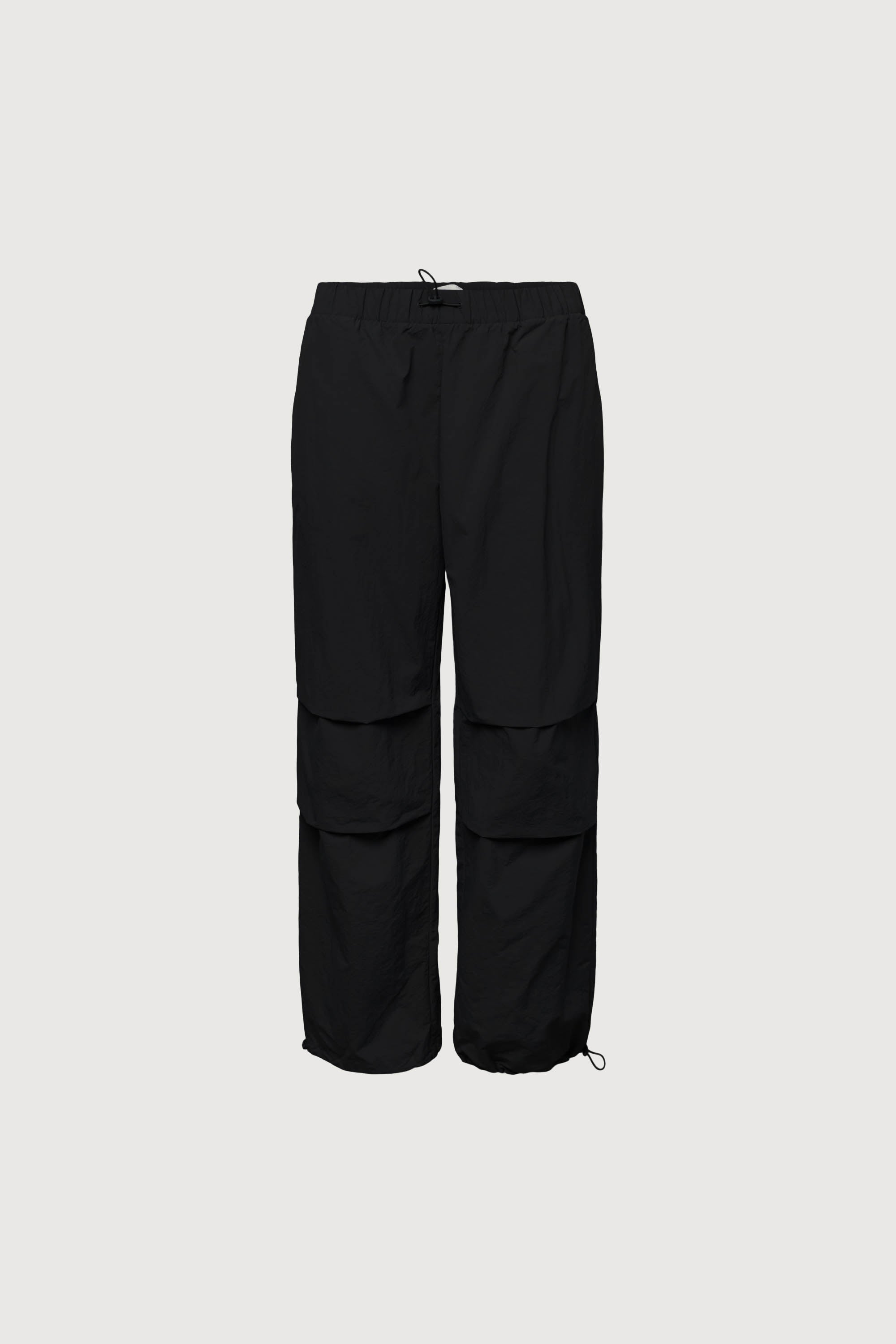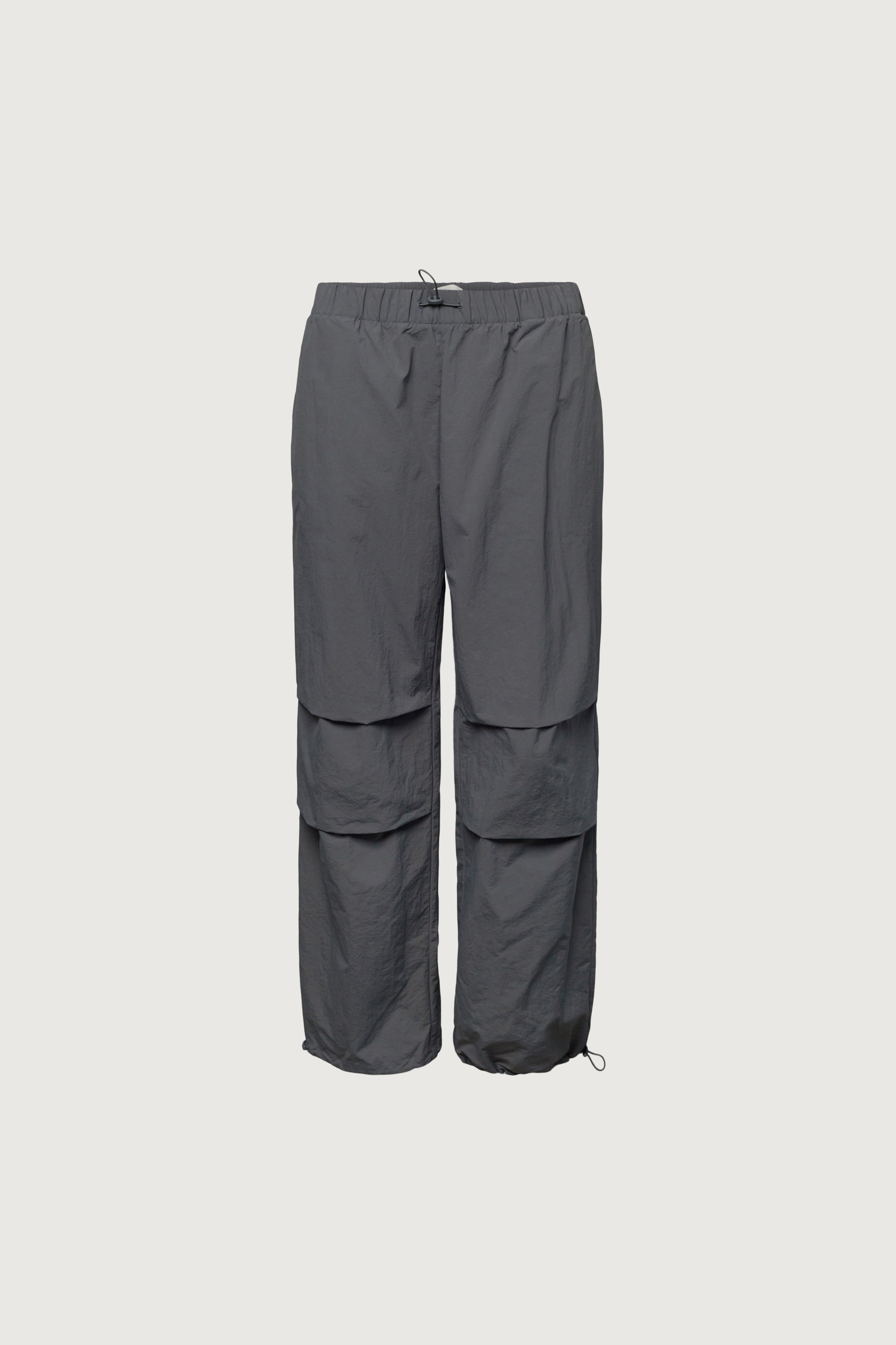 Recycled nylon fabric. Shock cord at waist and hem. Knee pleats. Side pockets.