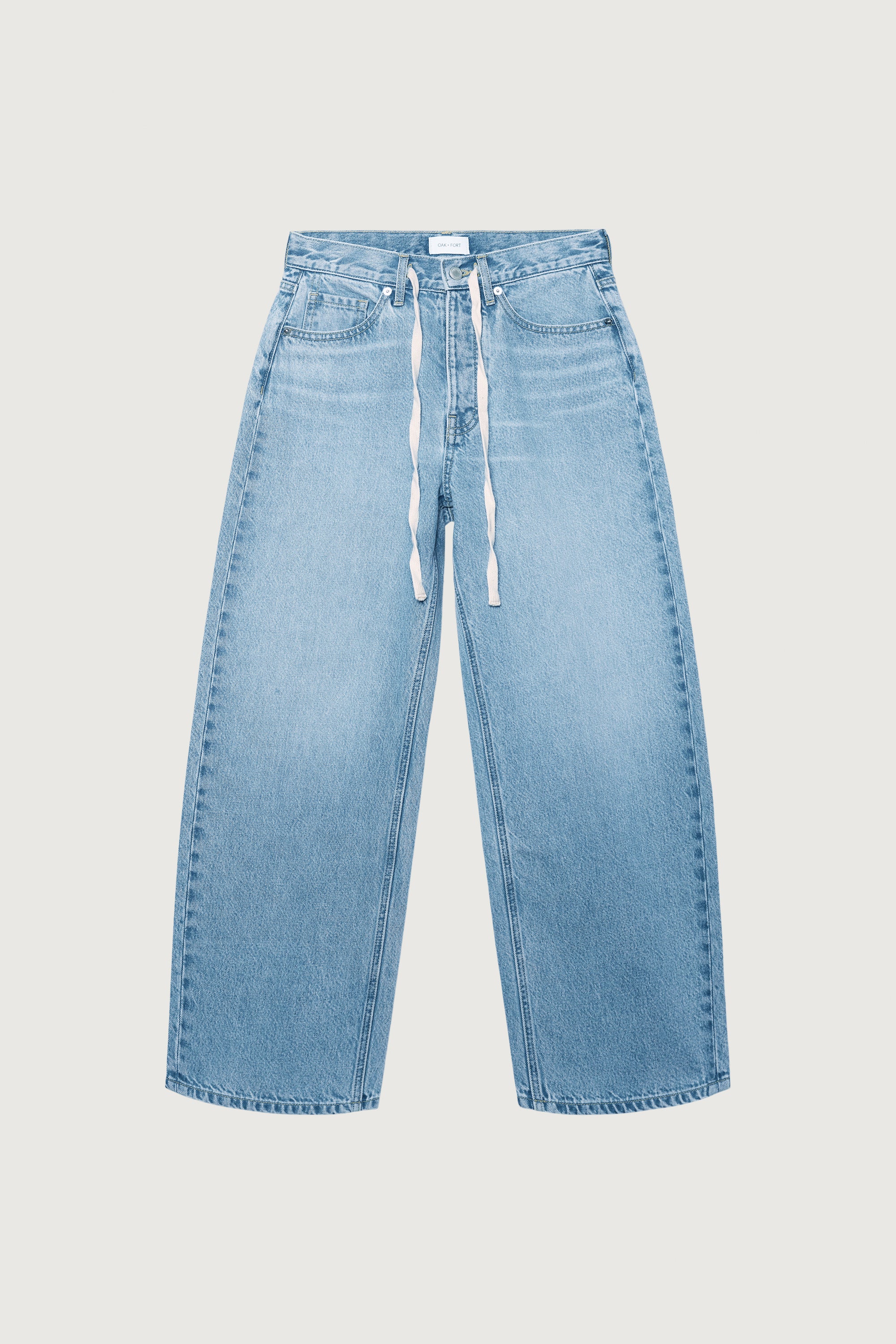 Light wash denim with fading. Drawstring waist. Belt loop. 5-pocket design.