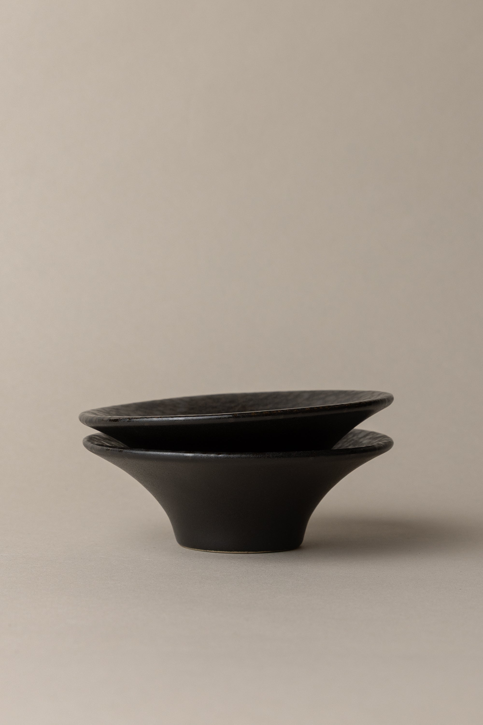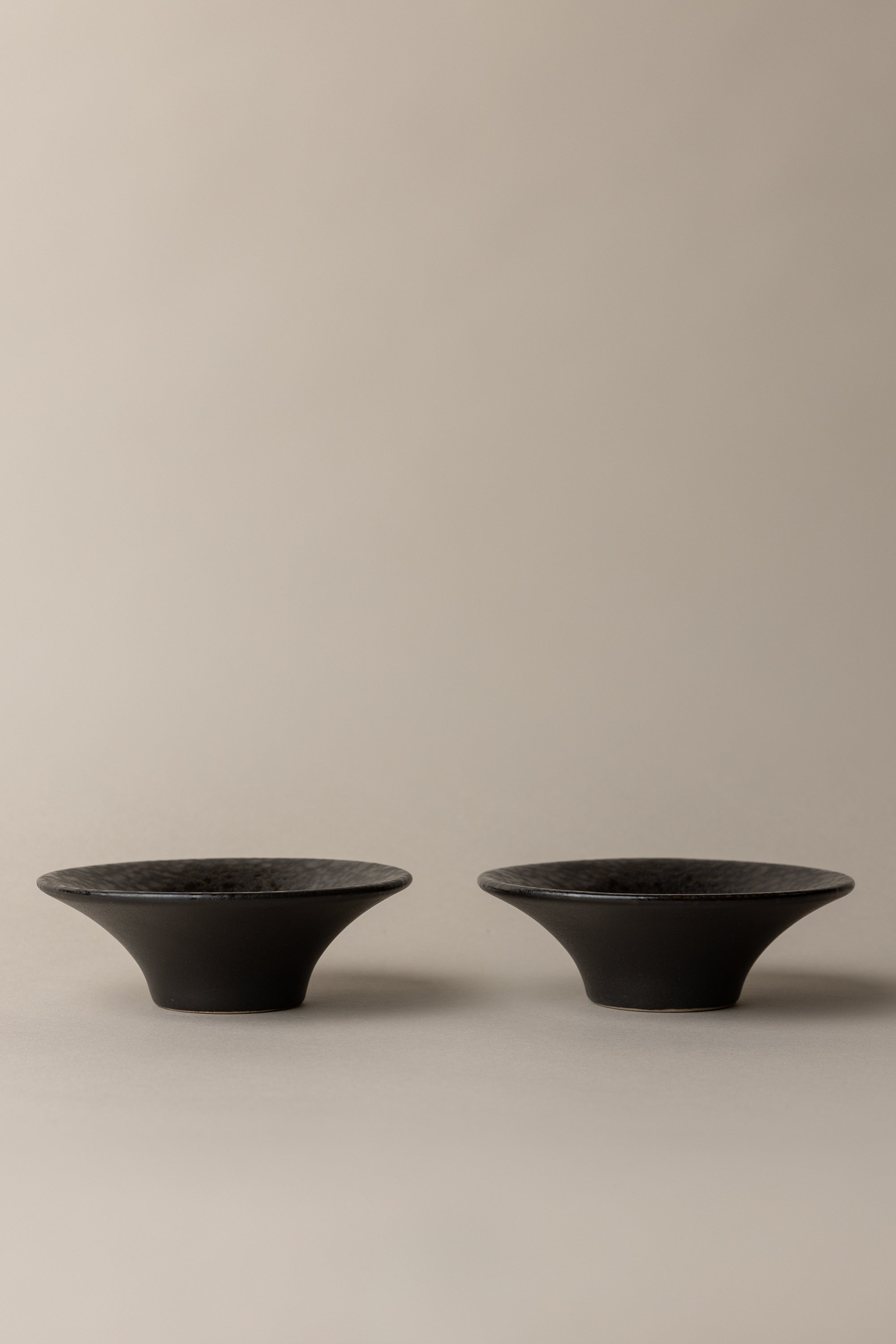 A study in contrasts, this side bowl pairs a tapered silhouette with a glaze that shifts between matte and gloss for striking depth. The wide rim and softly angled profile give the piece a sculptural quality, while the speckled surface highlights the artisanal glaze technique. Each bowl is individually finished and hand-stamped with the SENN logo. Perfectly sized for sides, snacks, or layered table settings. Sold as a set of 2.