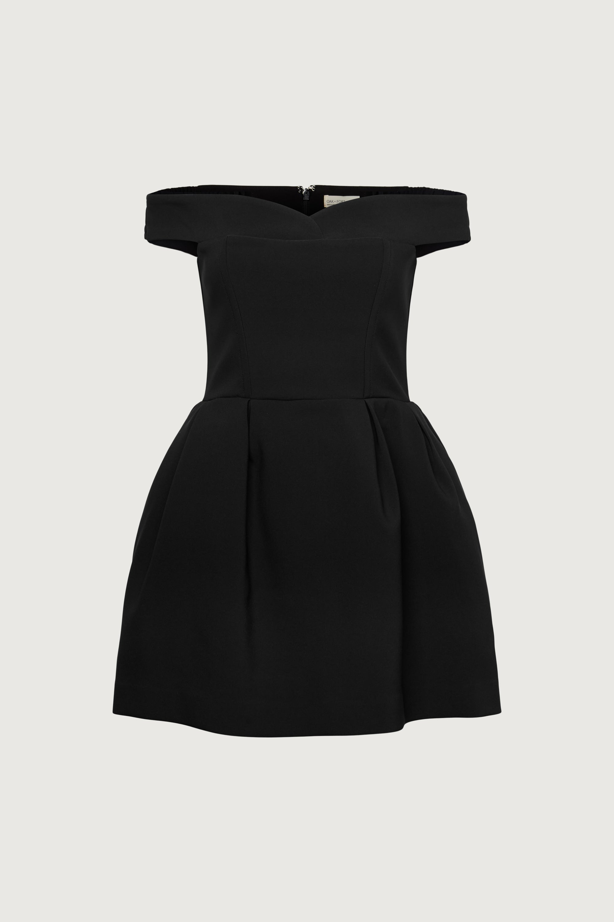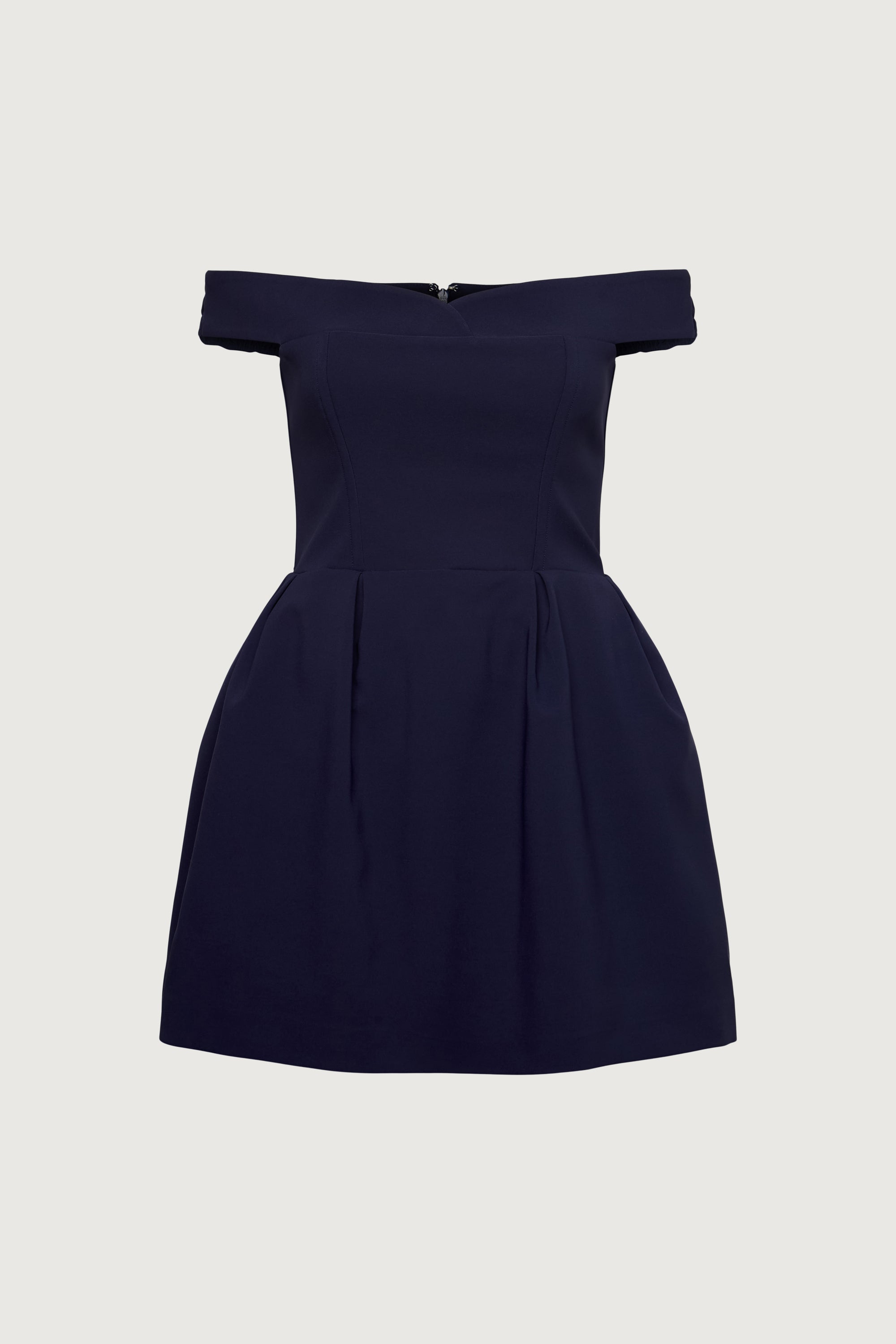 4-way stretch suiting fabric. Sweetheart neckline. Off the shoulder design. Fitted bodice. A-line skirt with pleats.