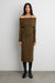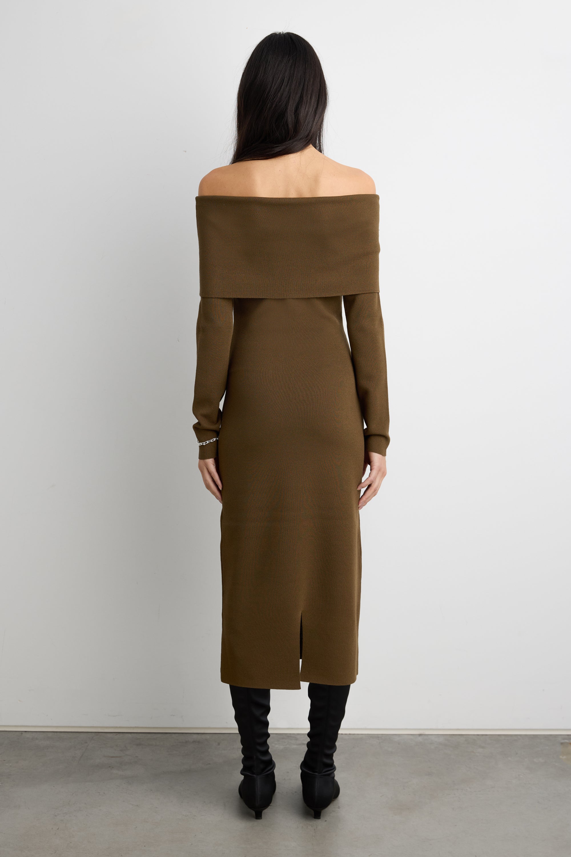 Ribbed jacquard knit. Off the shoulder design. Back slit.
