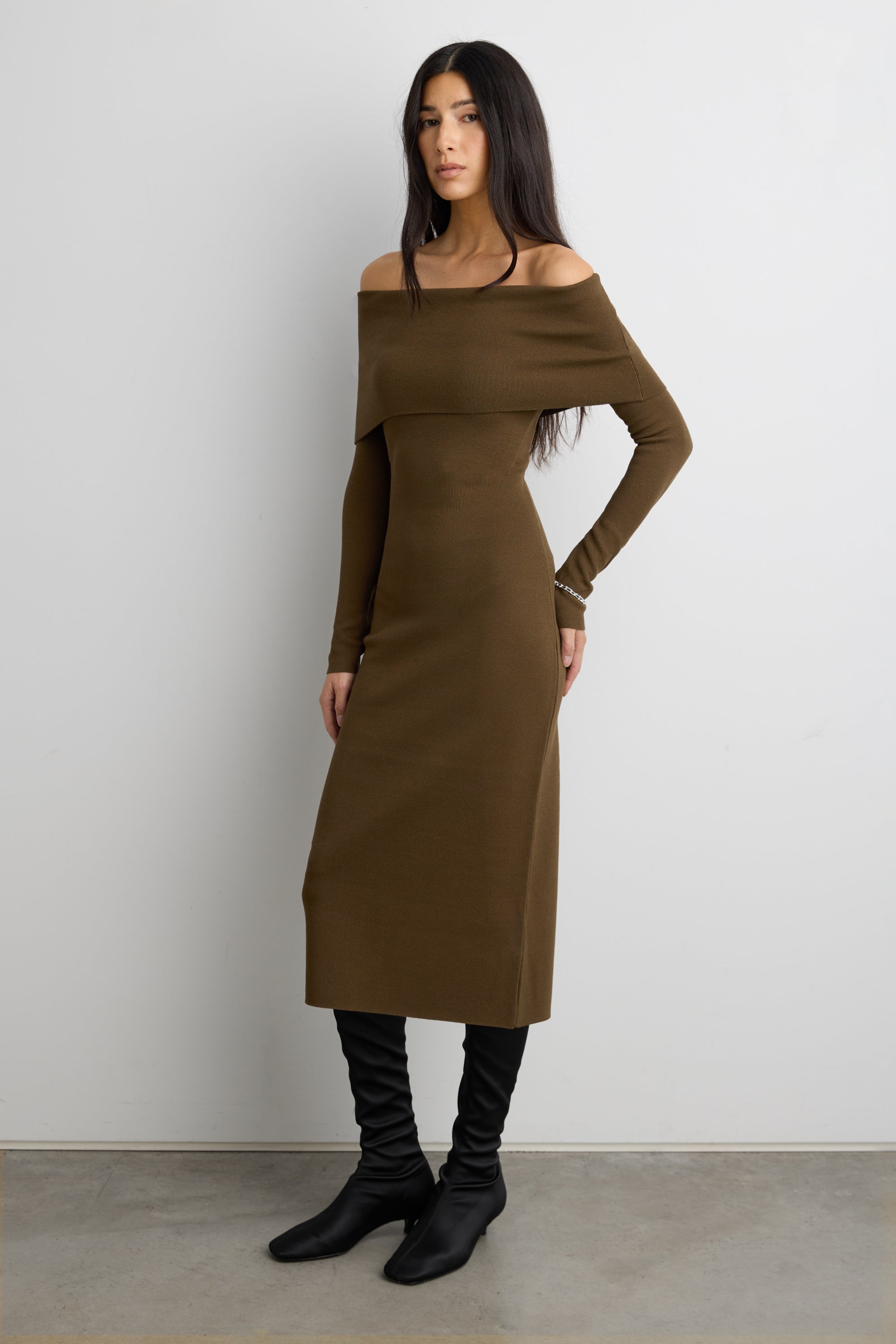 This jacquard knit long sleeve midi dress is made in a comfortable body-hugging fit. It has a off the shoulder foldover design and is versatile enough for the office or for your next occasion.
