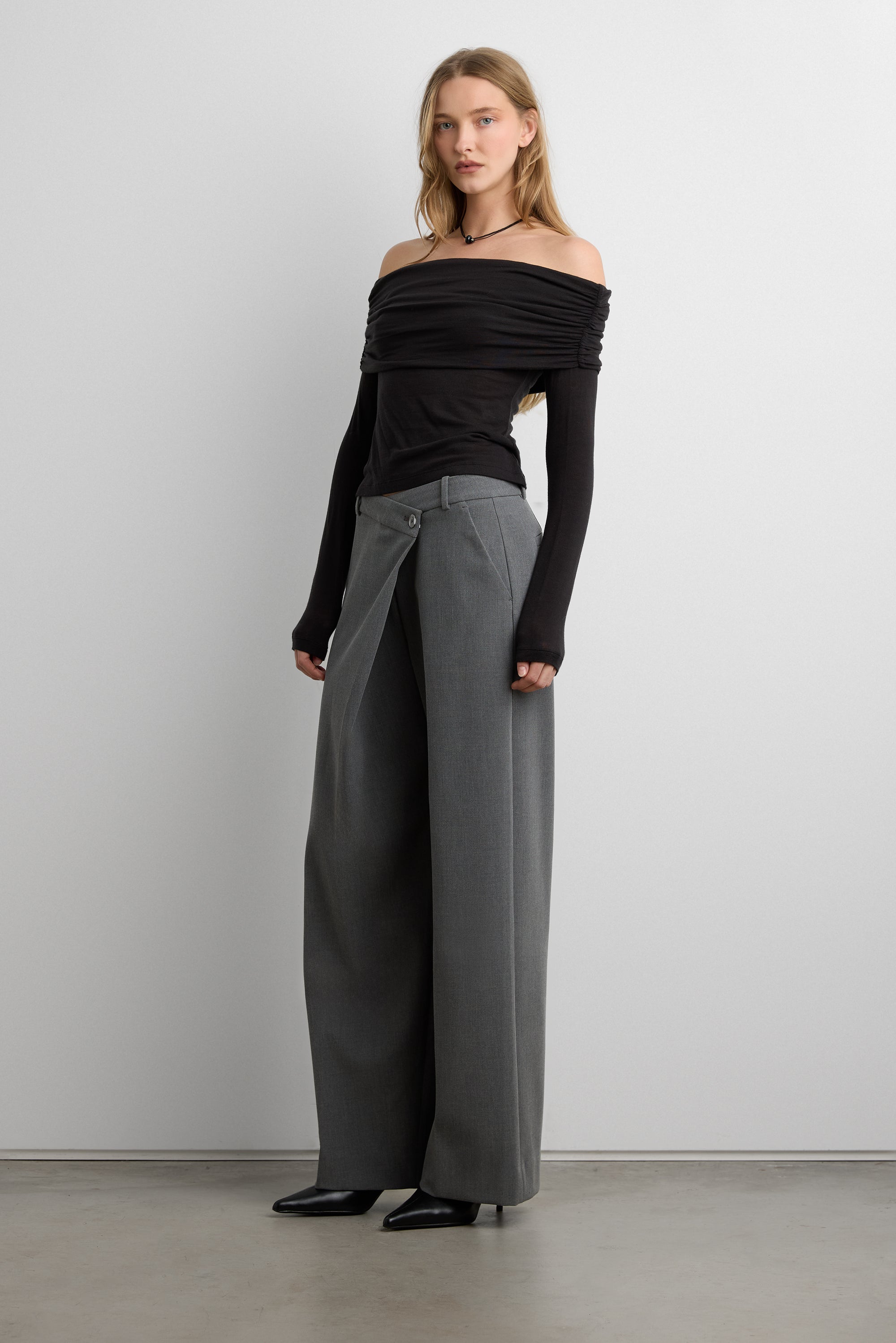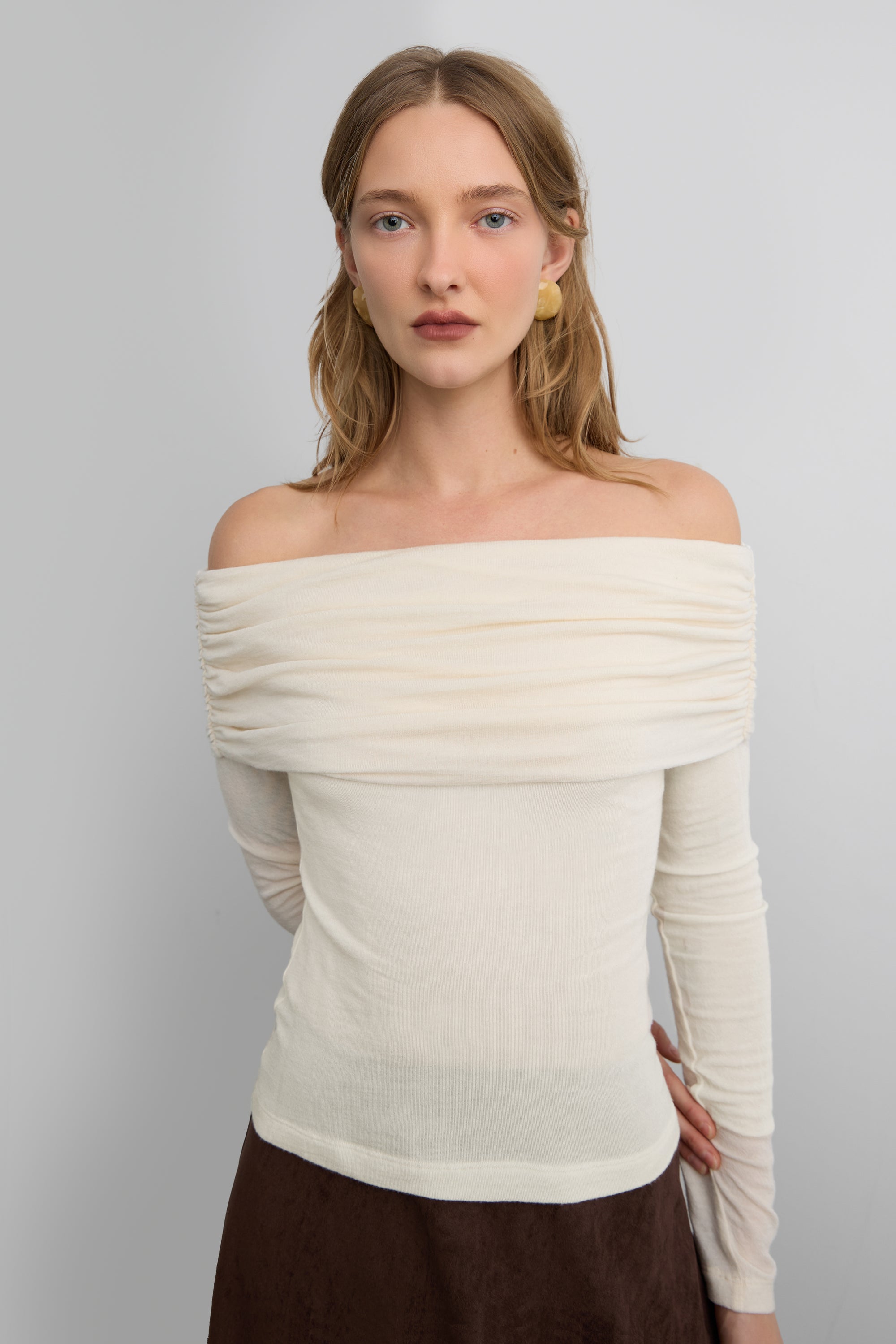 TENCEL™ LYOCELL. Fold-over off the shoulder design. Long sleeves.
