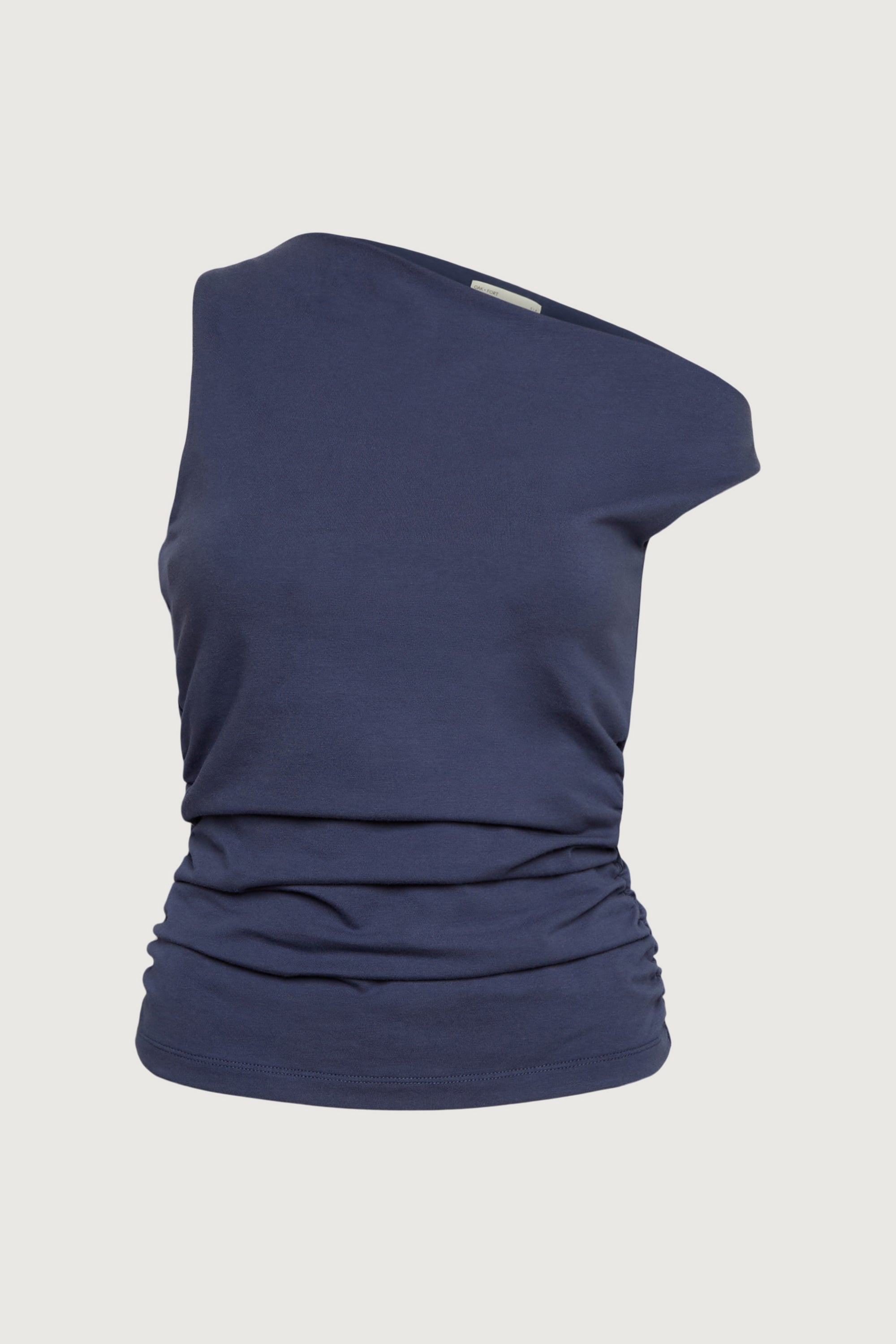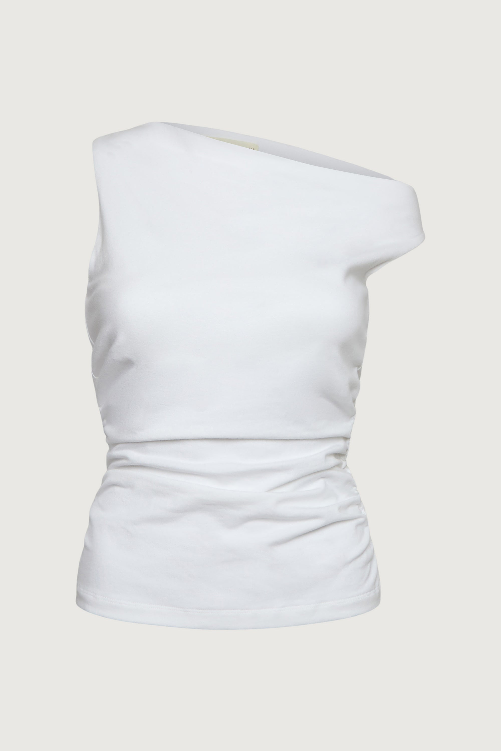 Cotton jersey. Off shoulder twisted design. Ruched details.