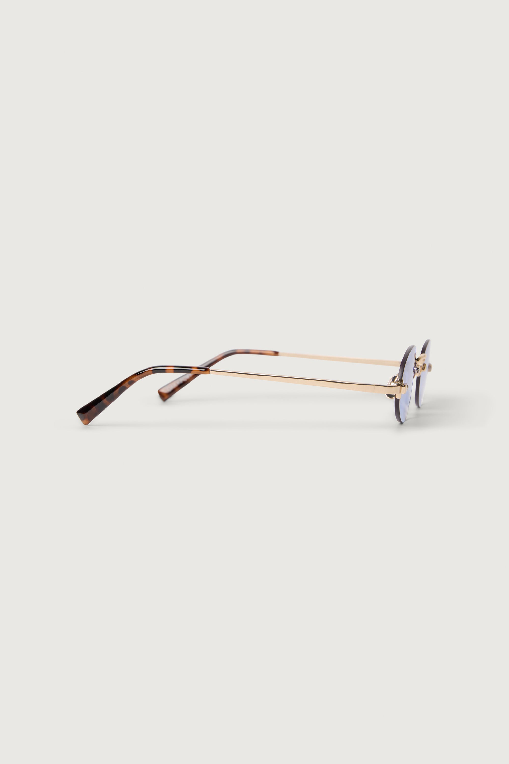 Rimless frame. Metal arms. Tinted lenses. 100% UV protection. Complimentary case and cleaning cloth.