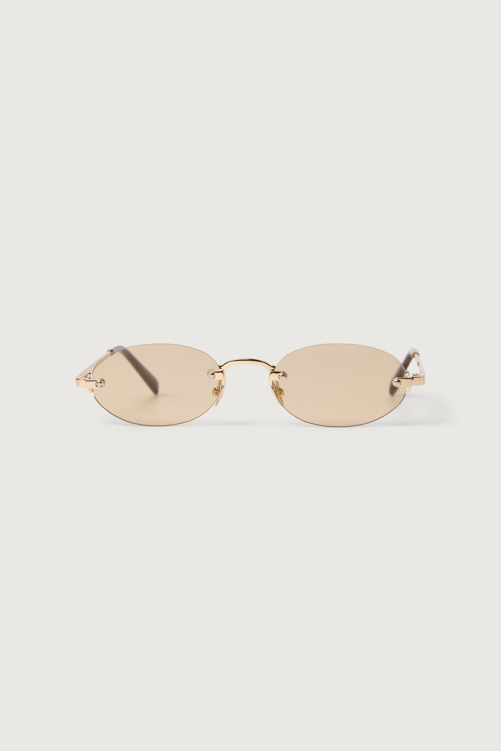Minimal and lightweight, these rimless sunglasses feature slender metal arms and softly tinted lenses. Their sleek, modern design offers a refined touch that elevates any look from day to evening.