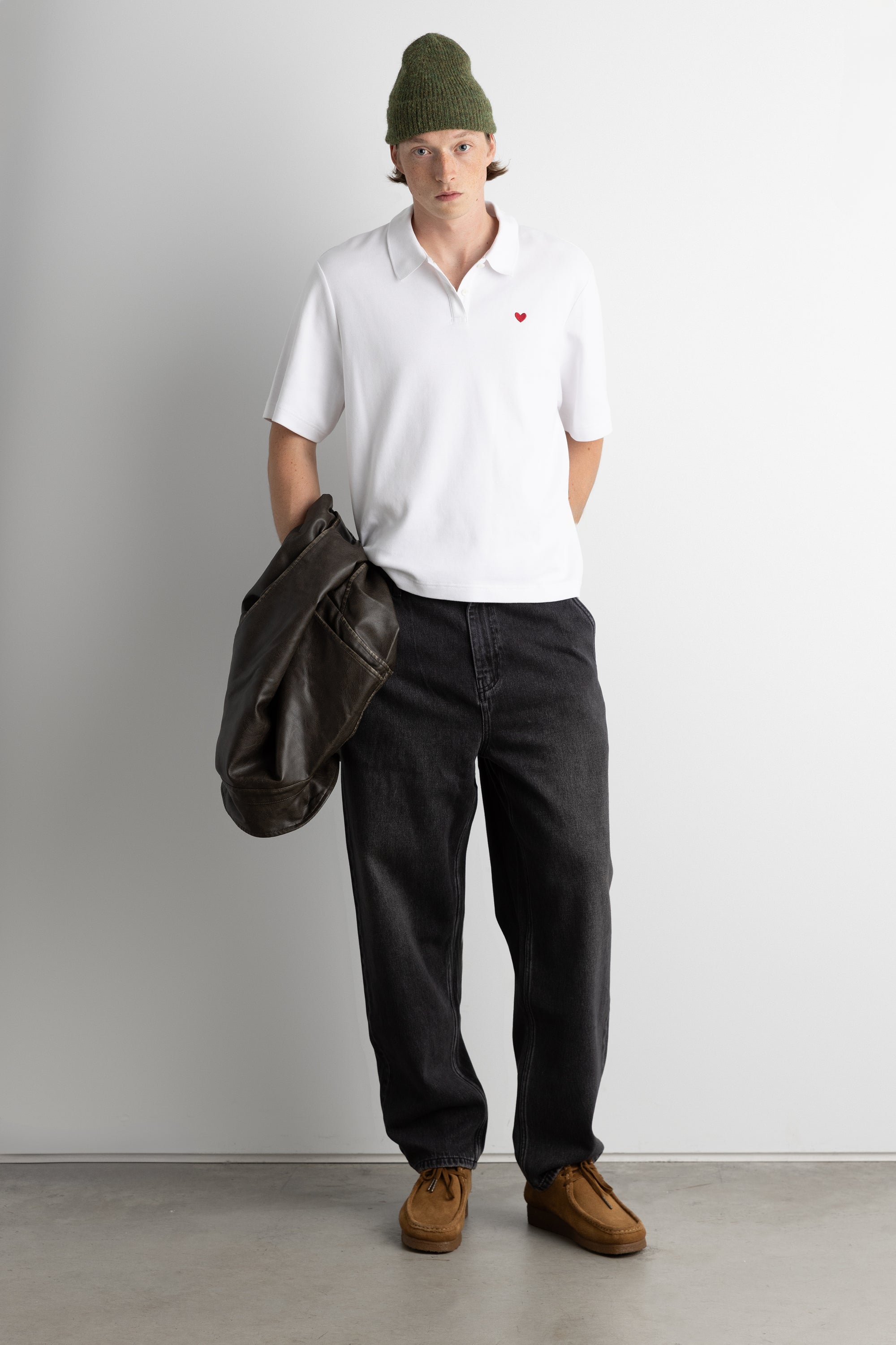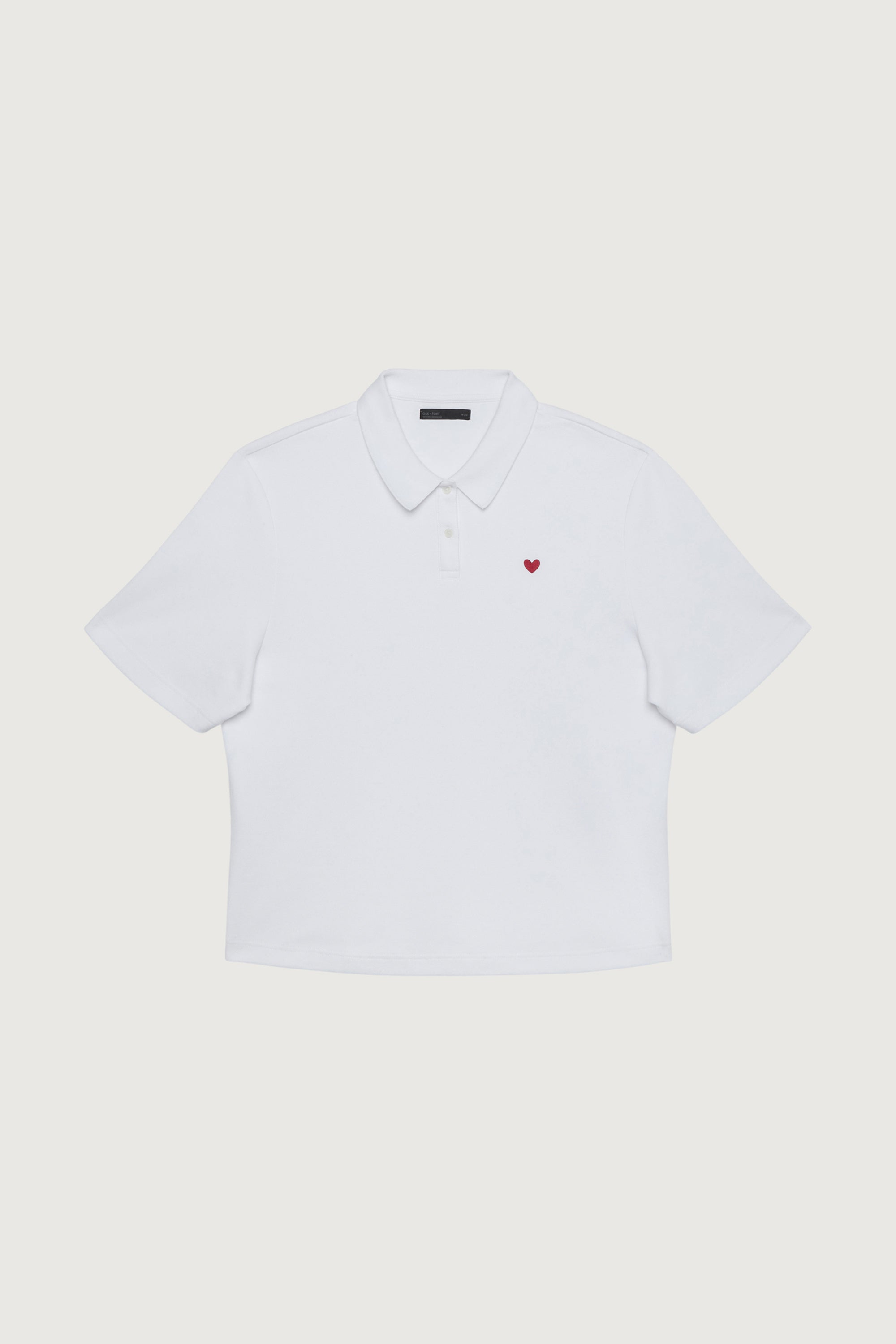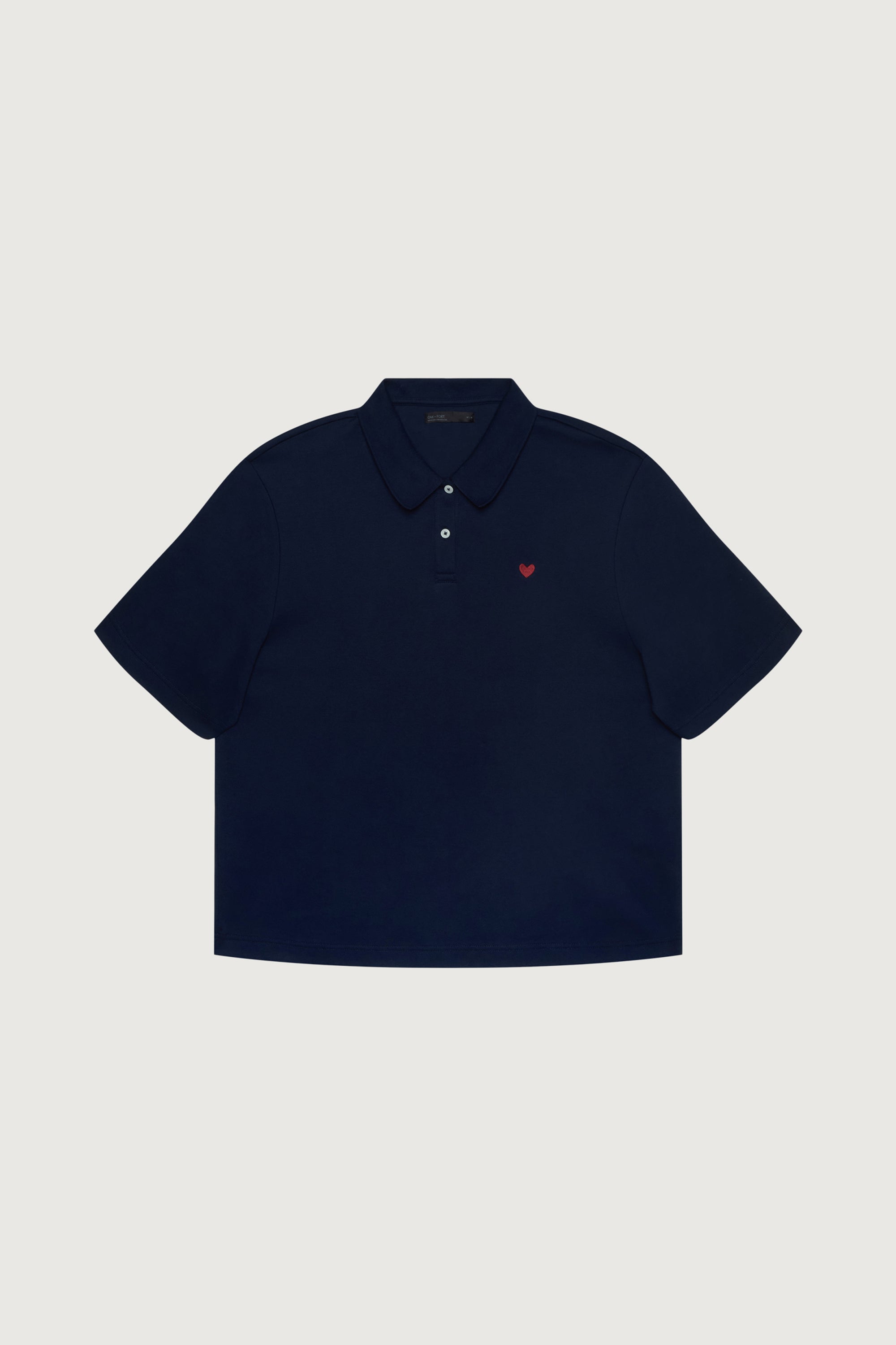Oversized fit. Cotton blend fabric . Ribbed quarter button up collar. Tiny heart embroidery. 27” based on size M.