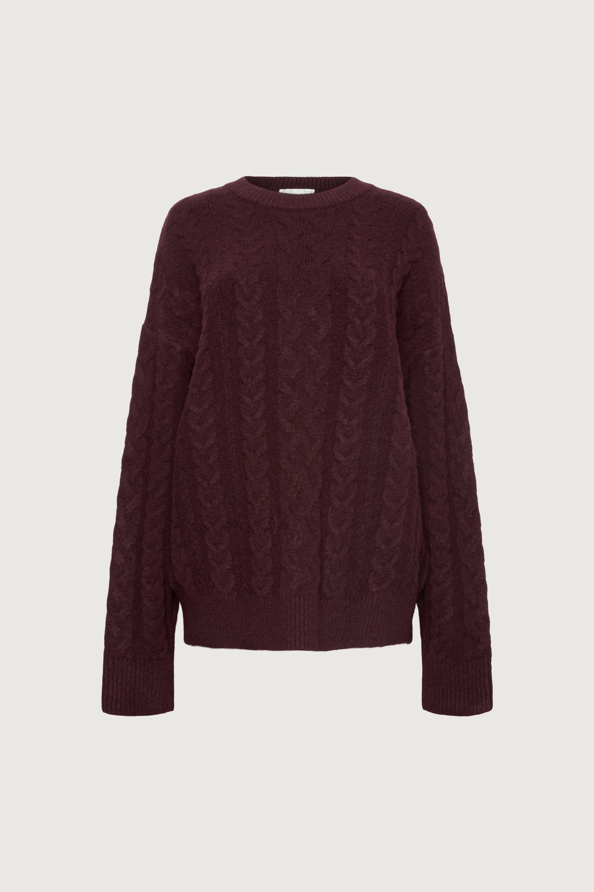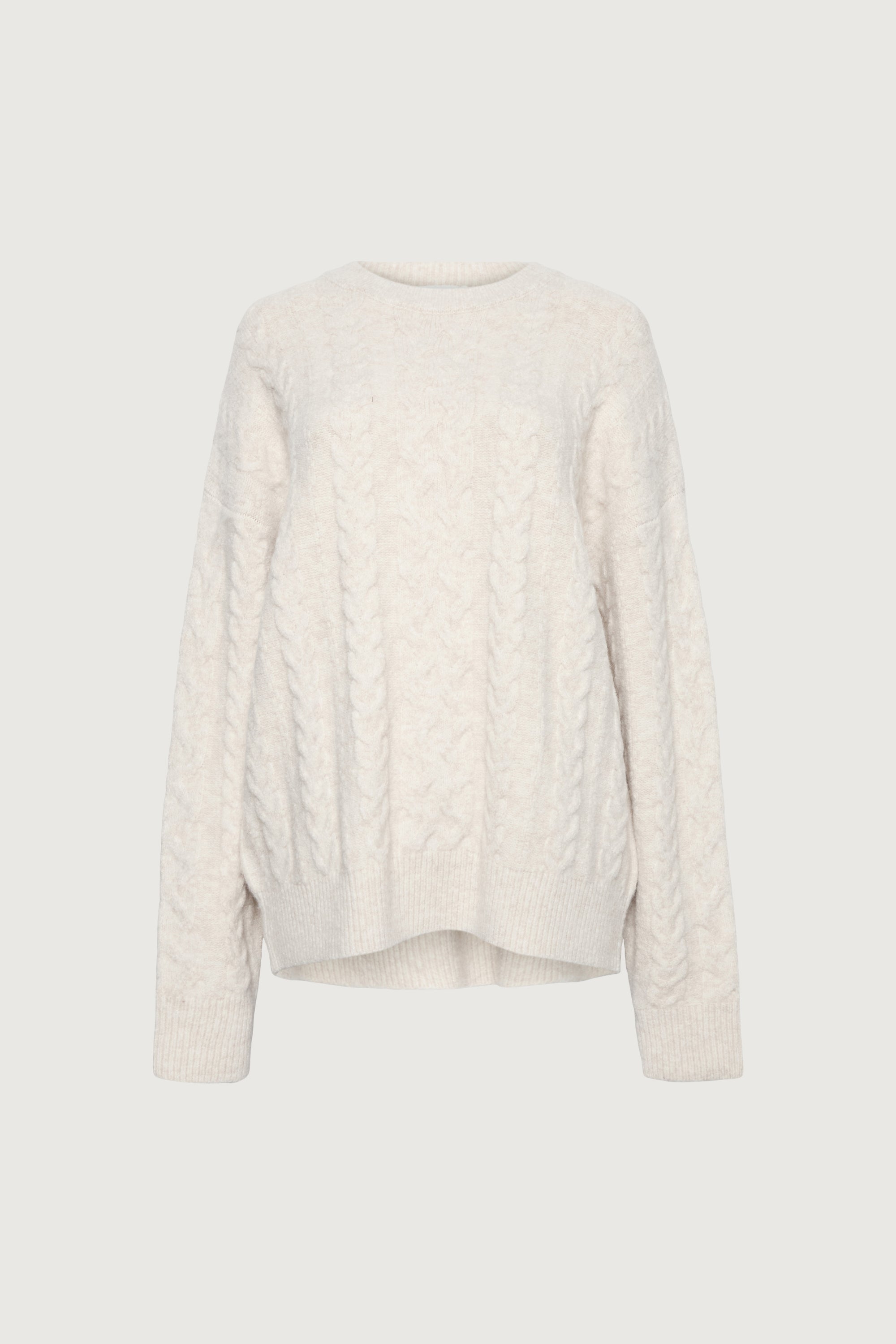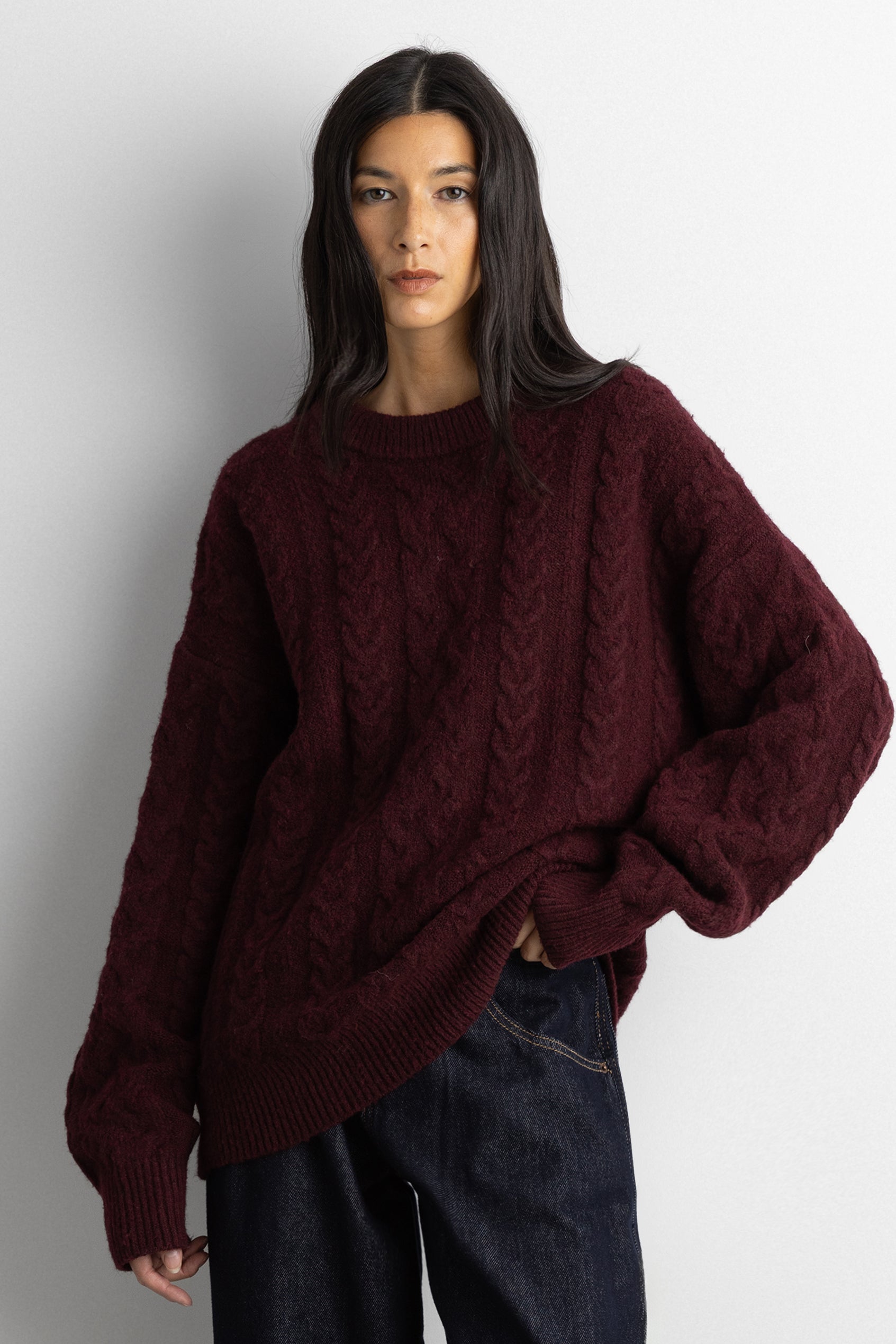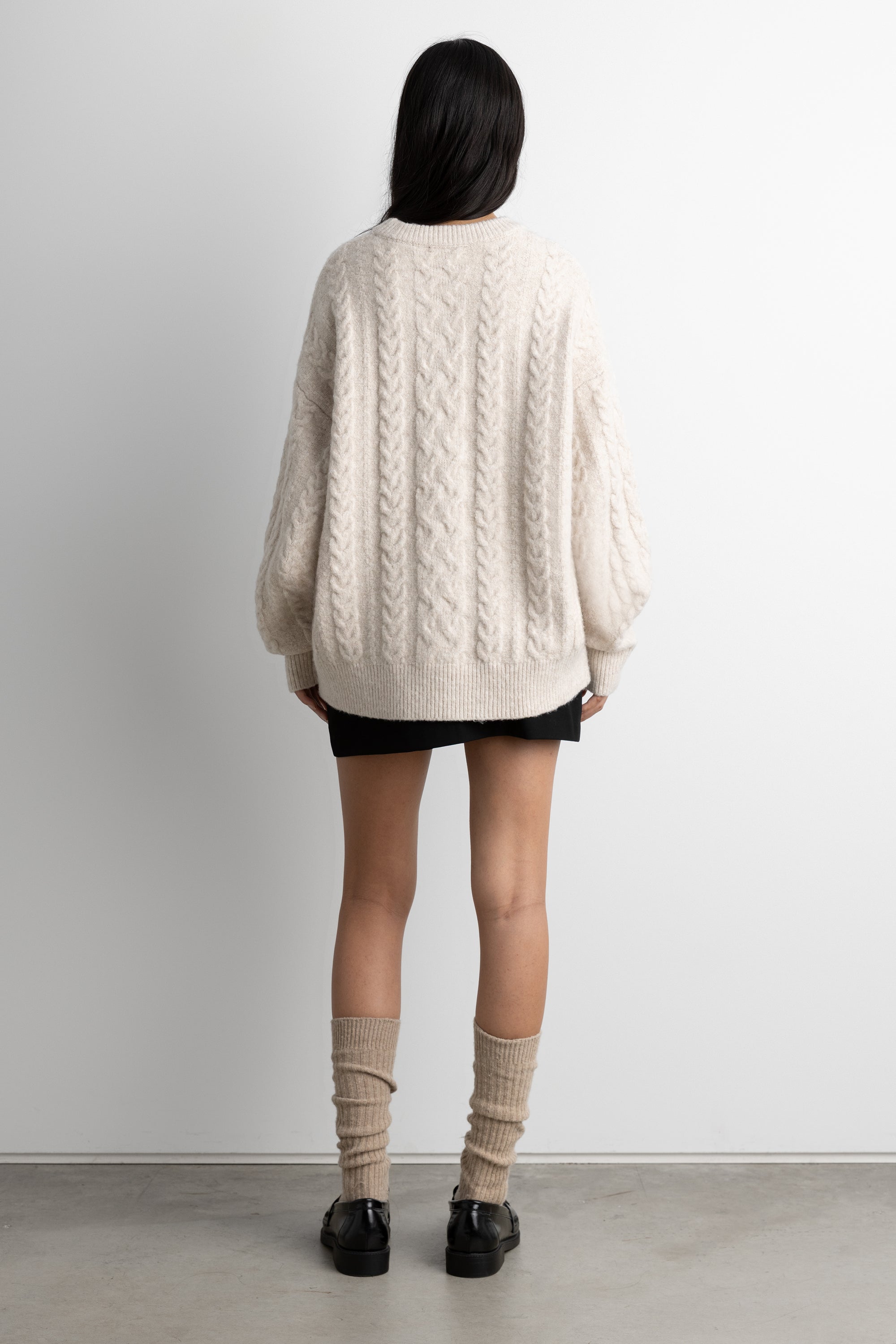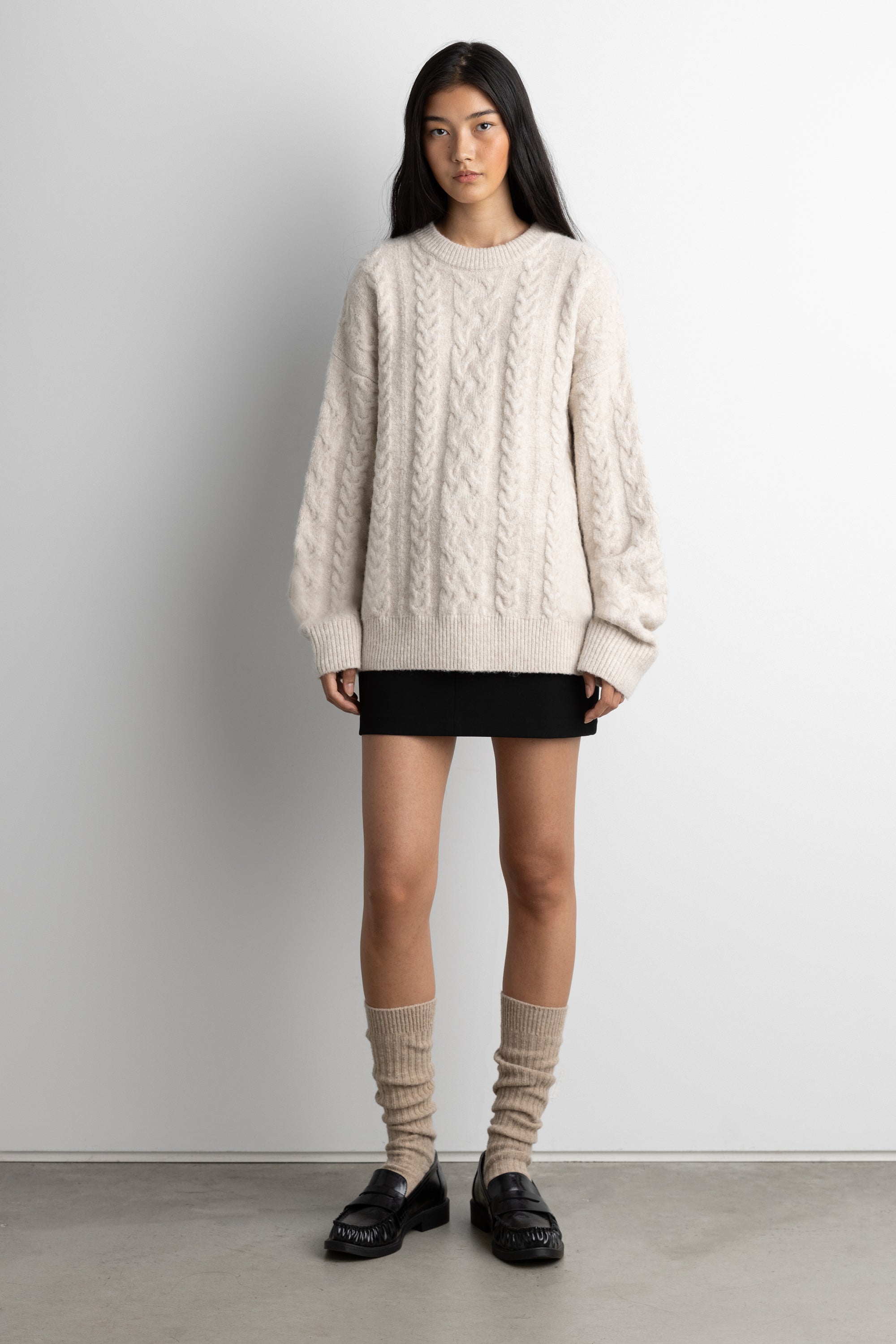 Cable knit. Crew neckline. Dropped shoulders. Ribbed trims.