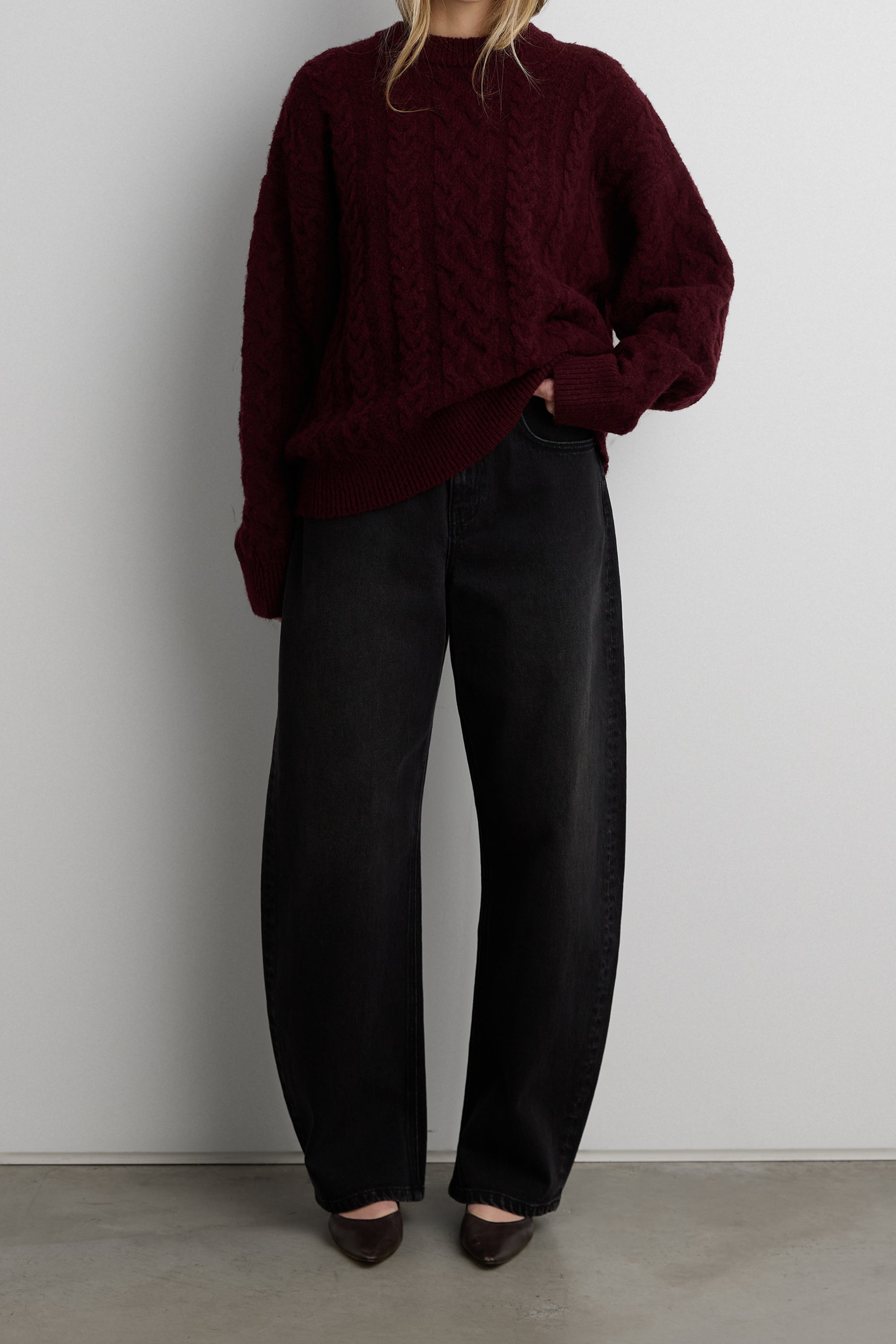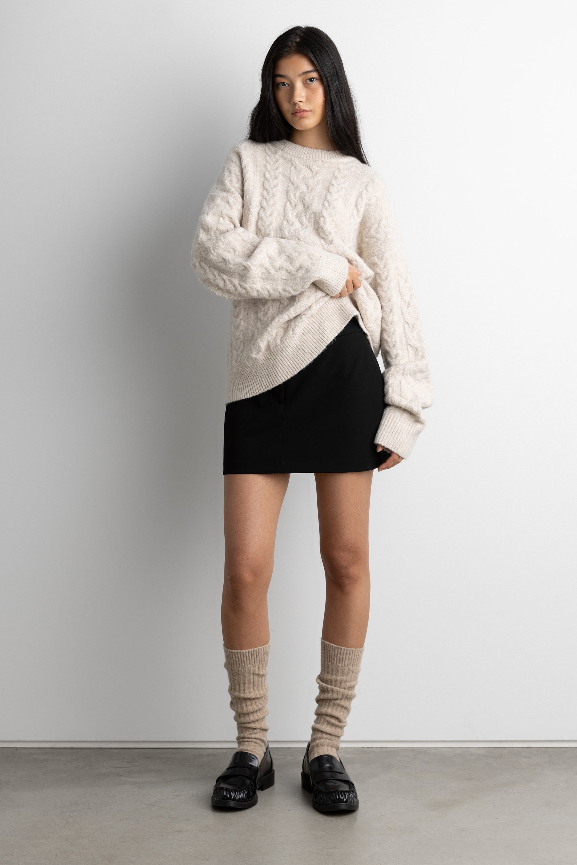 This crewneck cable knit sweater is made with touches of wool for added warmth that is perfect for the seasons ahead. It has dropped shoulders and ribbed trims for added detail. A wardrobe staple that is versatile enough to wear around the house with knit pants or pair it with a skirt and boots.