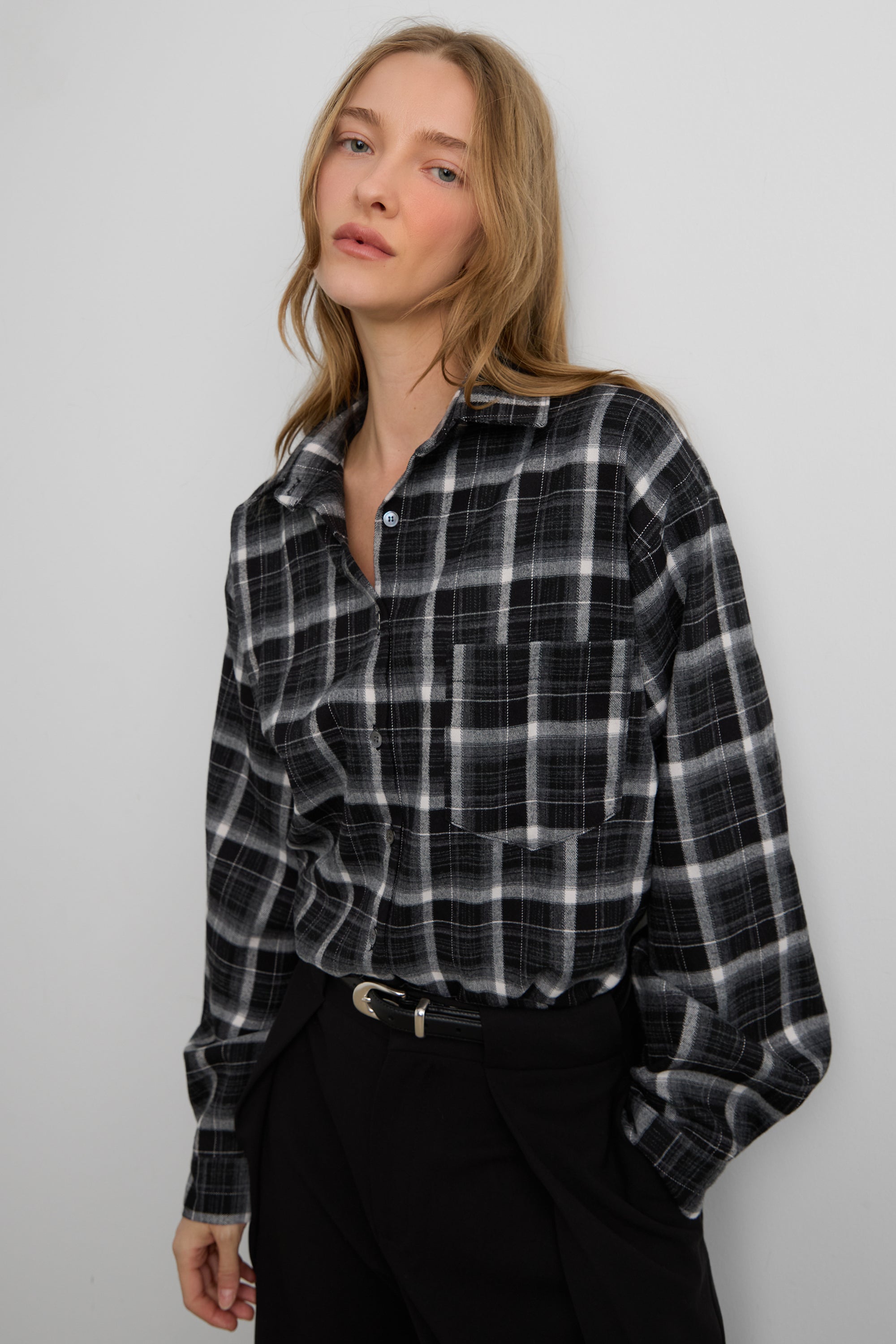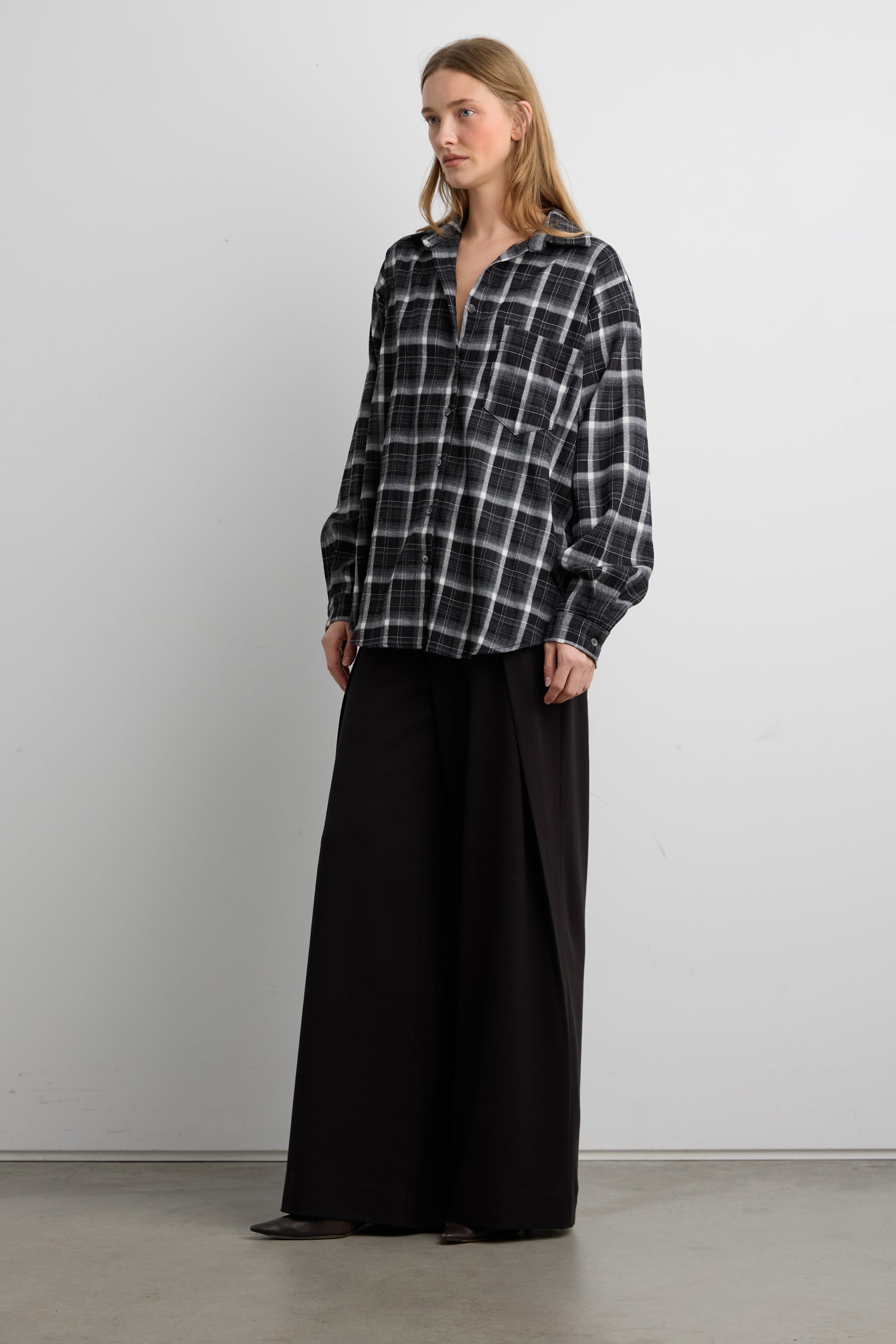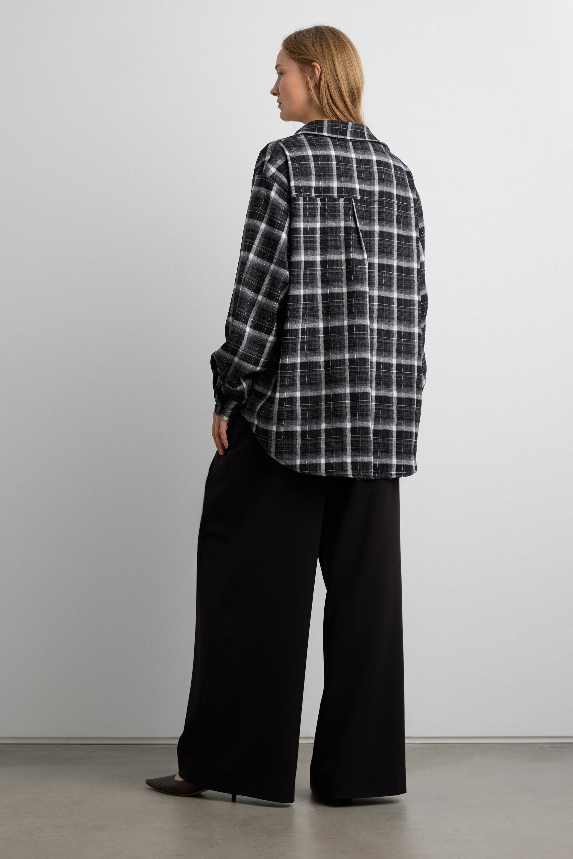 This oversized flannel shirt is crafted in a soft brushed fabric with a classic plaid pattern. Designed with dropped shoulders and a relaxed silhouette, it offers easy layering and all-day comfort. Finished with a button-front closure and chest pockets, it's a versatile staple that pairs effortlessly with denim, trousers, and outerwear.