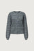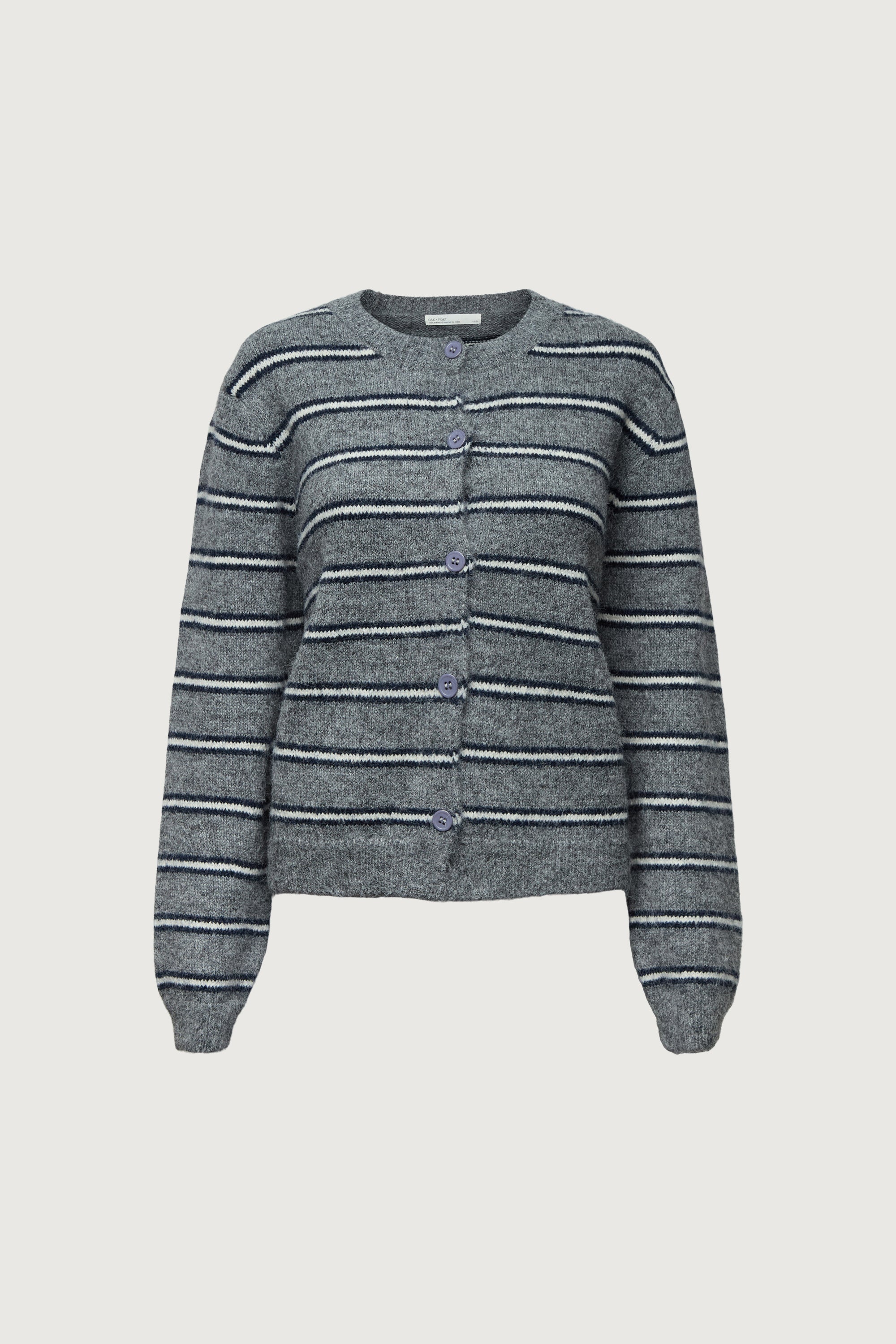 Striped knit. Crew neckline. Tonal buttons. Ribbed trims. Dropped shoulder.