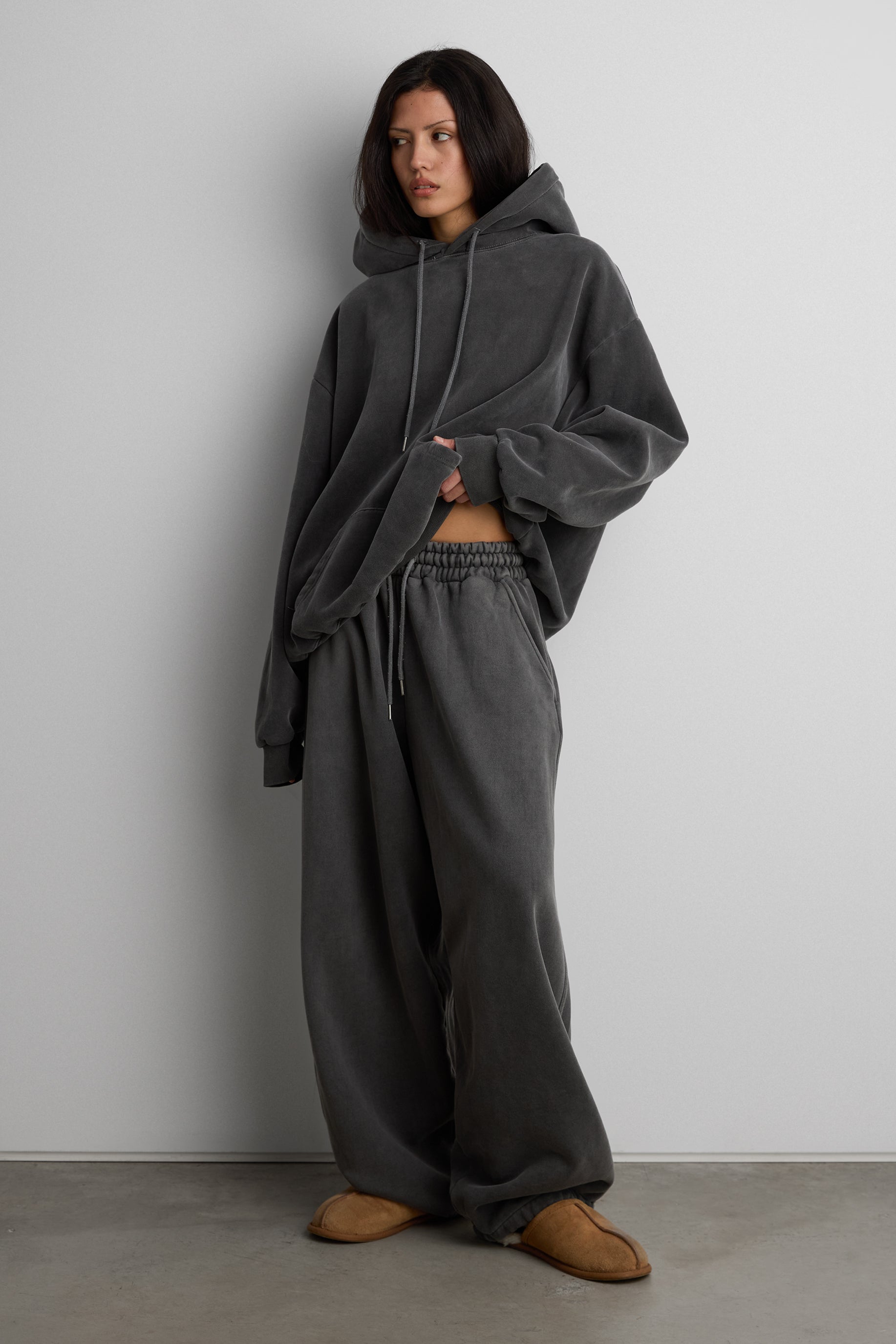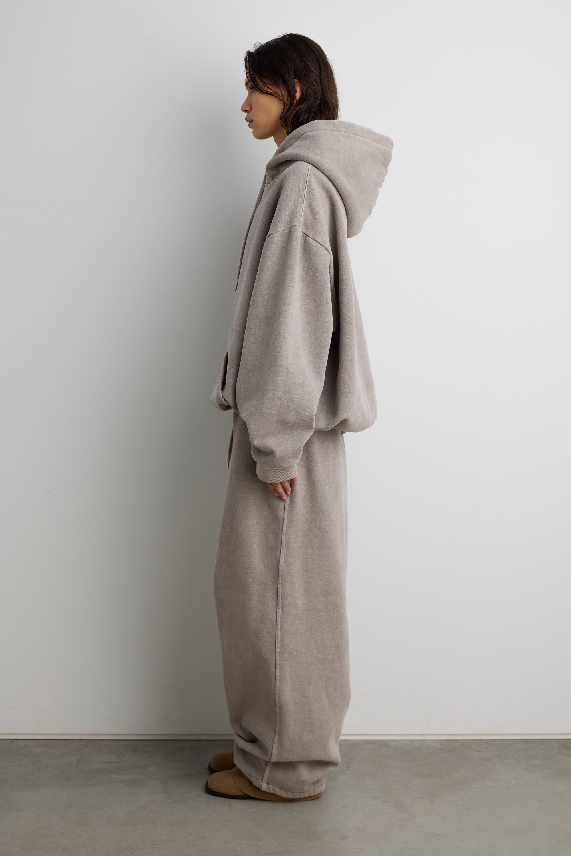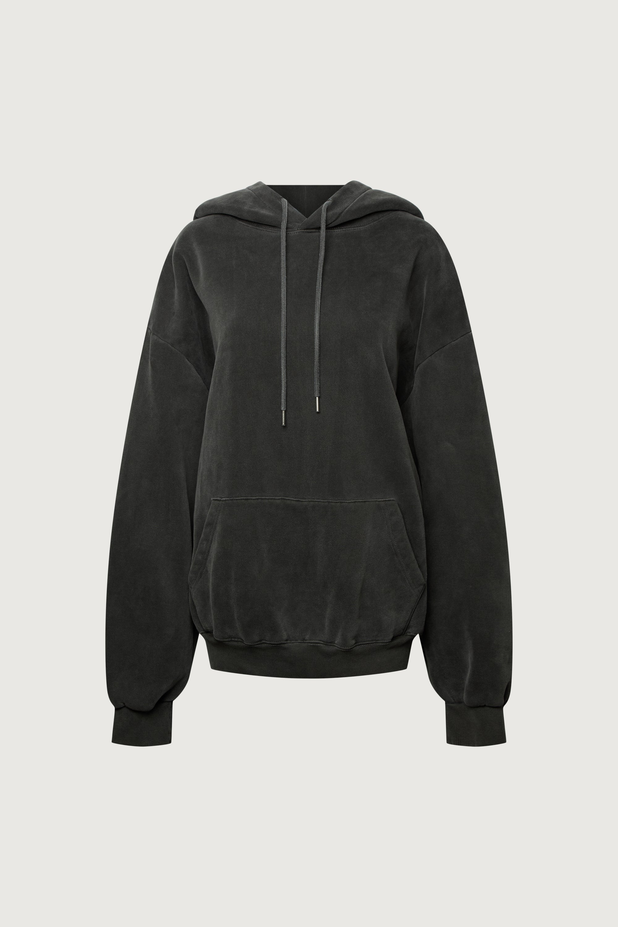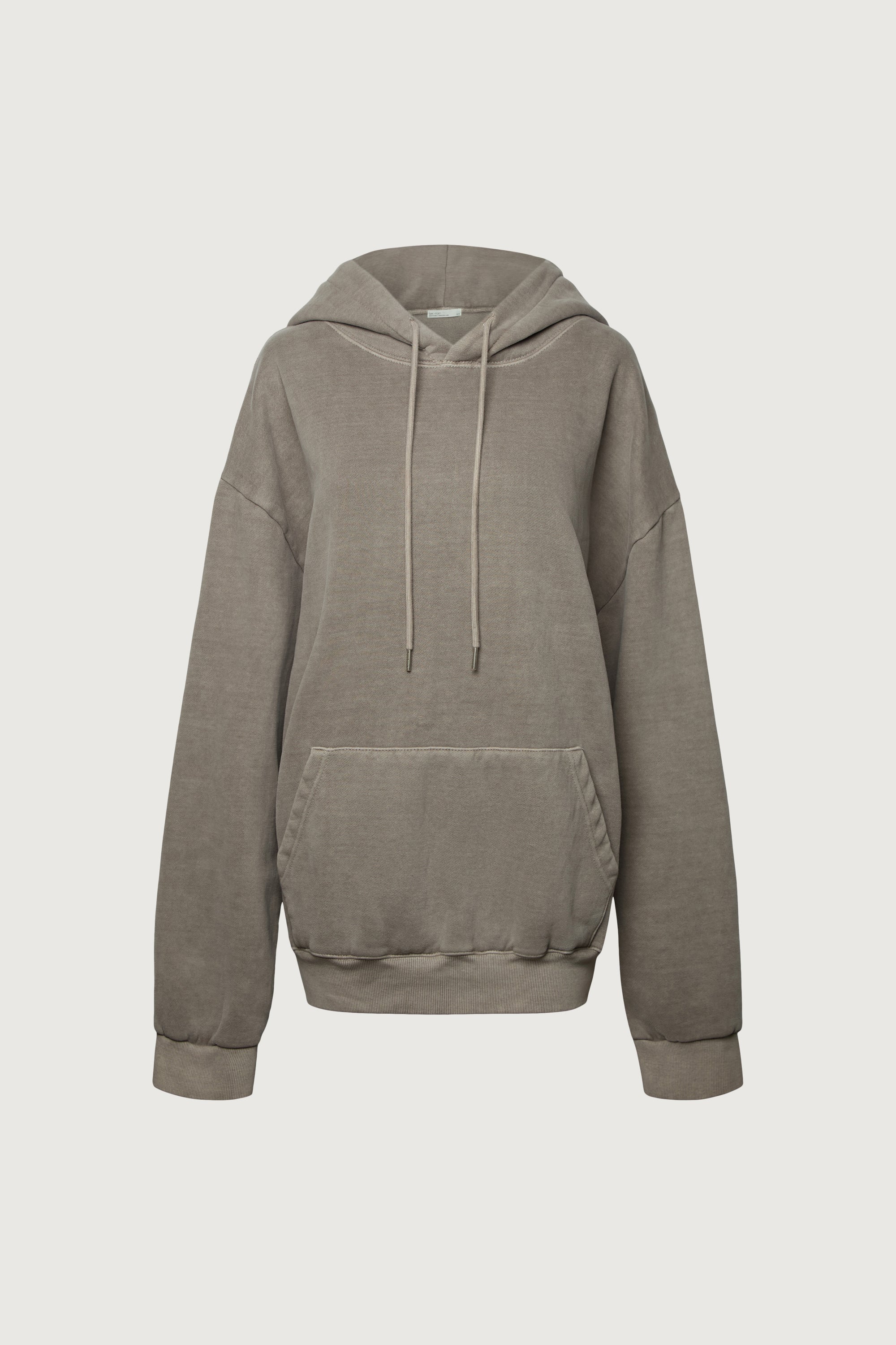 This fleece studio boyfriend hoodie is crafted from a soft, brushed heavyweight cotton blend with a vintage wash finish for a worn-in, lived-in feel. It's fleece lined for added warmth and is designed with dropped shoulders, a roomy hood, and a front kangaroo pocket, it delivers effortless comfort for everyday wear. Style it with matching sweatpants or denim for an easy off-duty look.