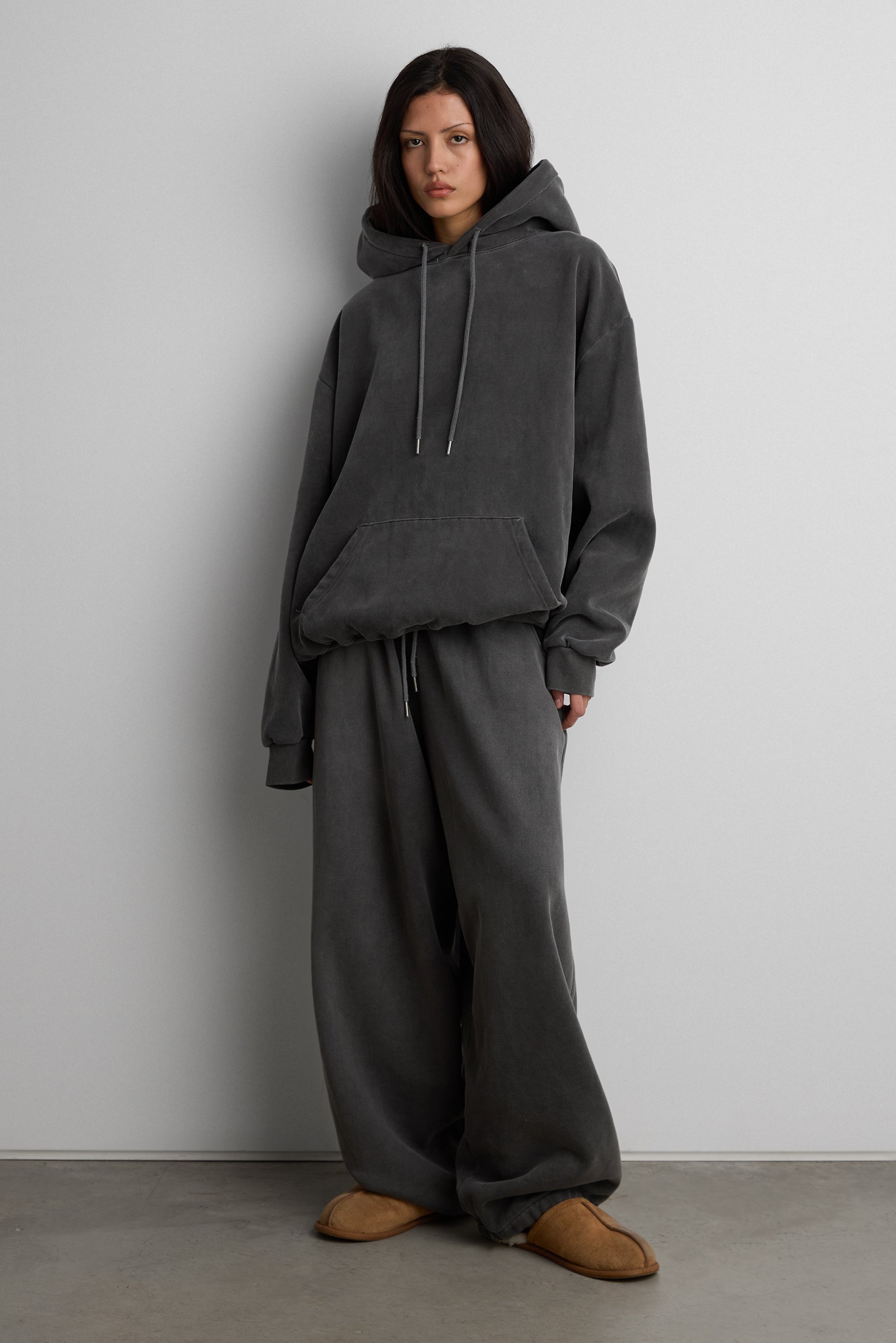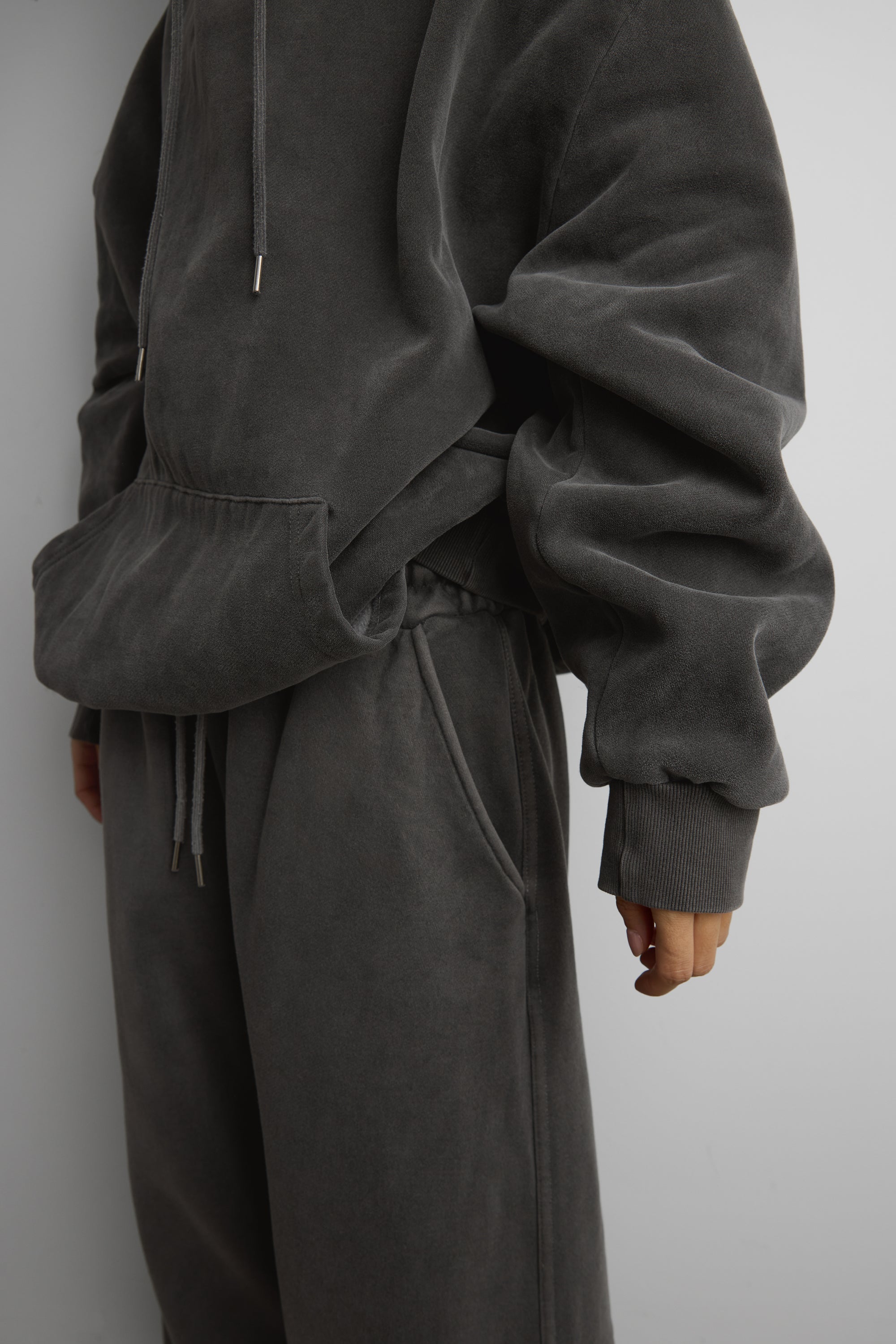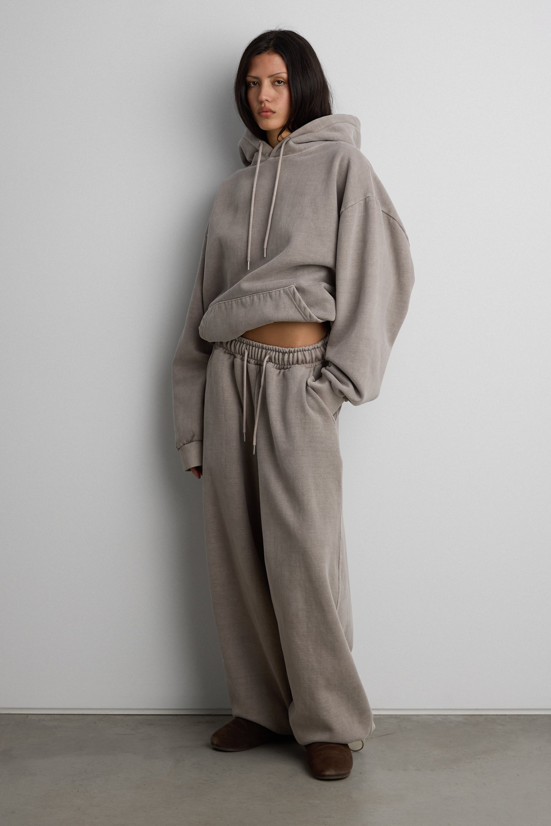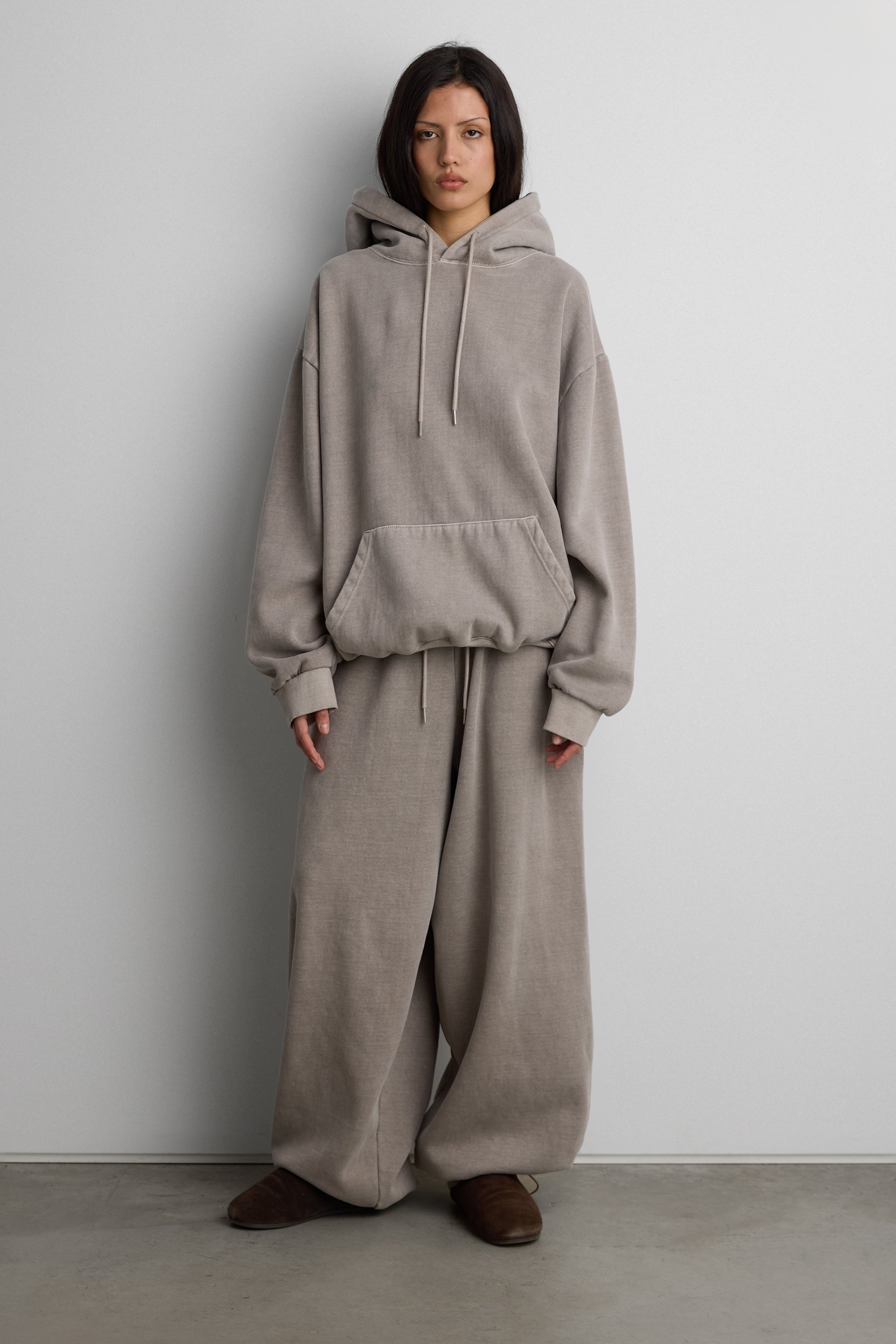 This fleece studio boyfriend hoodie is crafted from a soft, brushed heavyweight cotton blend with a vintage wash finish for a worn-in, lived-in feel. It's fleece lined for added warmth and is designed with dropped shoulders, a roomy hood, and a front kangaroo pocket, it delivers effortless comfort for everyday wear. Style it with matching sweatpants or denim for an easy off-duty look.
