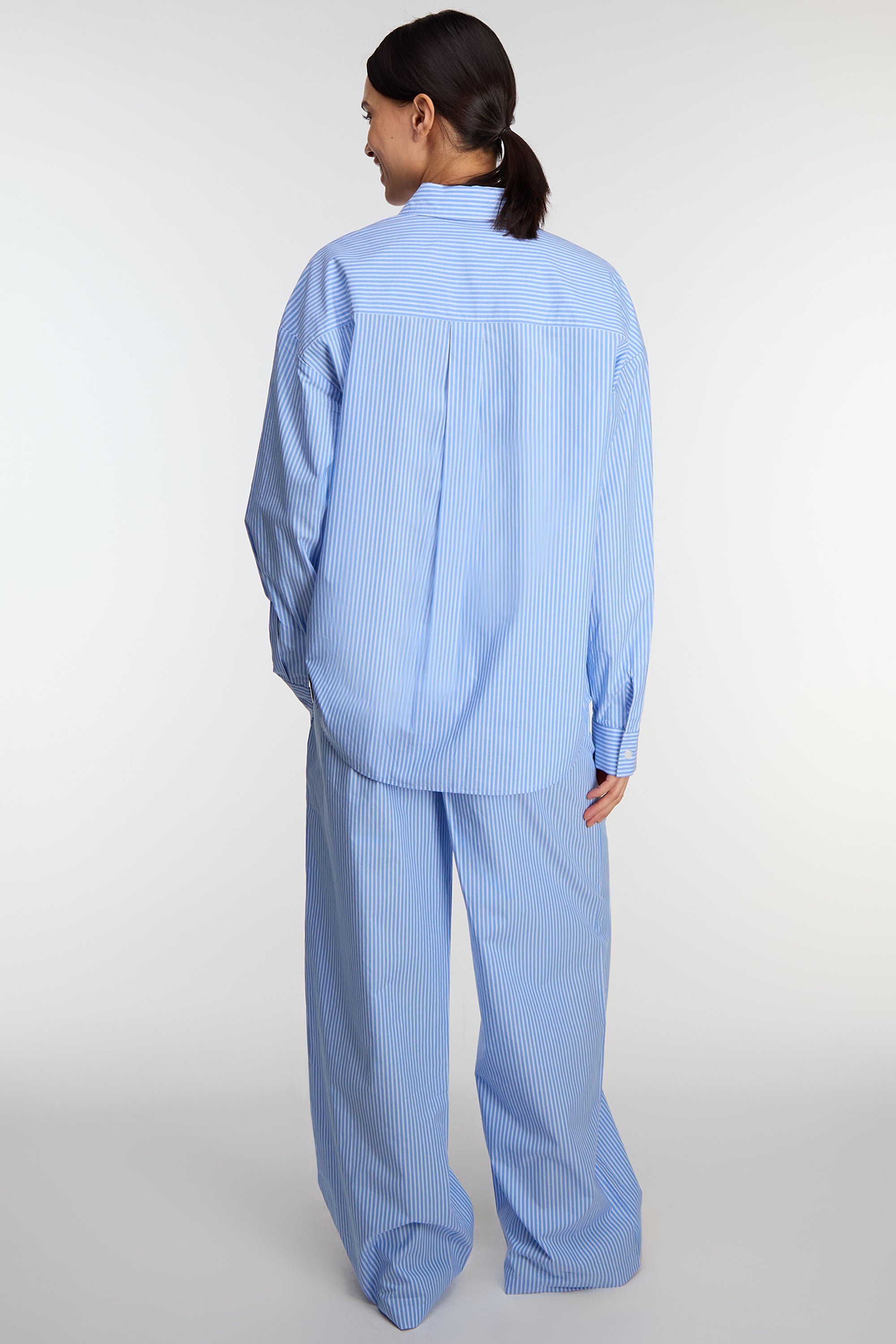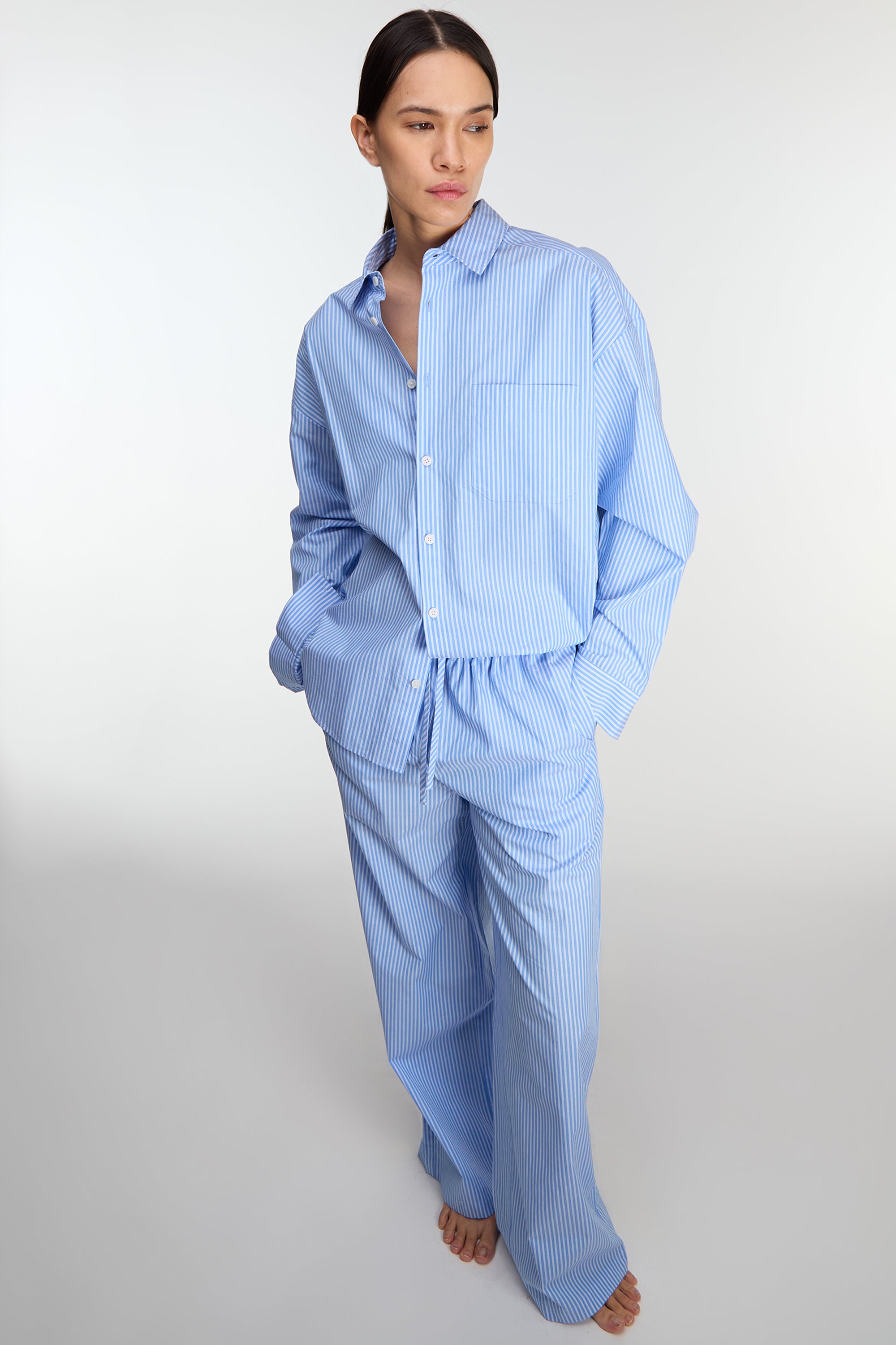 This button up shirt is made in an oversized fit cut from a lightweight striped cotton poplin. An easy go-to you can wear in any season, wear yours with the matching pant or short for the warmer weather ahead.