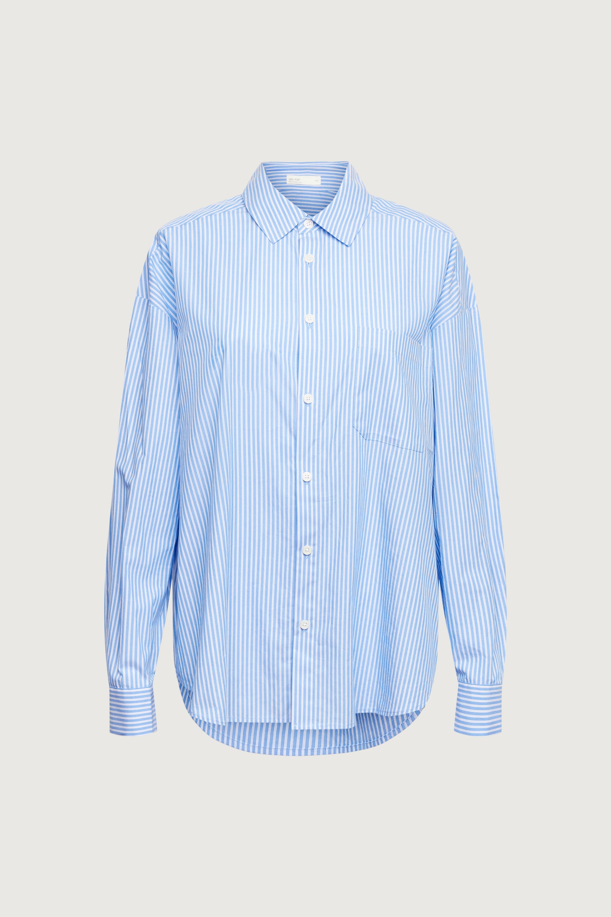 Lightweight striped cotton poplin. Collared neckline. Button front. Dropped shoulders. Front patch pocket. Curved hem.