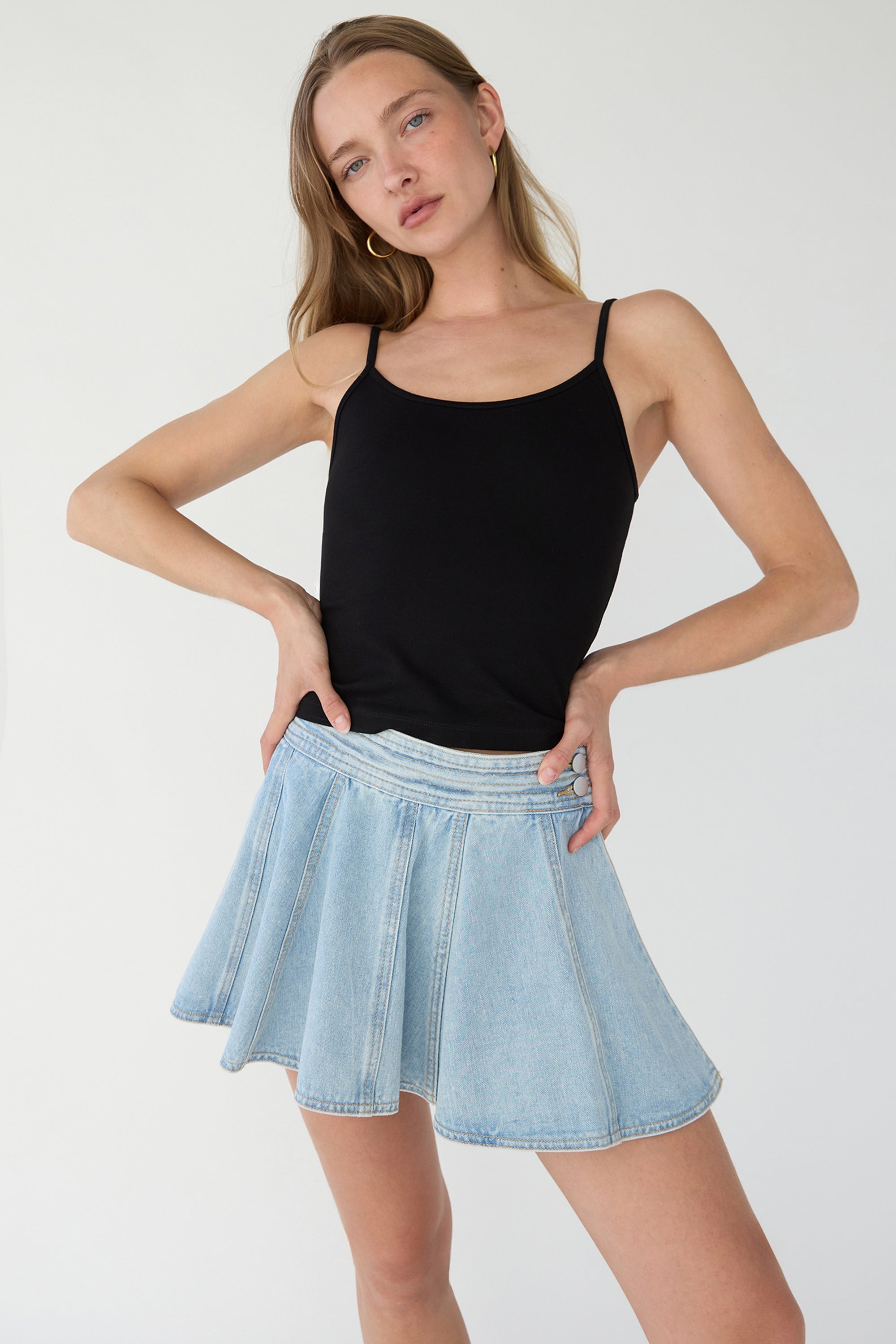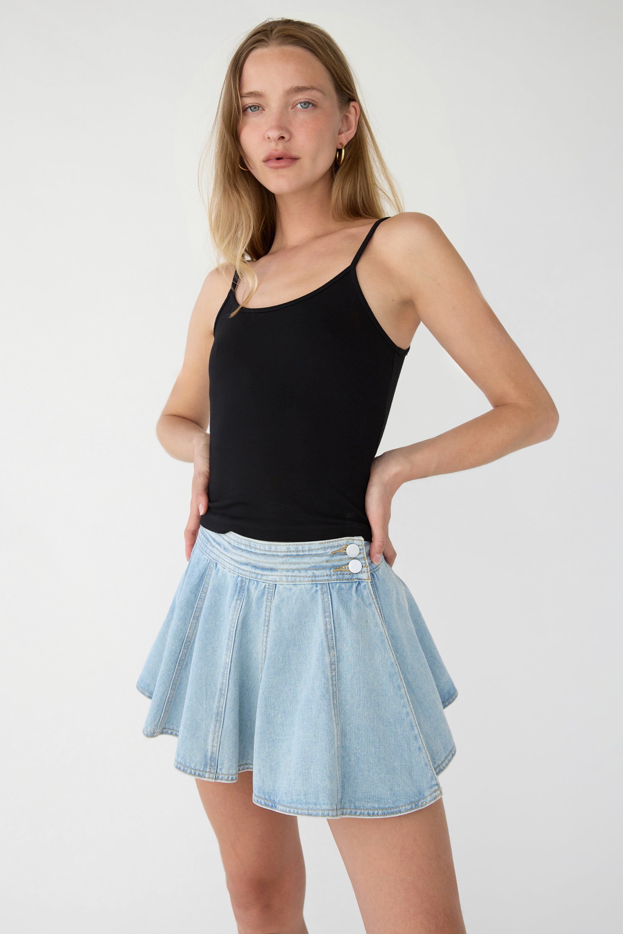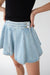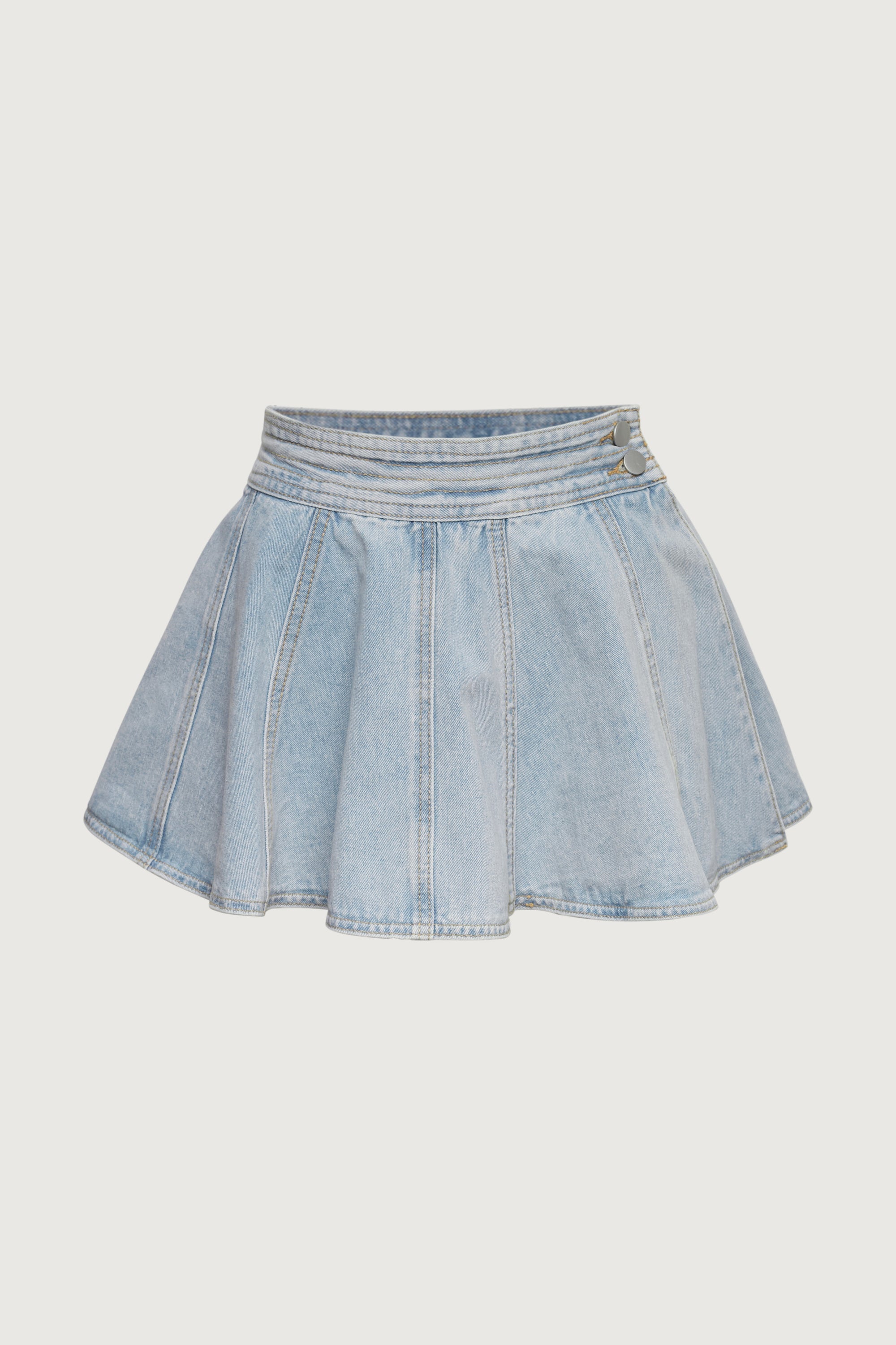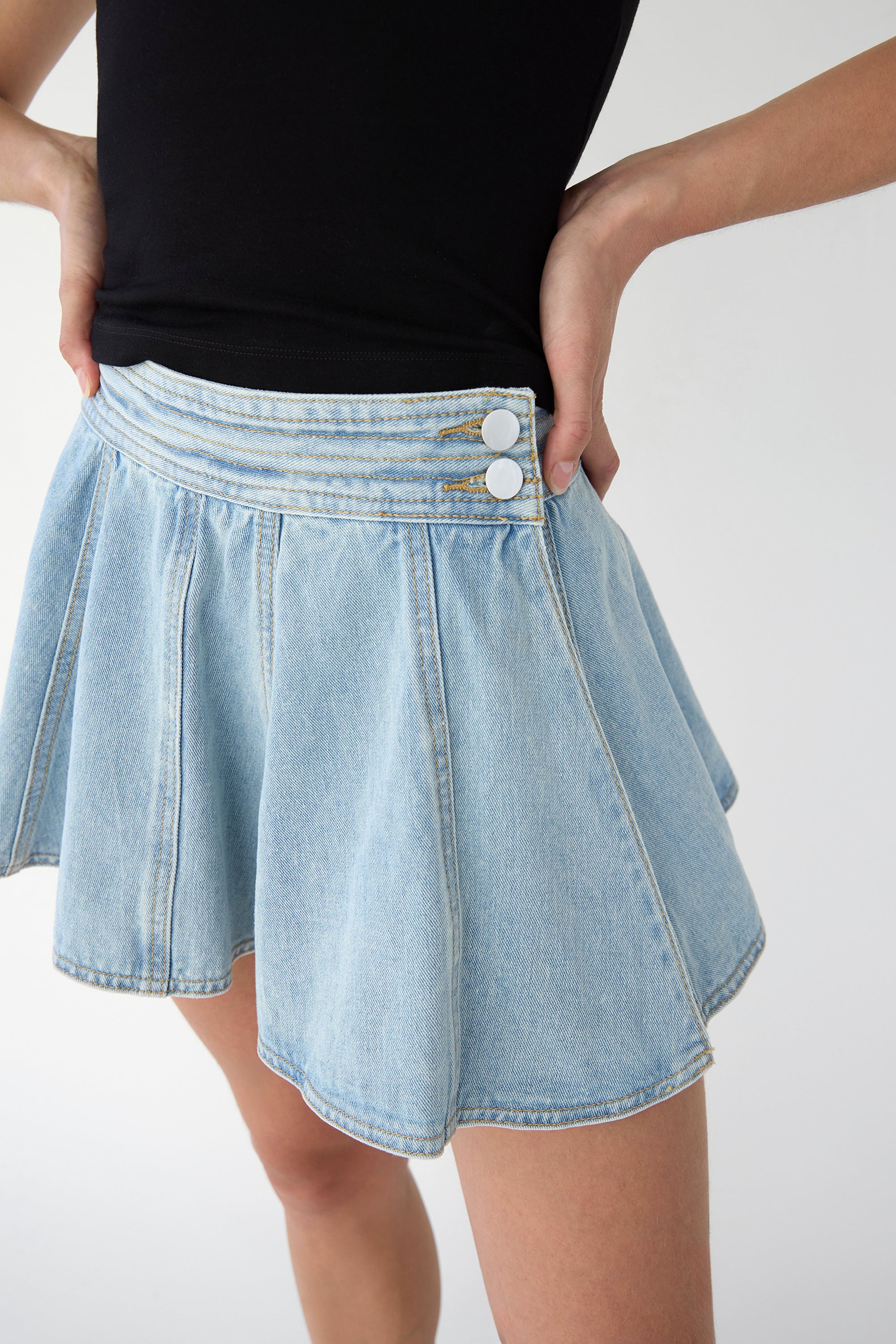 Designed for those who love a feminine silhouette without sacrificing comfort, this skort features crisp pleats, built-in shorts for added coverage, and a convenient snap button waist. Made with high-quality, breathable denim, this mini skort delivers structure without compensating comfort and movement.