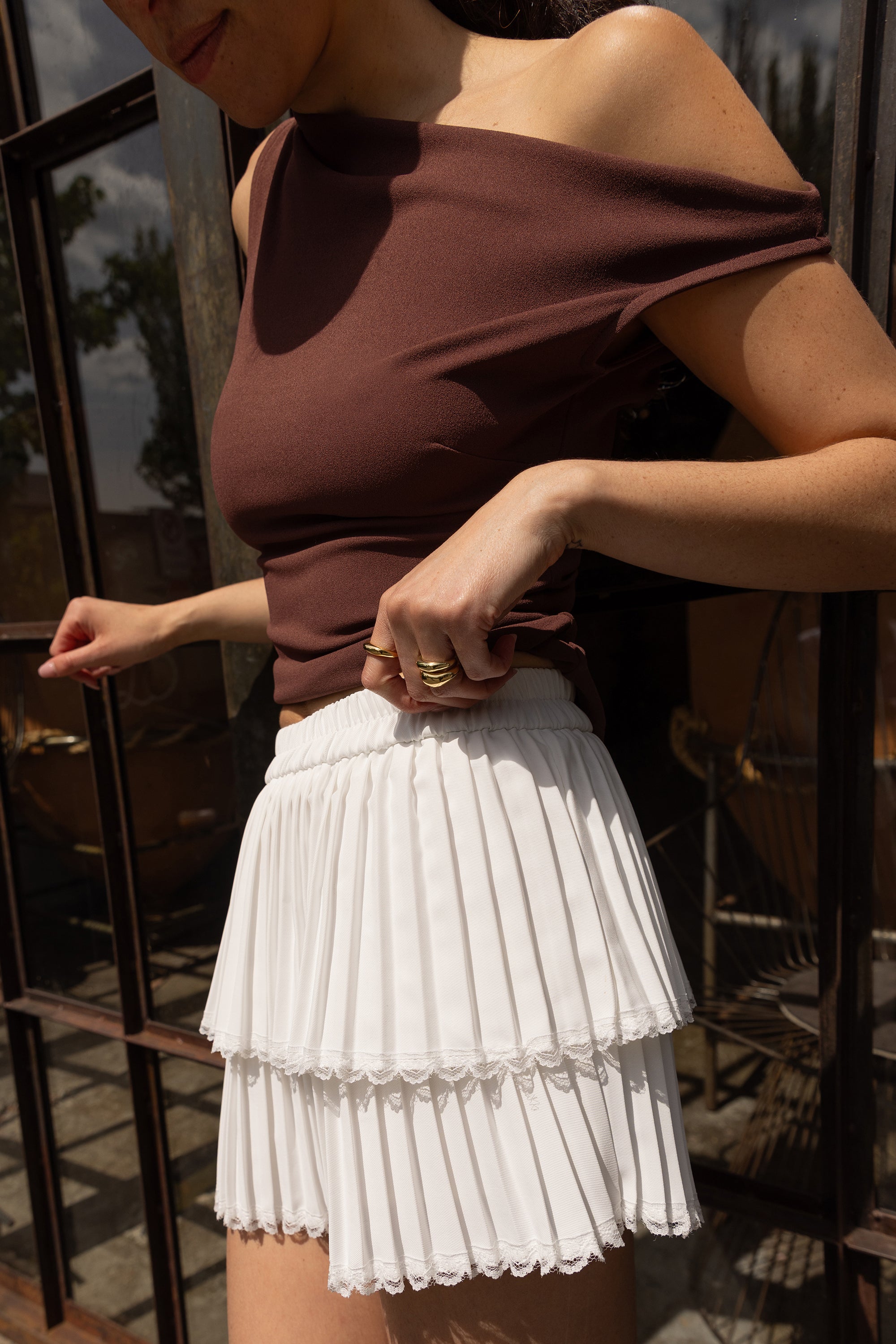 Designed for easy styling and all-day comfort. Featuring pleats and layered tiers, this skort gives the look of a skirt with the hidden confidence of built-in shorts. The elasticated waistband ensures a snug, flexible fit. Pair yours with a cropped tank, or oversized tee.
