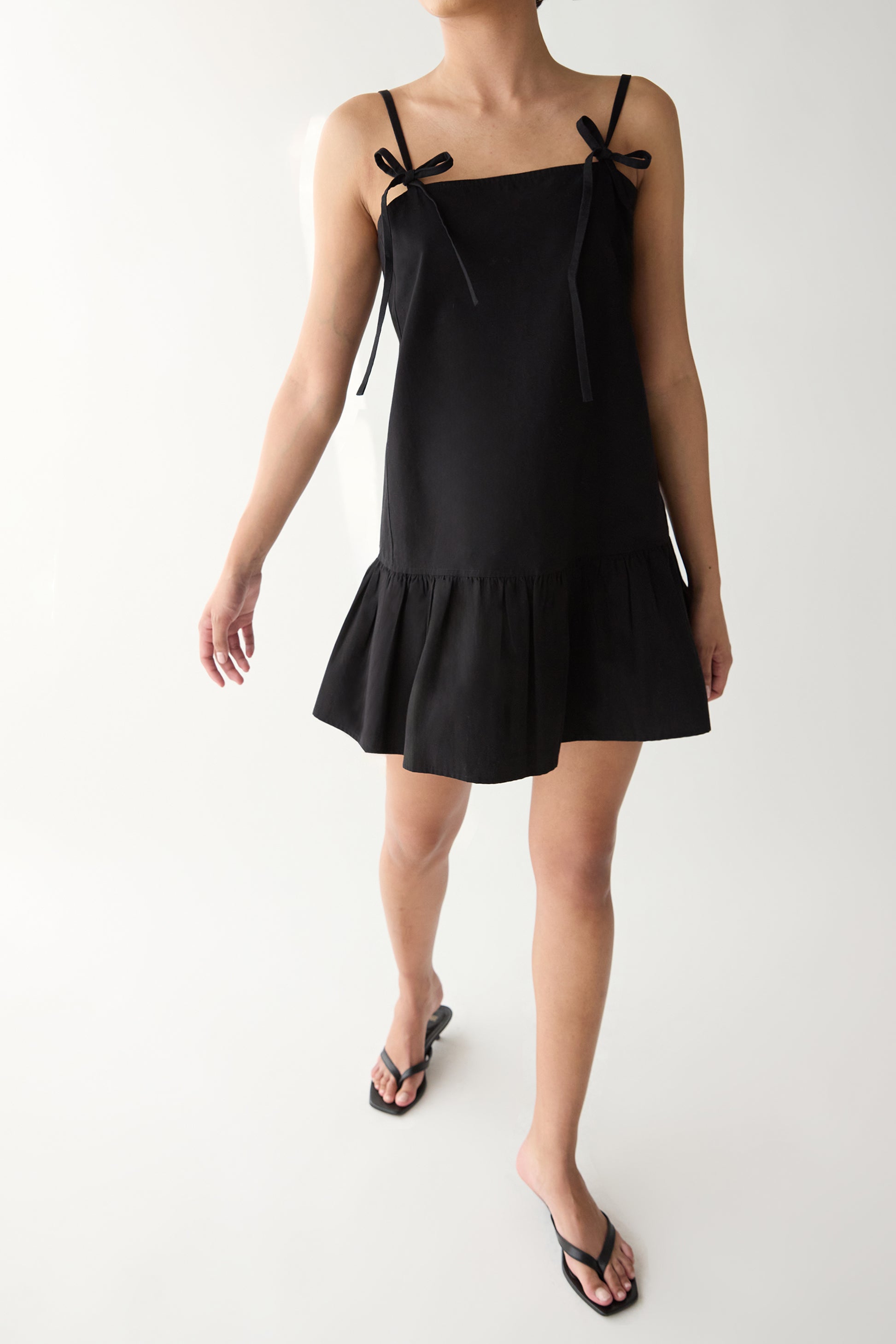 Cotton poplin. Square neckline. Bow details. Adjustable shoulder straps. Tiered hem.