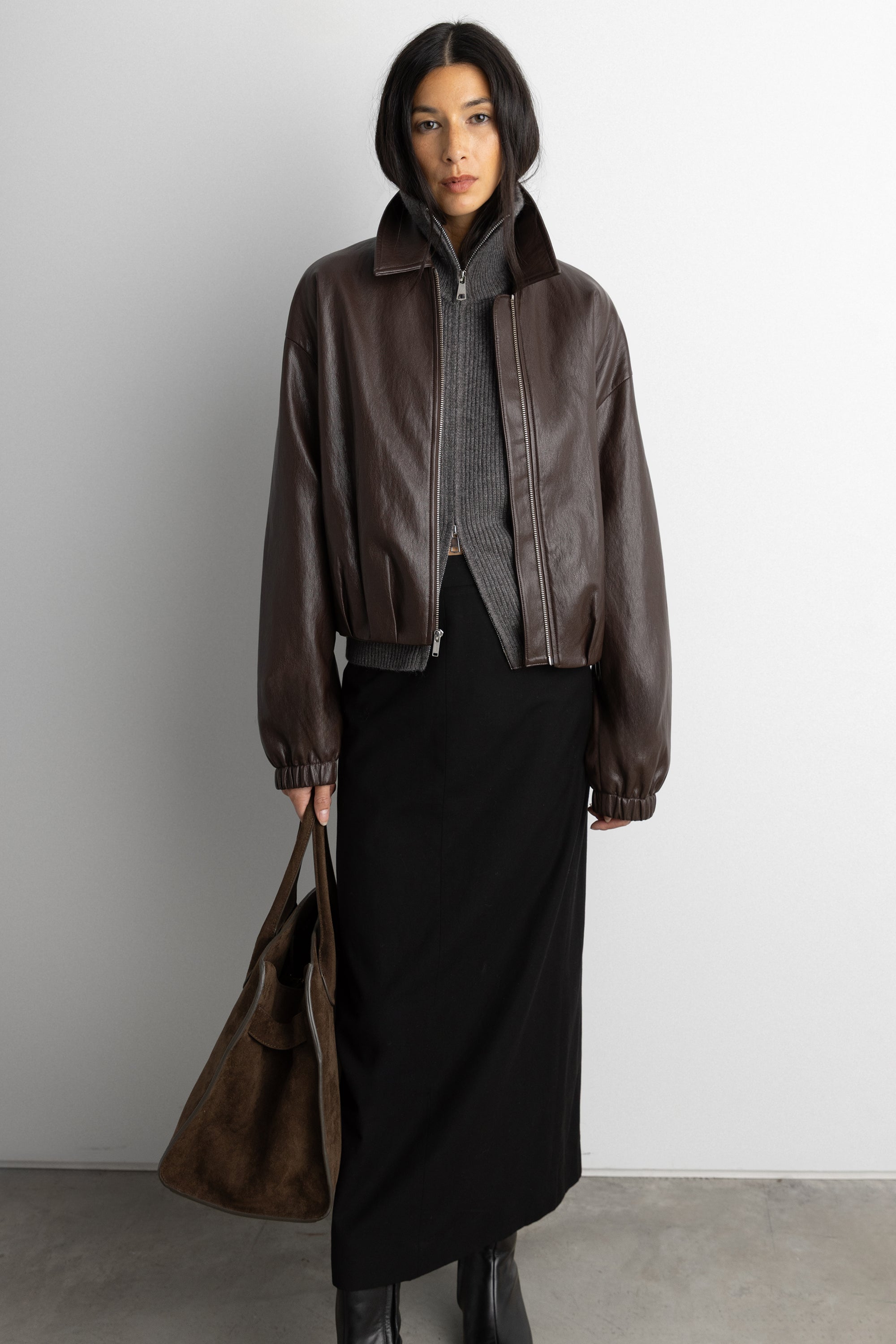 Vegan leather. Collared neckline. Zipper front. Elasticated cuffs. Front box pleats. Back diagonal folds. Lined.