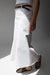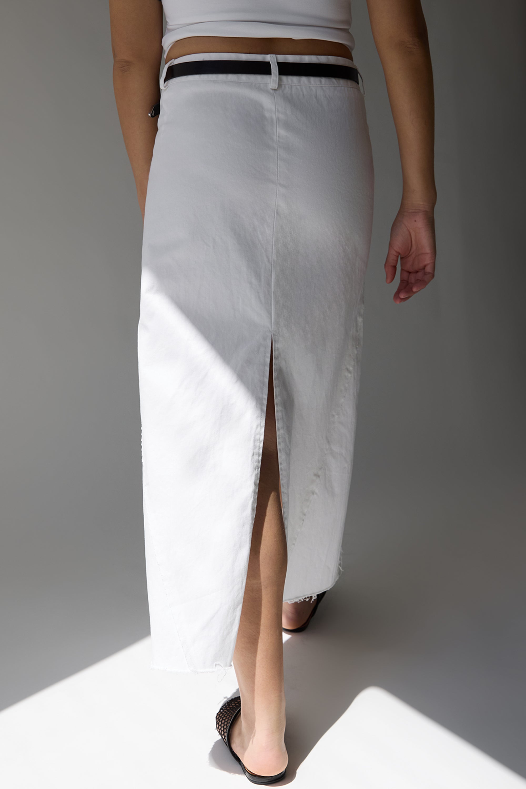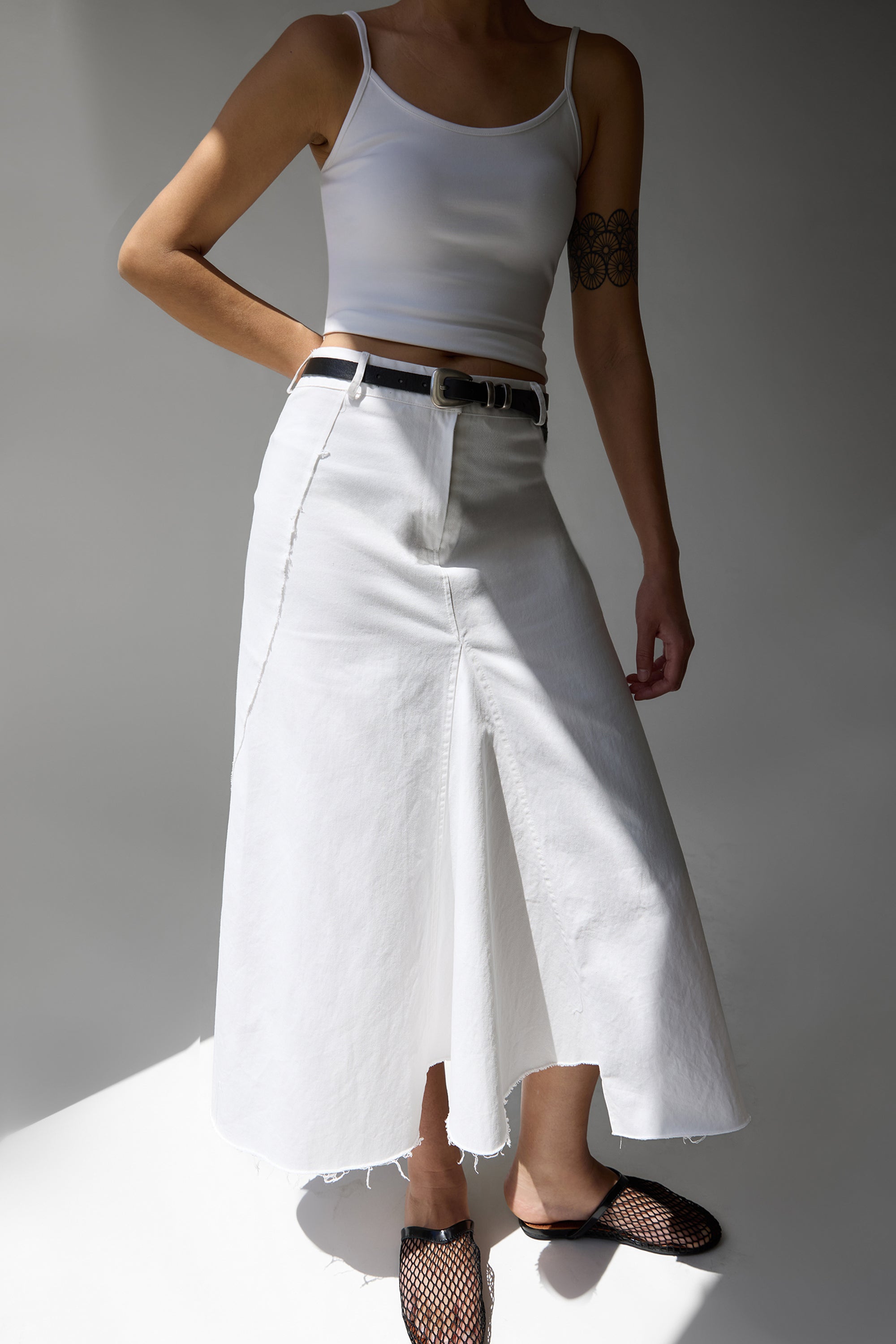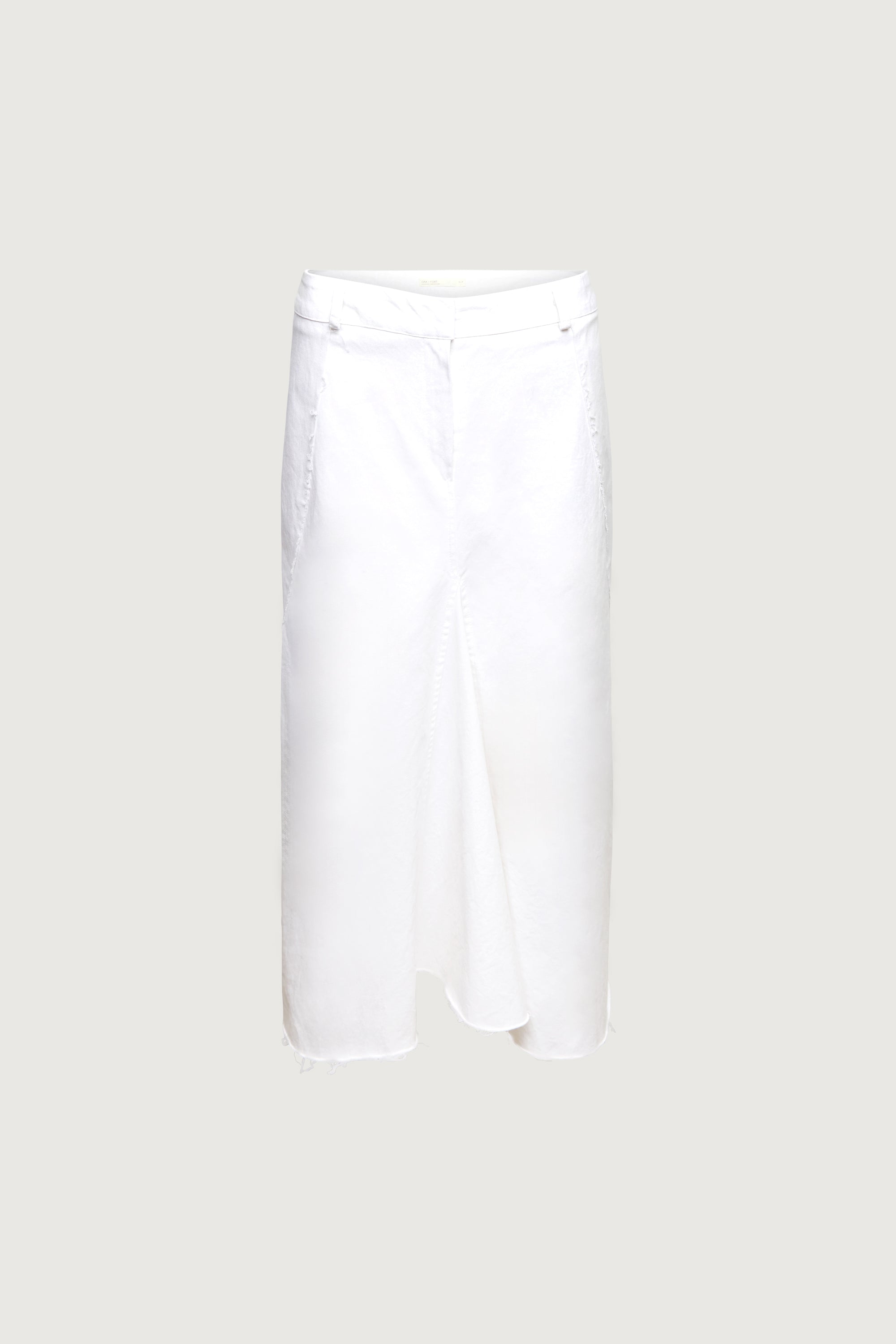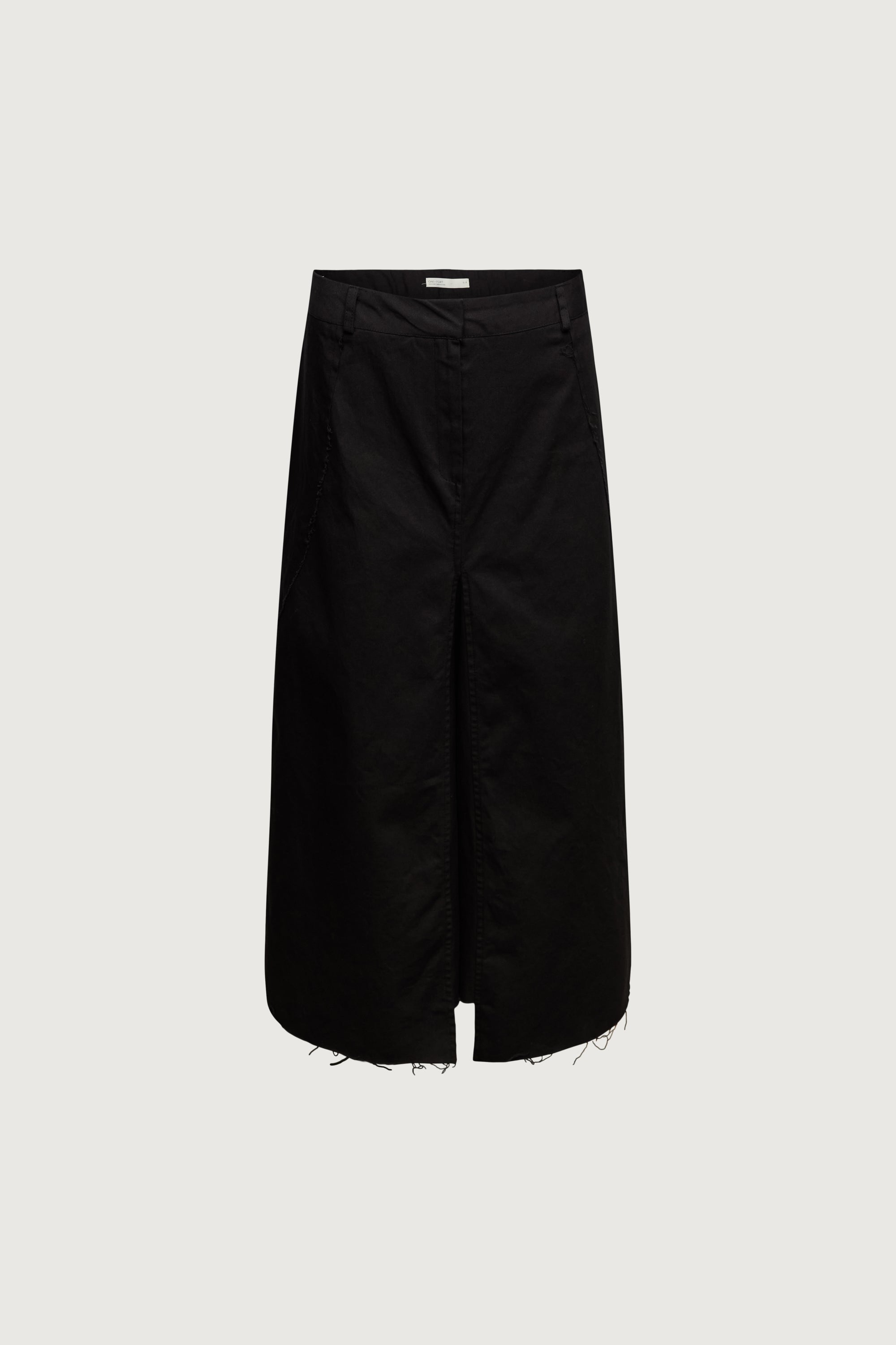This midi skirt features a raw hem and vent detailing created from excess fabric for a modern, unfinished look. Designed with functional belt loops, a zip fly, and subtle side panel accents, it offers a structured yet relaxed silhouette. A versatile piece that adds edge to everyday styling.