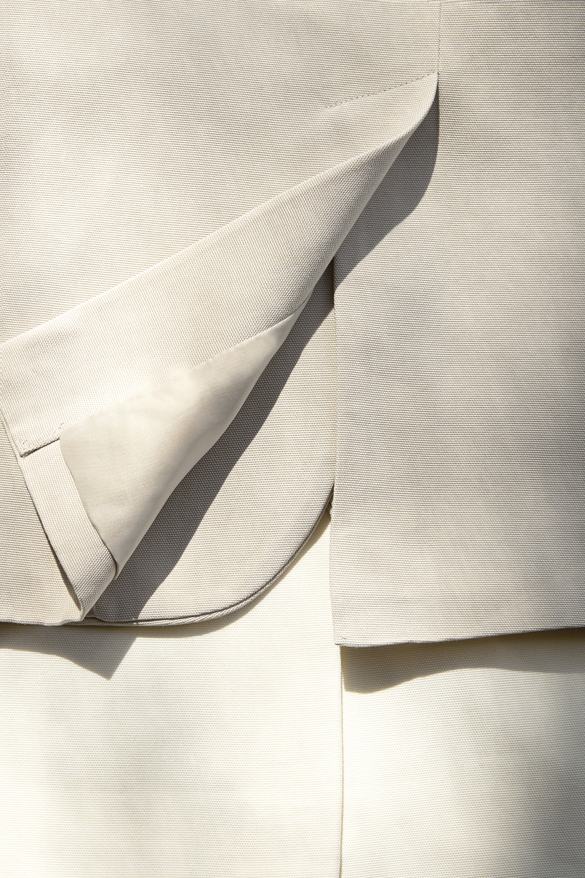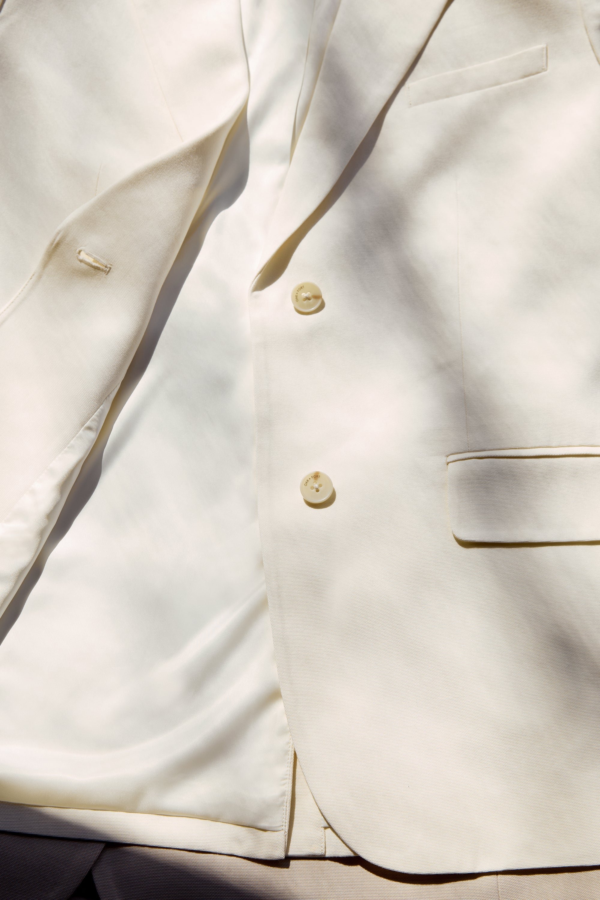 Sustainable fabric. Notched lapels. Single button closures. Padded shoulders. Front flap pockets. Back vent. Functional sleeve buttons.