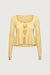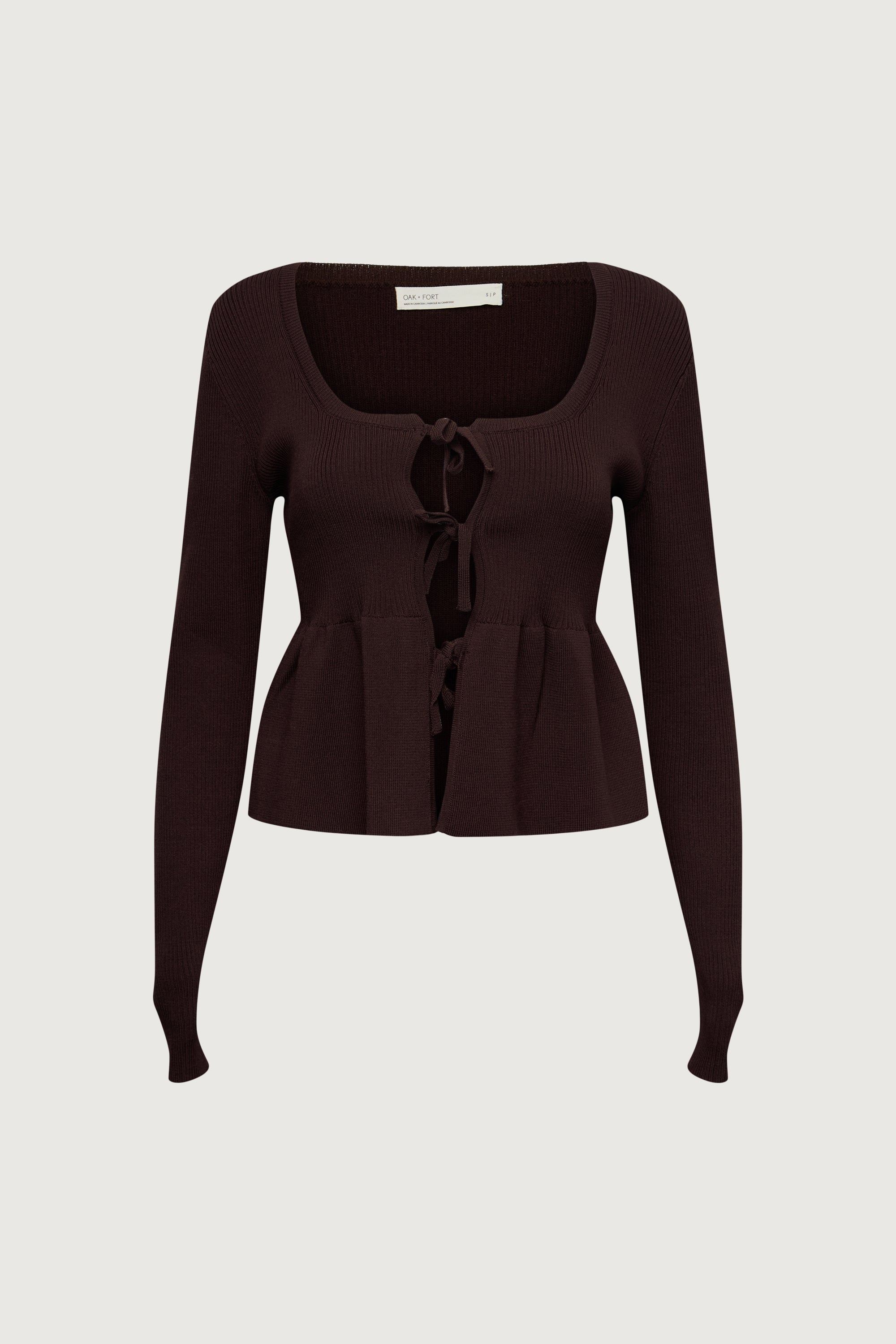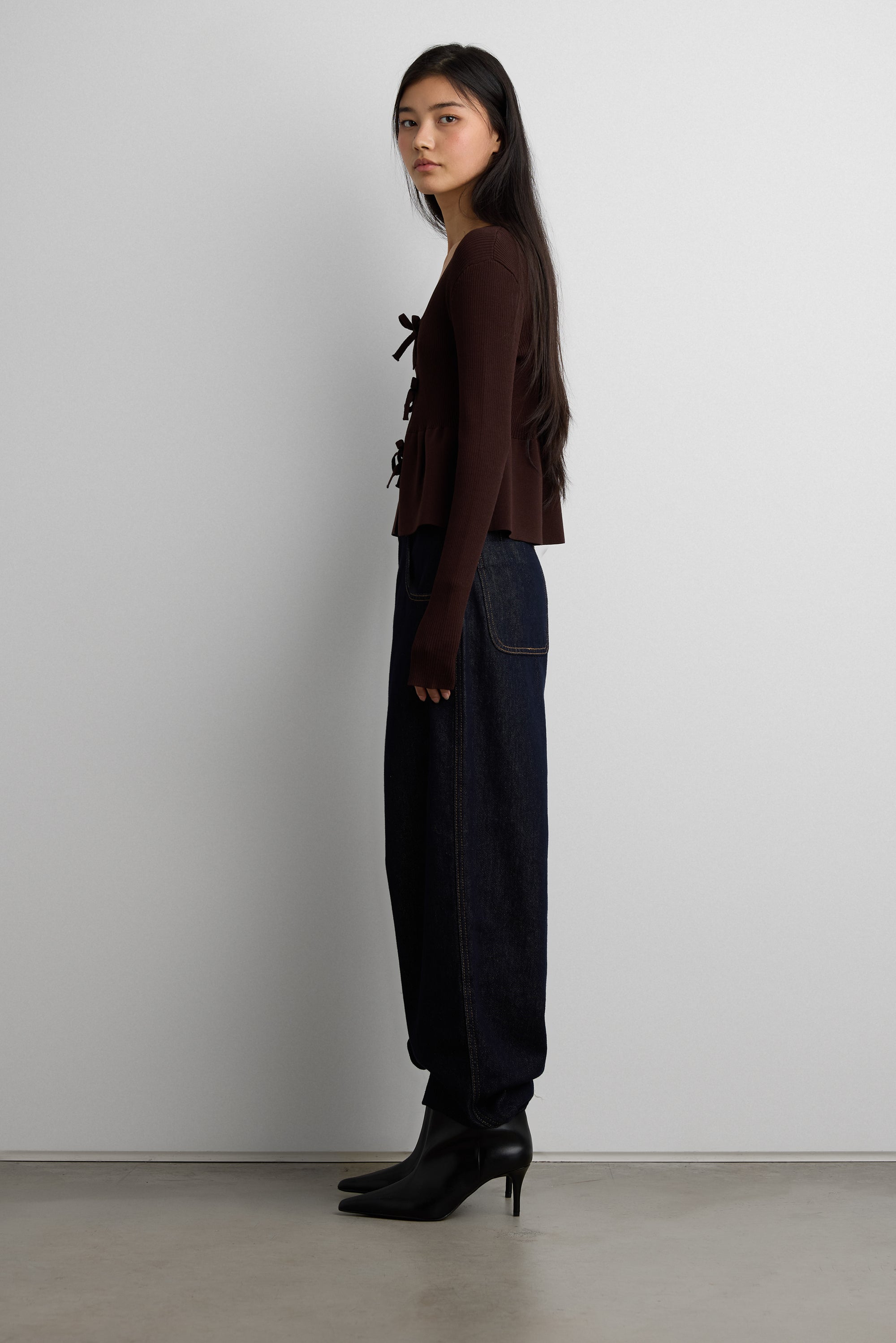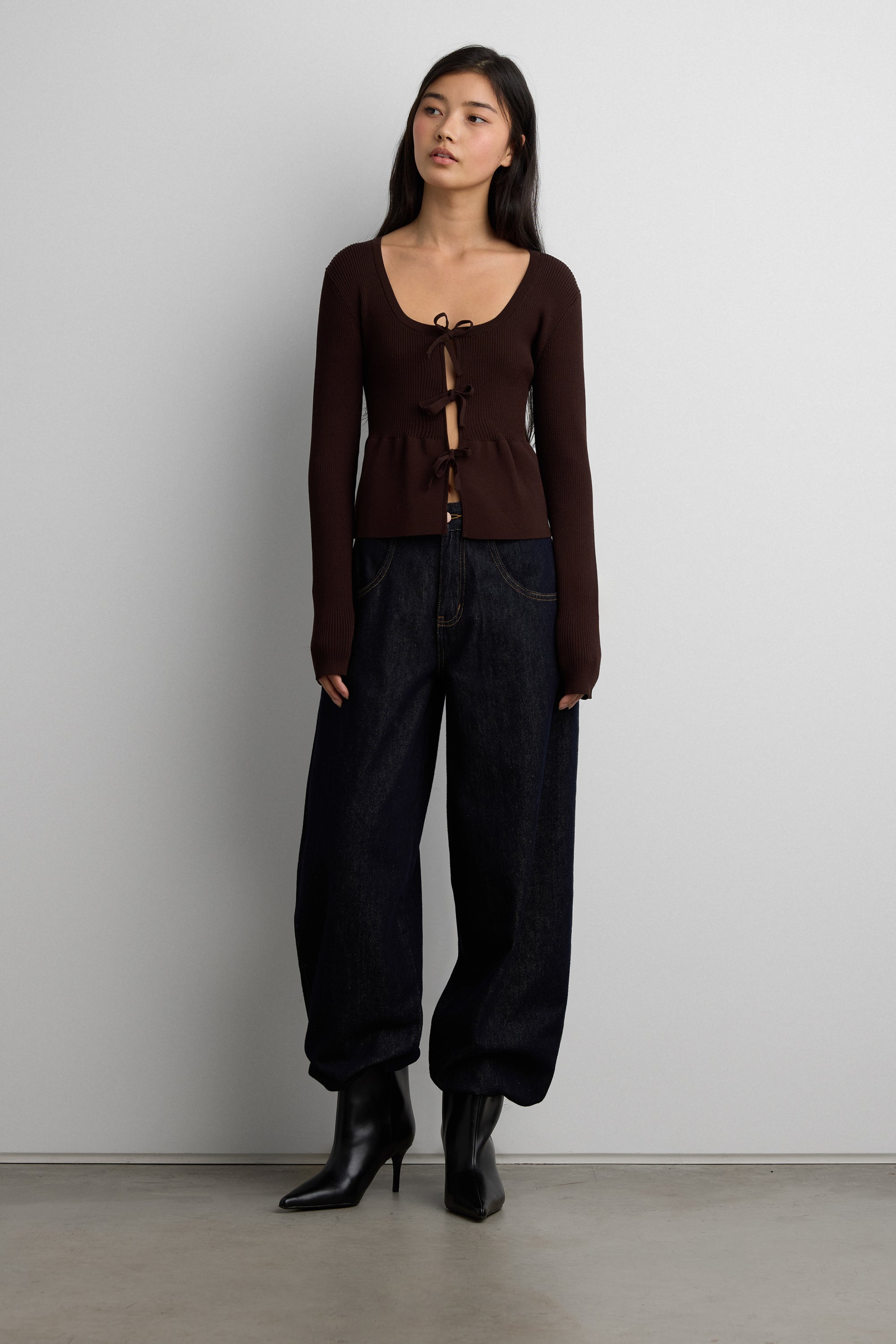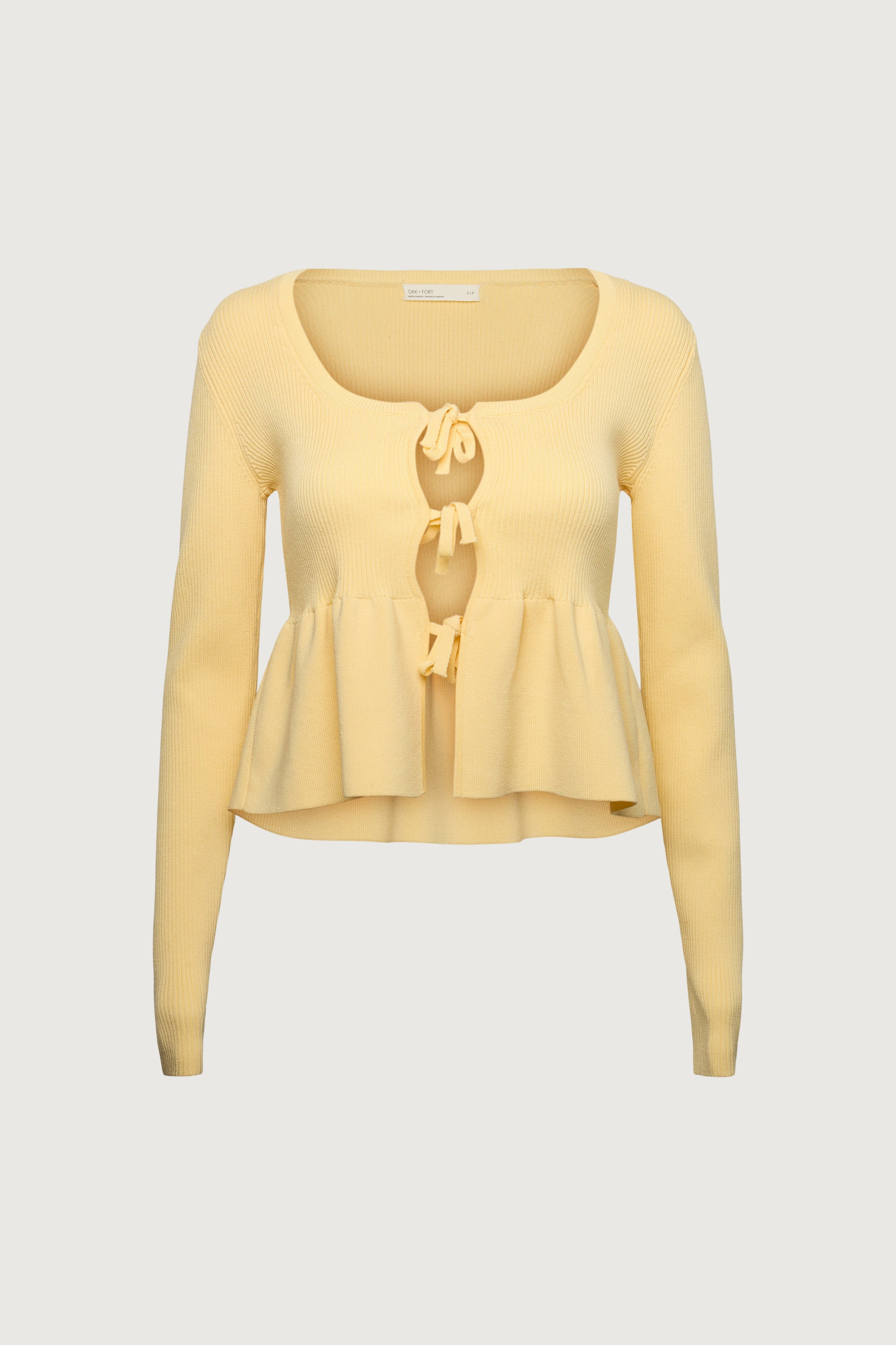 This peplum sweater is made from a flattering ribbed stretch-knit fabric in a slim fit. It has a scooped neckline and open front design with bow ties.