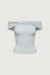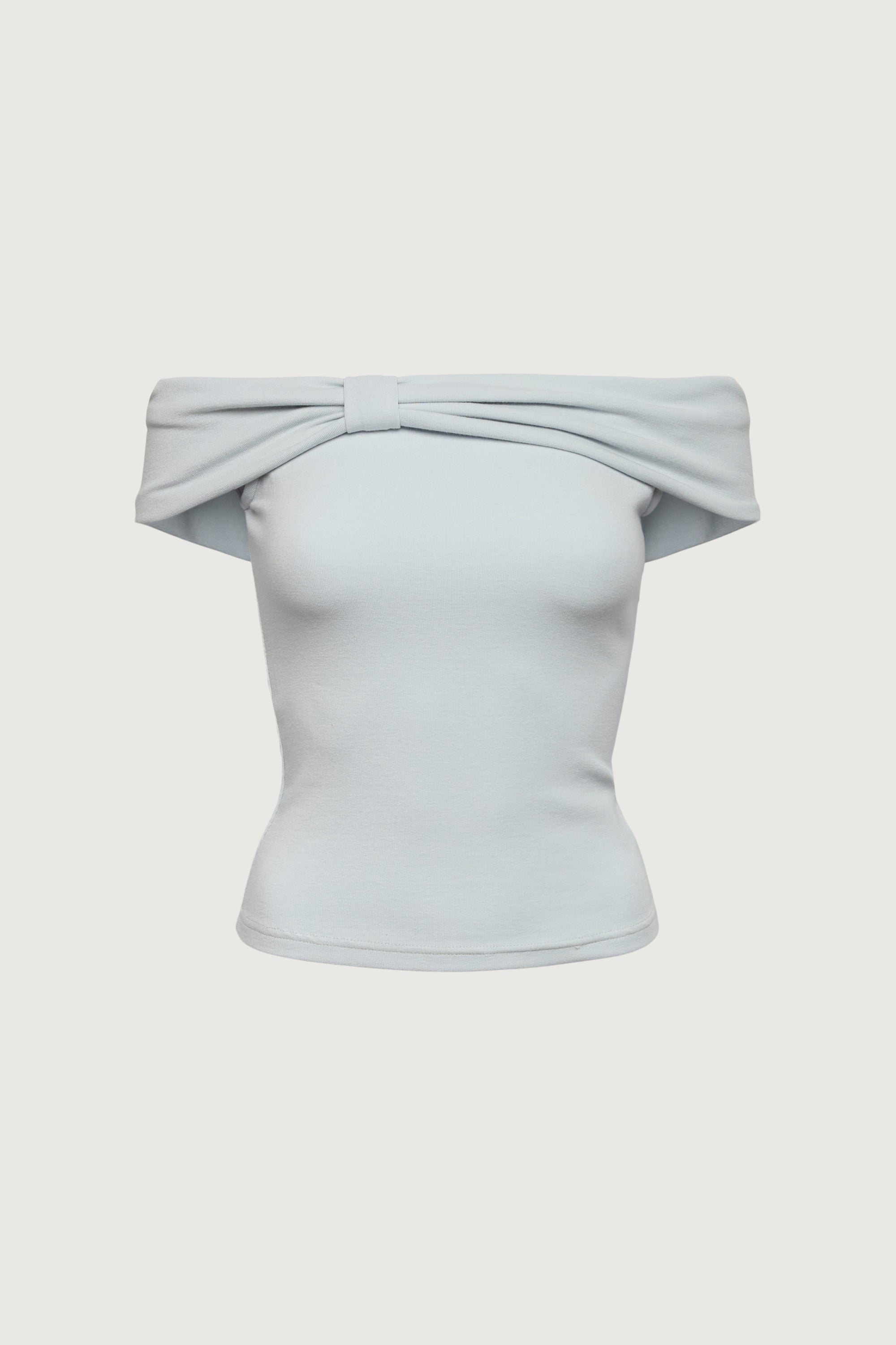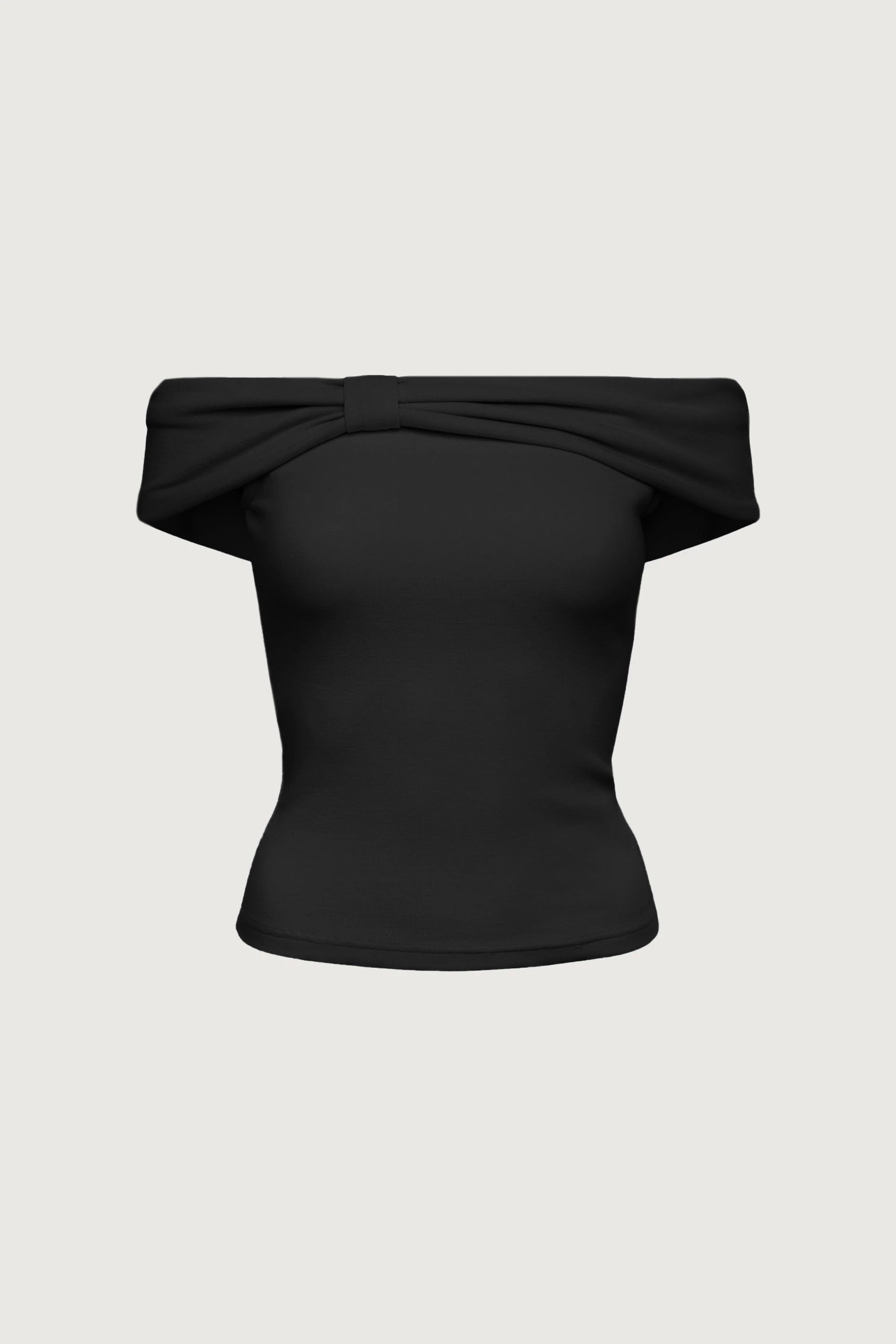 This off the shoulder top has a bow detail within the fold over fabric. Wear this blouse with a breezy skirt this season.