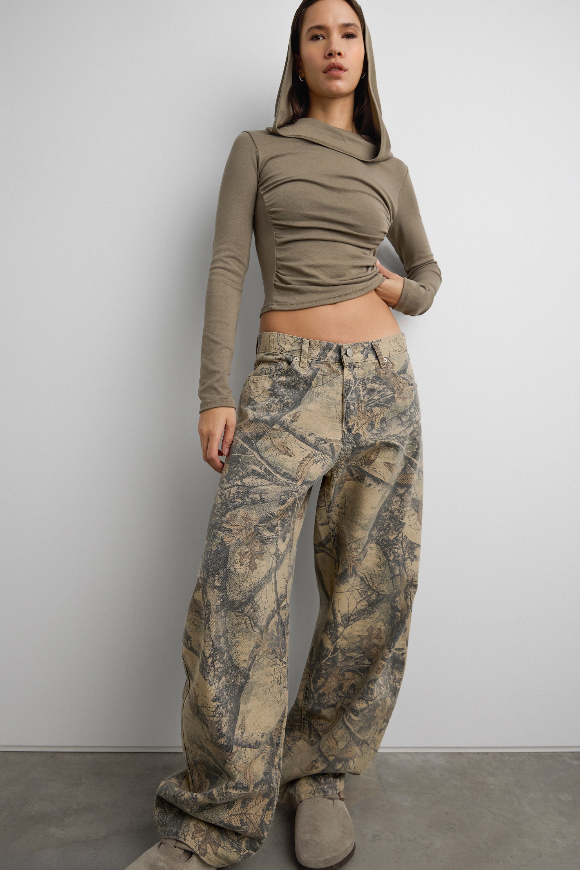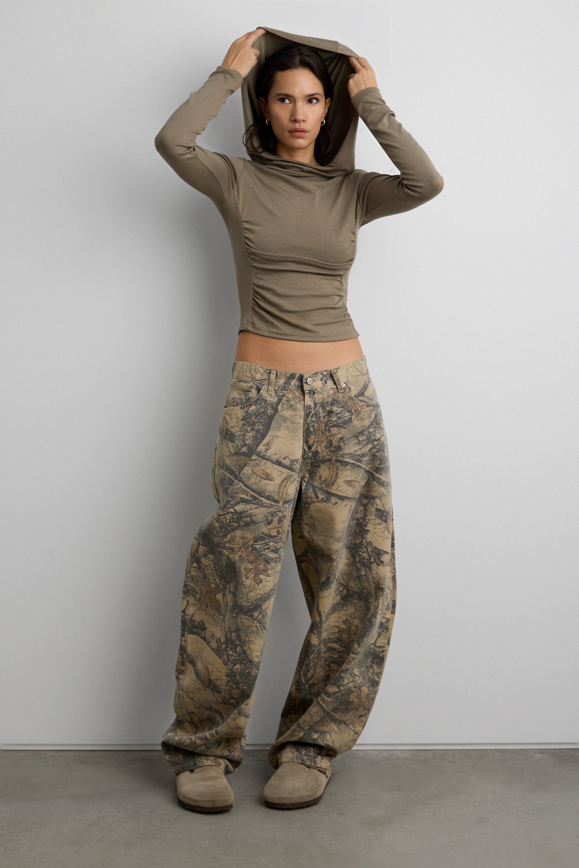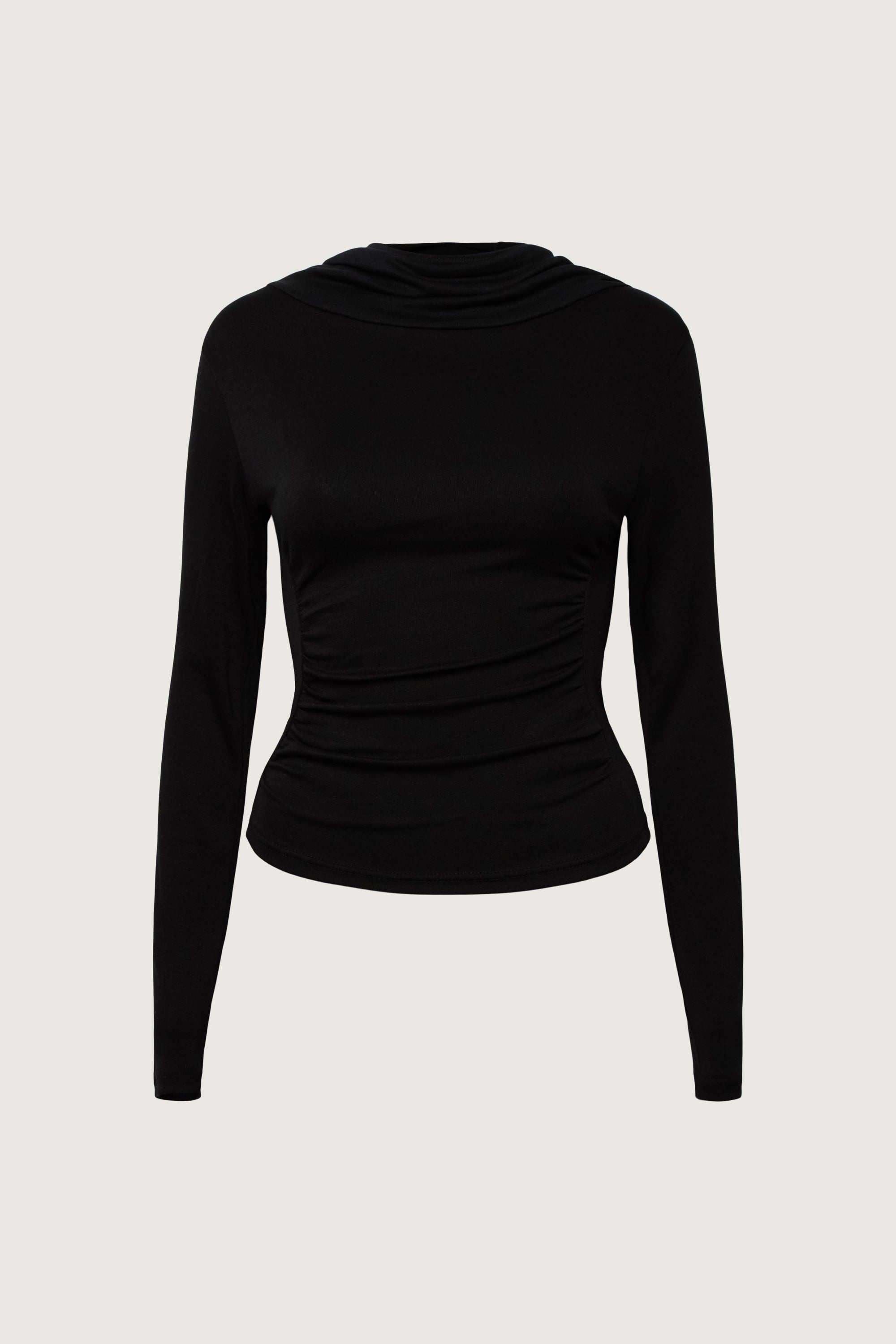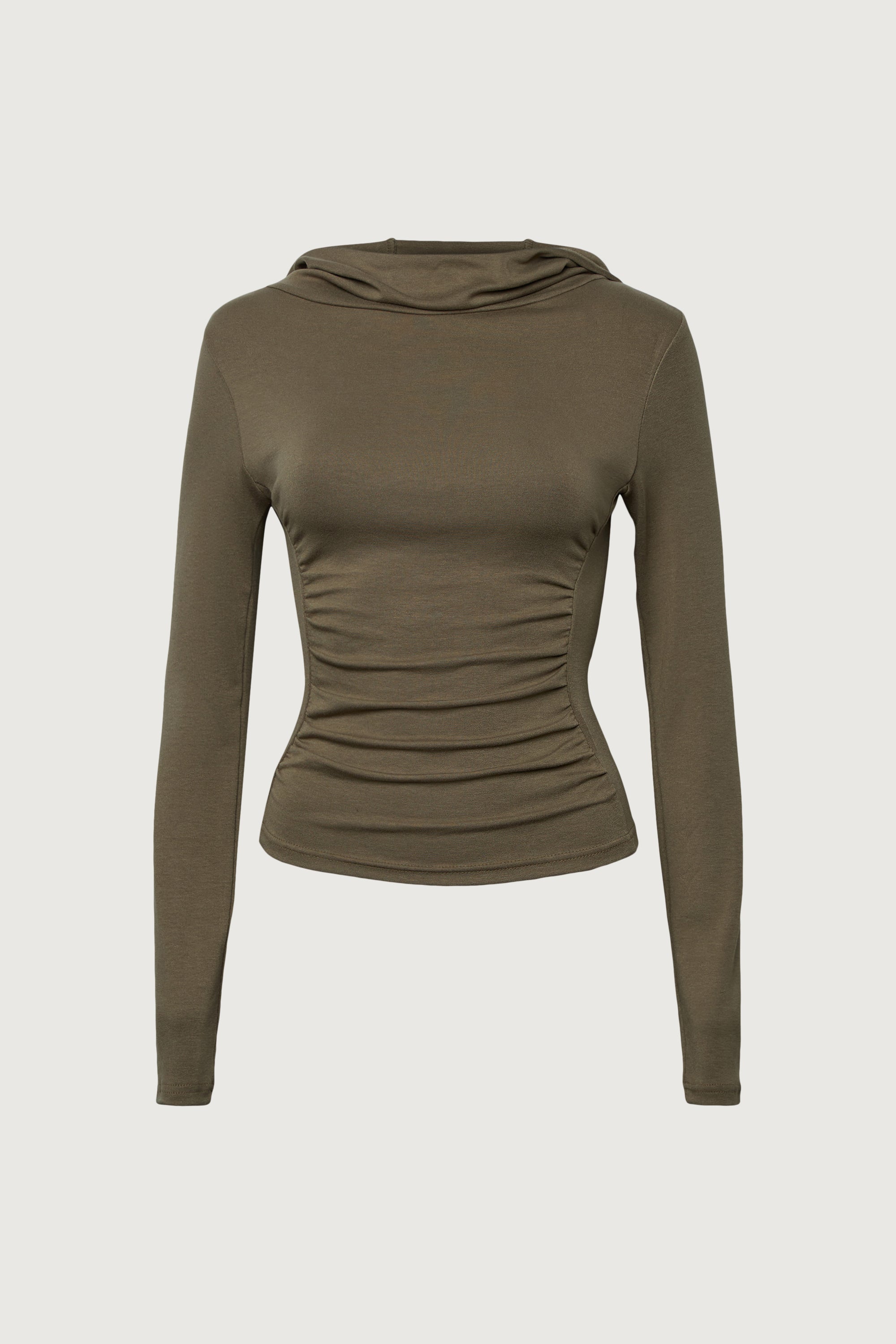 This long sleeve hoodie features a soft draped cowl neckline and ruched detailing along the sides for a flattering, gathered silhouette. Designed with a slightly cropped length, it blends relaxed comfort with modern structure for an elevated everyday look.