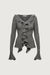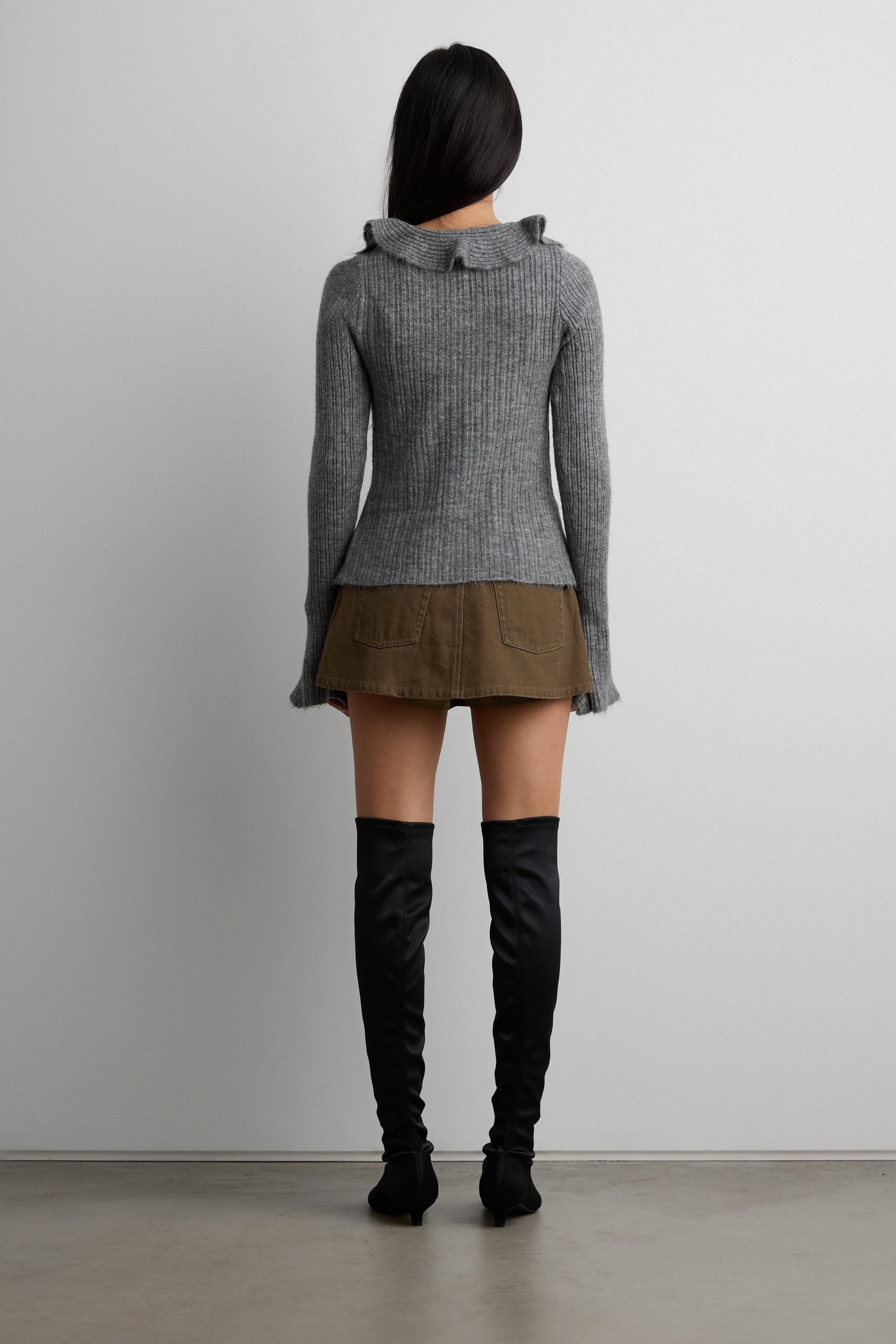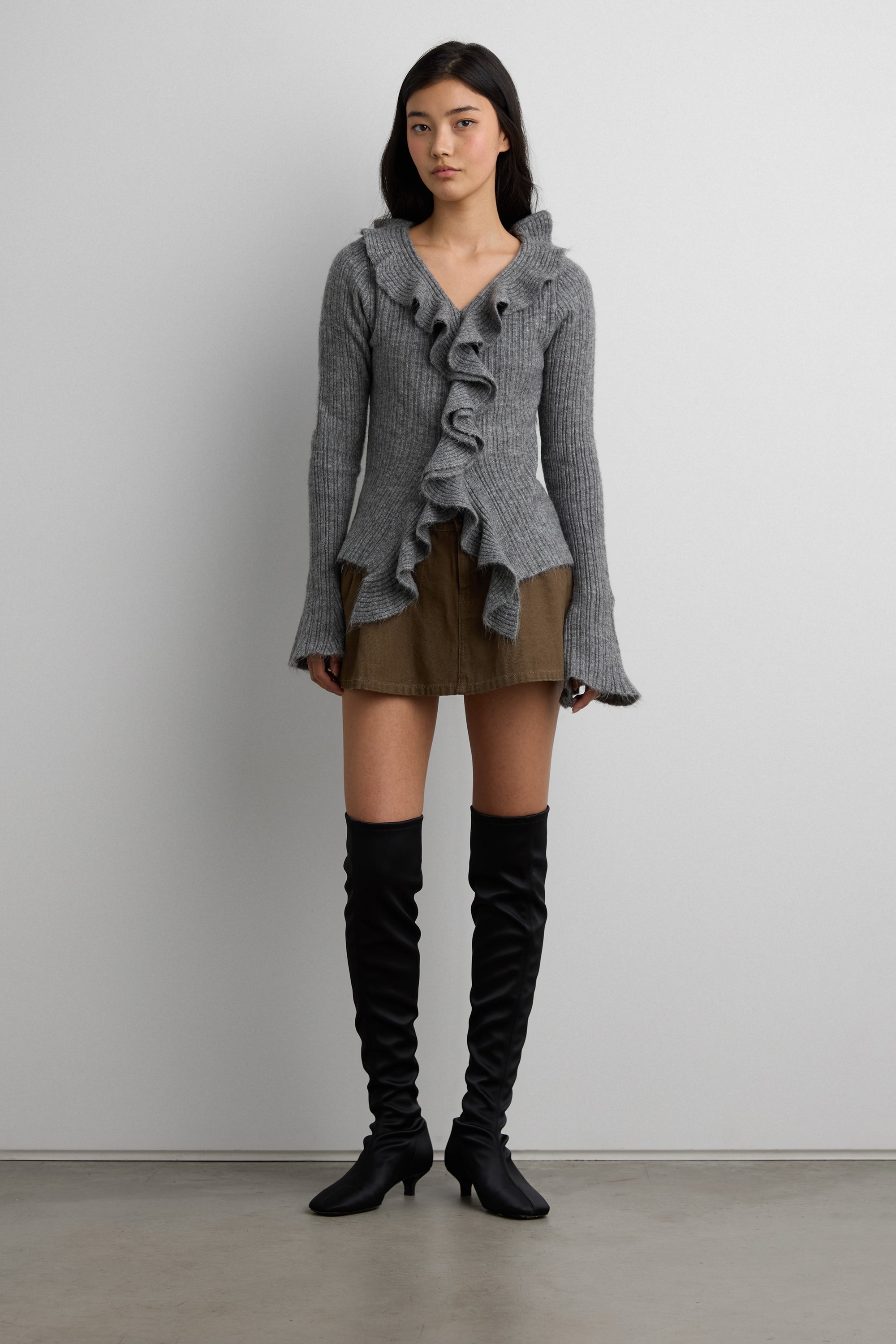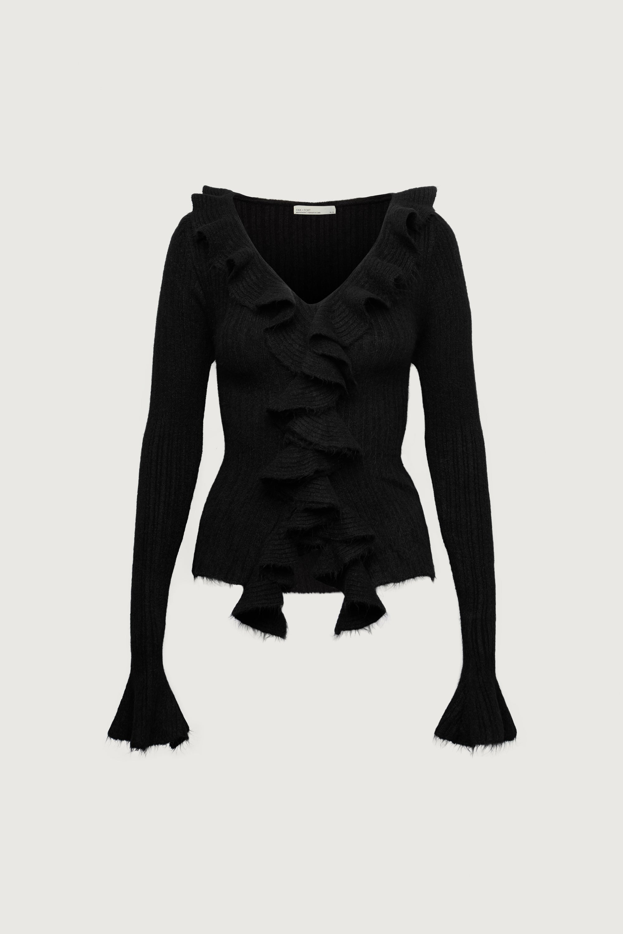 A ribbed knit sweater featuring soft ruffle detailing along the neckline and front. Designed with a deep V-neck and flared sleeves for a feminine silhouette. Crafted from a stretch blend that offers comfort and texture, it’s a statement knit that transitions effortlessly from day to night.