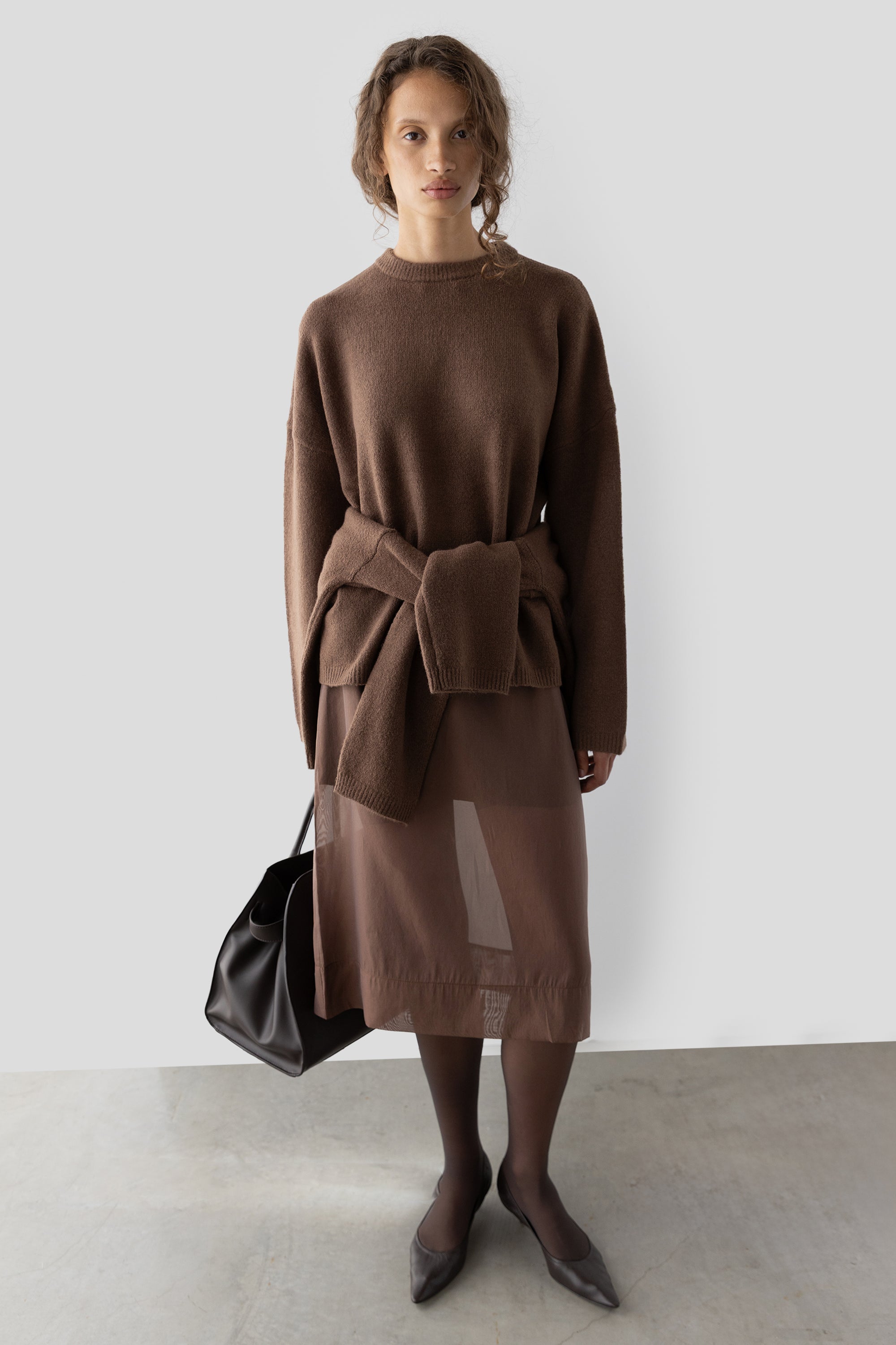 Classic pencil skirt silhouette. Sheer, lightweight organza fabric. Subtle sheen. Internal layer. Rear zipper.
